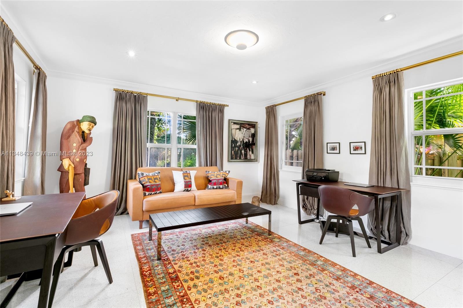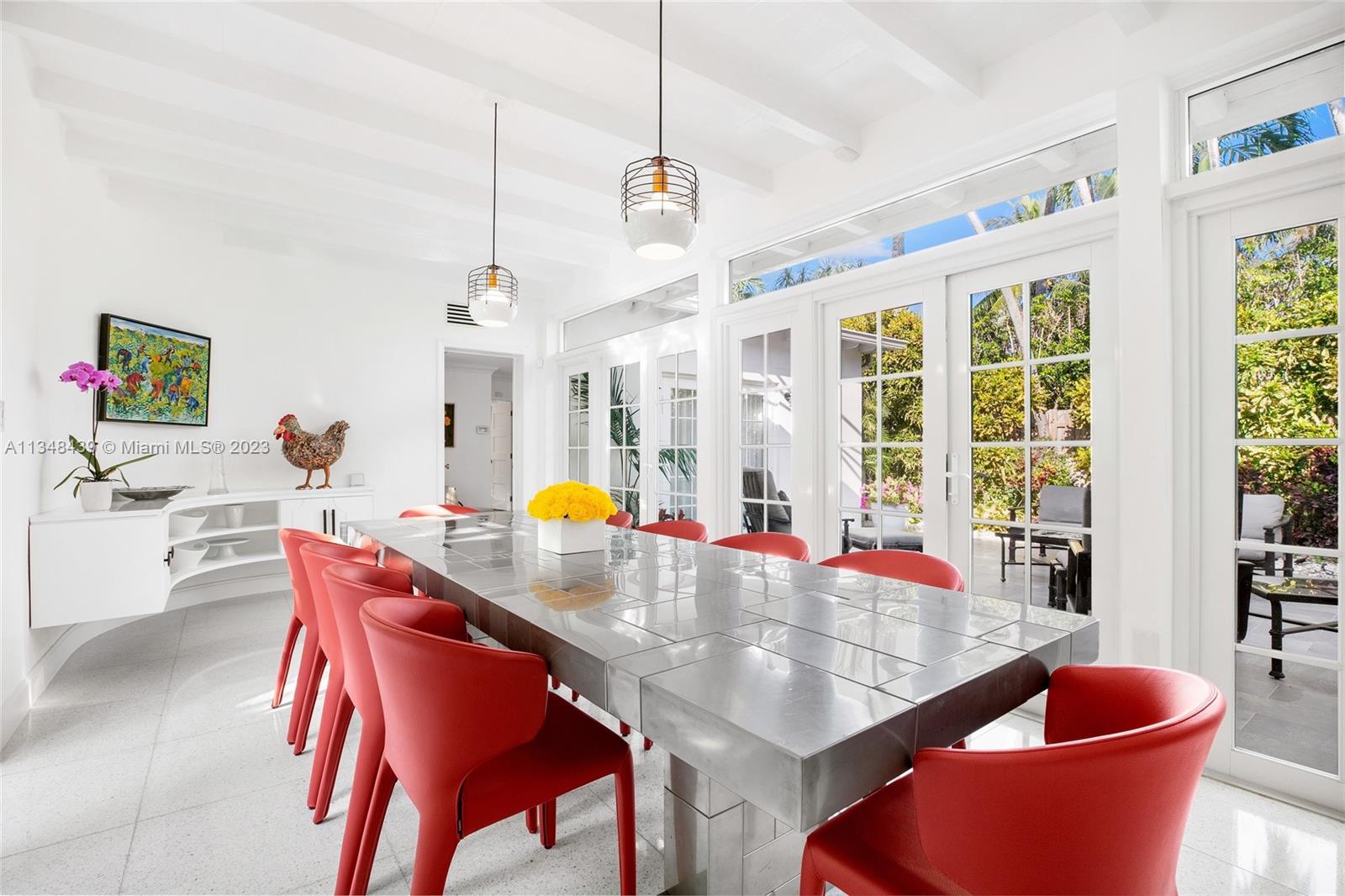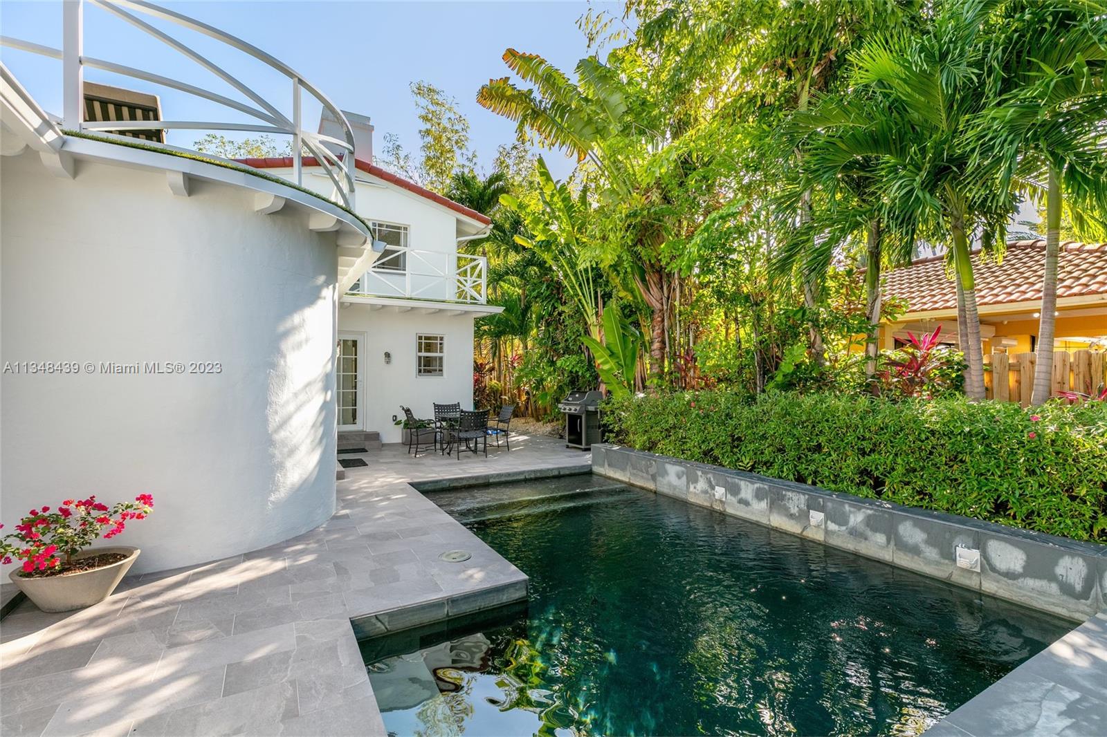 Tucked behind lush landscaping, this fully renovated Miami Beach Bungalow exudes charm & features vaulted ceilings, immaculate terrazzo floors, custom built-ins and abundant natural light through high impact floor-to-ceiling windows. A Gourmet kitchen has a Viking gas range stove & stunning white cabinetry. The home features Updated electric and plumbing as well as a brand new Roof. The ground floor primary suite has a large walk-in closet & spa-like bathroom w/ intricate tiles, free-standing tub & dual sinks. Enjoy a salt water pool & open patio which features French doors that lead into the dining room & access to the primary suite. 2 Car driveway w/ electric for charging. Walking distance to the trendiest shops, restaurants, Trader Joes, Fresh Market & fitness studios in Sunset Harbour.