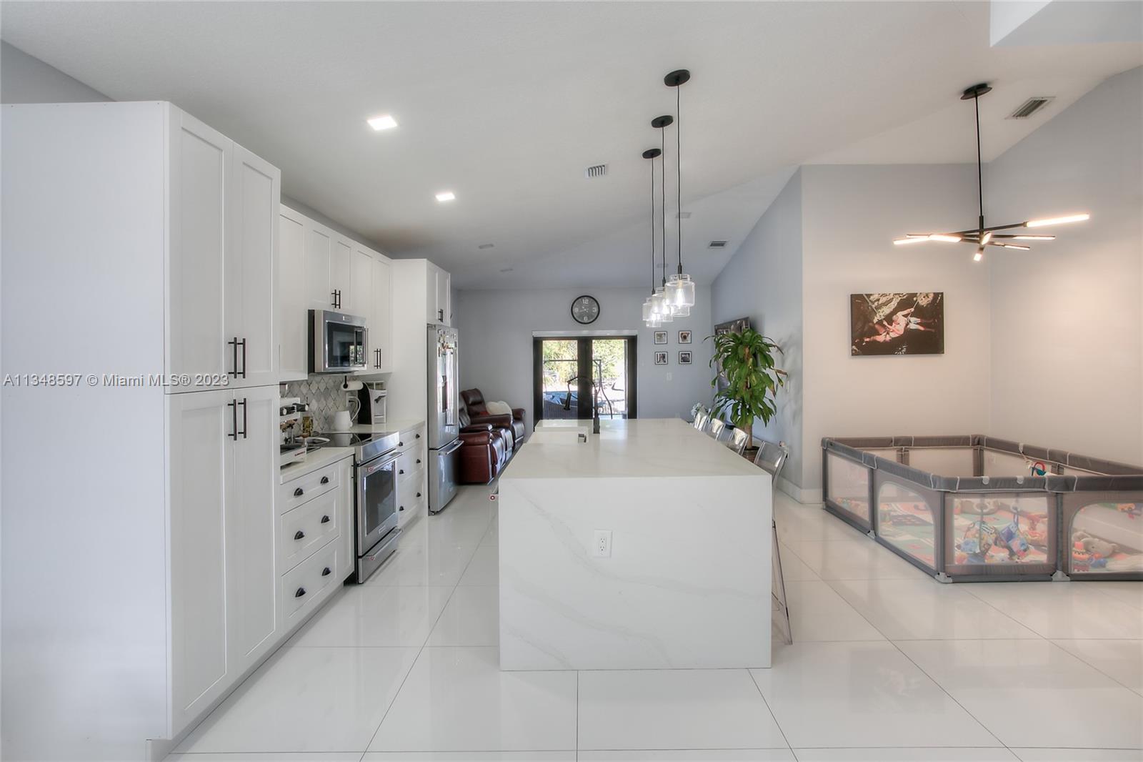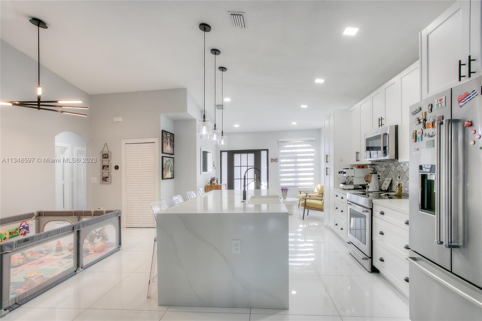 Welcome to this beautiful fully remodeled and turnkey home in a highly sought-after location in the 33015 zip-code. Spacious 3 bedrooms and 2 full bathrooms plus a garage. NO HOA and low taxes!!! All the new upgrades include; circular driveway and palm tree landscaping. Impact doors and windows all around. New 6ft aluminum fence installed, all new gutters, new porcelain flooring, updated bathrooms and brand new modern/open concept kitchen with island and all new appliances. Recess lighting all throughout the house, and window zebra shades. Insulated aluminum patio roof with paver flooring. Insulated garage door with mini split in garage & more! No neighbors in front or back with water views.