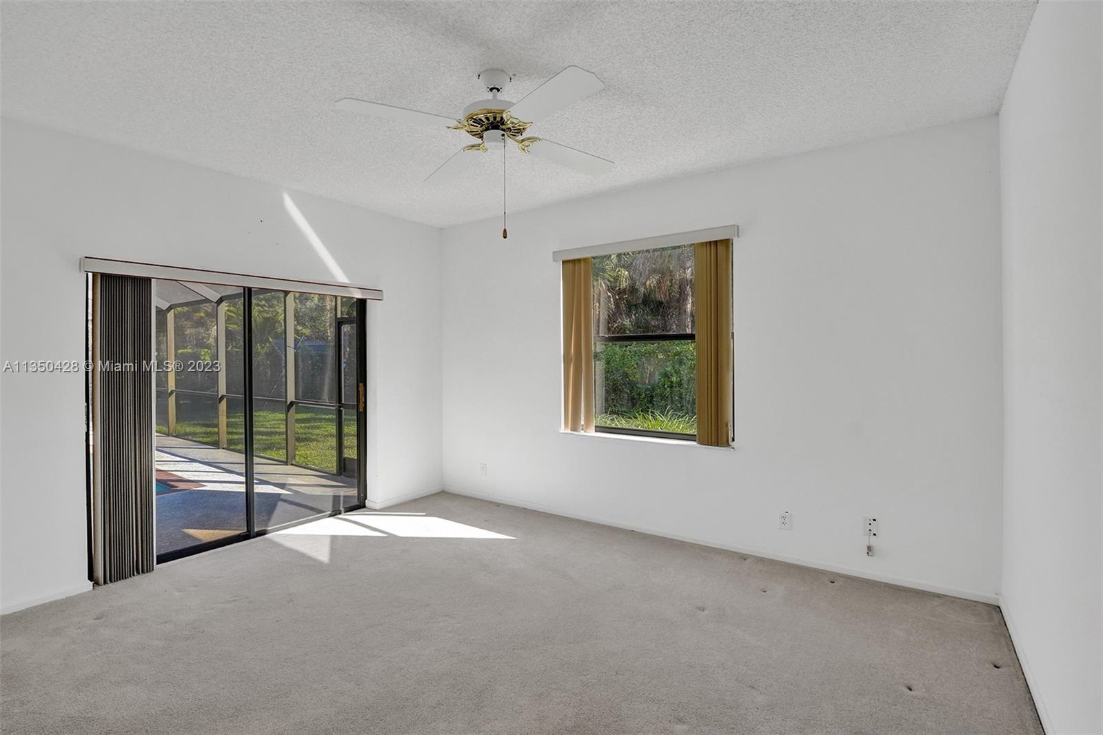 Prestigious CARRIAGE POINTE ESTATE home with 4 bedrooms & 2 bathrooms w/ lovely screened in patio and pool in 24 HOUR GUARD GATED COMMUNITY. Expansive primary suite w/ 2 closets. This already spacious home feels even larger with its vaulted ceilings. Sits on a cul de sac with minimal car activity. Kitchen has solid wood cabinets and granite counter tops w/ tranquil view of pool and backyard. Across from the kitchen is a flex room for family, kids playroom, etc. Both bathrooms have dual sinks. Large windows let in tons of natural light. METAL ROOF that looks like clay tile. AC is 2021. Brand NEW CARPET in 3 rooms. Enjoy pure backyard privacy as the lot backs to Sandy Ridge Preserve. This home was well cared for and clean as a whistle and ready for you to make it your own.