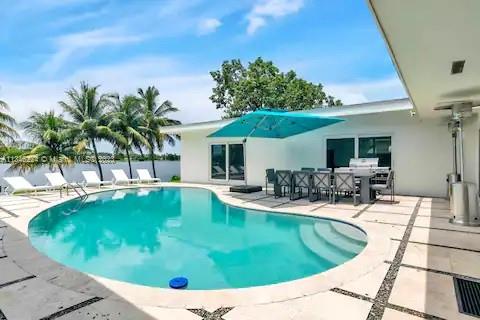 Gorgeous completely renovated Mid-Century Modern Designed Home 5 BR 3 Bath with Heated Pool, Cabana and Lake front view. All Renovations were completed with Permits. Relax outside at the kidney shaped pool, enjoying the lake view, under the large umbrella awning with seating for 10. Spacious kitchen with Quartz Island and Italian style cabinets and waterfall counter tops. Master Bedroom with en-suite spacious bathroom with soaking tub. Built in closets thru-out the home. Impact windows and doors. Brand new sprinkler system. Great quite neighborhood. Great short term rental with City permits and proven income. Sold completely furnished. Minutes to Aventura Mall, Shopping, Fine Dining, A+ Schools and Houses of Worship. A must see!