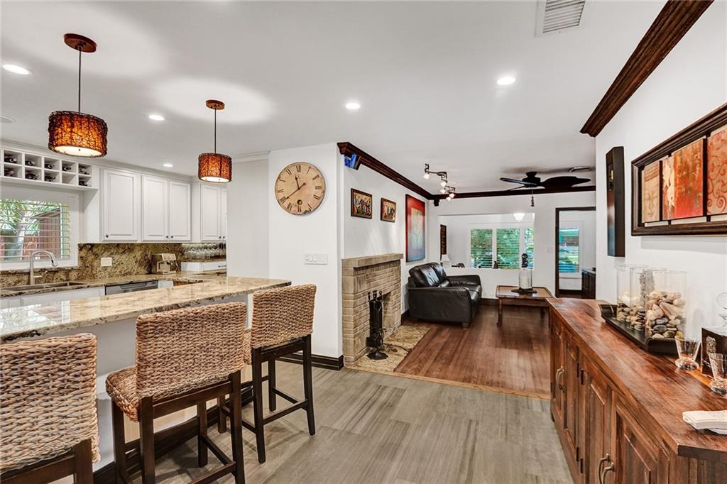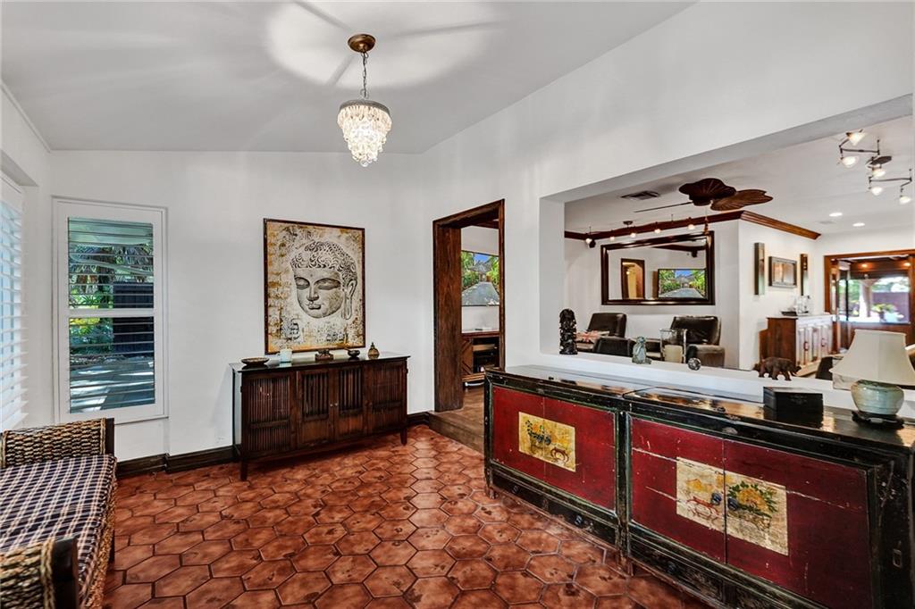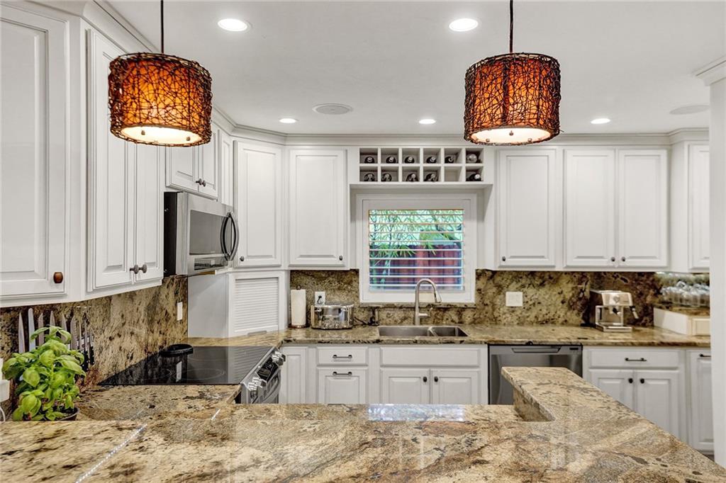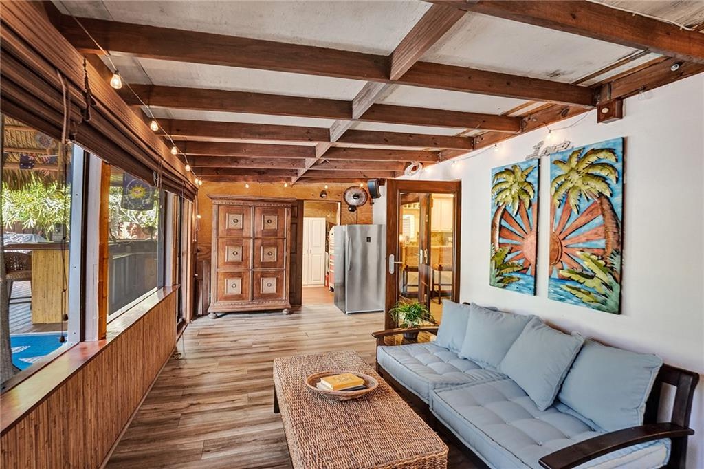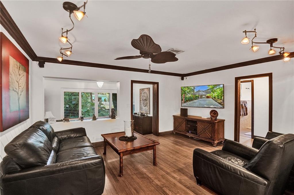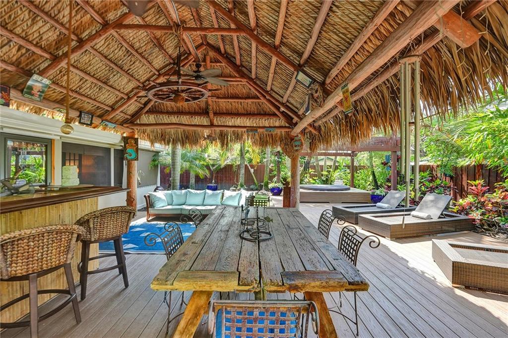 This gorgeous & meticulously maintained home in highly desirable Shady Banks neighborhood is surrounded by a tropical paradise & mature oak trees. Custom Kitchen, Granite Counters w/ Breakfast Bar, Updated bathroom features a rain shower & handheld shower, copper sink, imported shell stone tile & countertop w/ teak vanity. Solid oak doors w/ antique hardware reclaimed vintage hardwood floors, plantation shutters, “smart light switches/outlets”, walk-in closets, interior & garden sound system, impact windows. Exterior w/ desirable living space for entertaining, large tiki hut, full size bar w/ ice machine & 2 fridges, ceiling fans & sink, large composite deck w/oversized hot tub. Minutes to Downtown Las Olas, the Beach, 2 Parks w/Tennis Volleyball Fitness Equip& Riverfront Nature Preserve