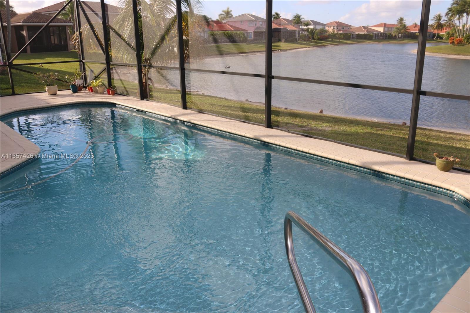 Breath taking LAKE views from the moment you step in this beautiful UPDATED one-story POOL home on a CUL DE SAC: 4 bedroom (3 bedrooms+Huge Den) 2.5 bathrooms. Enjoy the wide lake view sitting in the ENCLOSURE pool patio. HIGH ceilings, fully updated kitchen and bathrooms with granite counter tops and S.S. appliances. Beautiful tile all throughout the house. Huge master bedroom with his and hers walk-in closets, master bath with tub, shower, and double vanity. The house is fully protected with hurricane graded openings. 2 car garage and paved driveway that fits 4 cars. New roof 2020. Excellent schools! Community offers club house, two pools, tennis, and basketball courts. Pets are welcome.