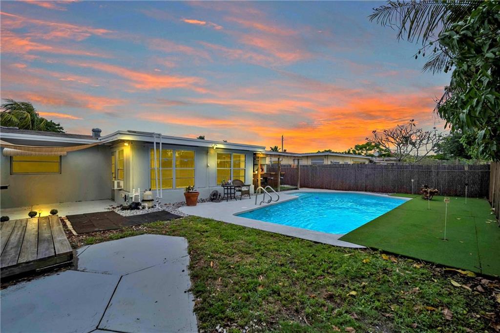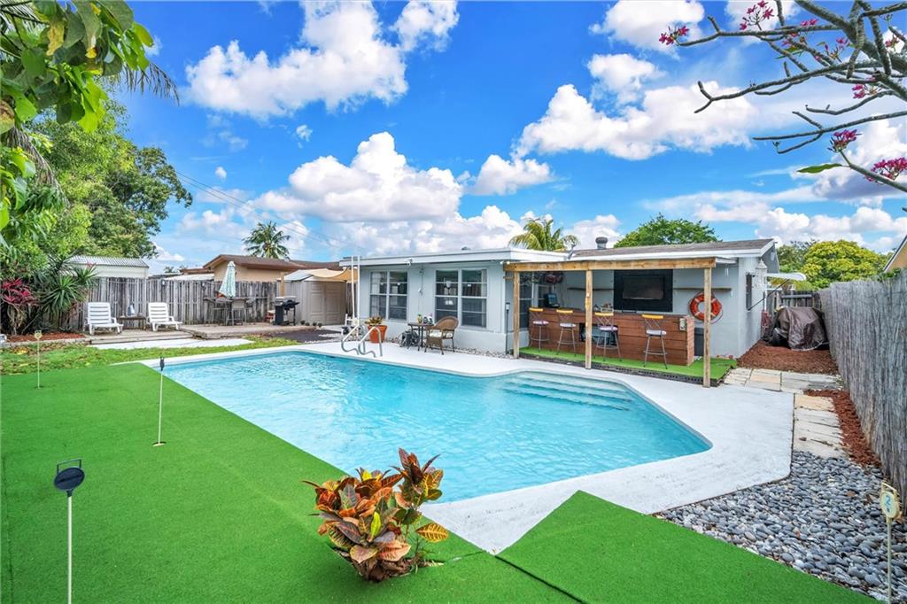 Have you been waiting for a pool home that's perfect for entertaining or just relaxing with the family? Wait until you see this beautiful pool area with its own Key West style Tiki bar, sun deck and a putting green! Completely fenced in yard for privacy. Inside enjoy a split 2 bedroom layout with tile throughout. There is a potential 3rd bedroom with the closed in patio that is currently being used as a weight room. The kitchen is remodeled and has Stainless steel appliances. This home has a 1 car garage and the front driveway is expanded so you have plenty of room for additional parking. The exterior has been been recently painted. This home could be a great Airbnb for an investor. Recently listed so hurry to make an appointment to see it today!