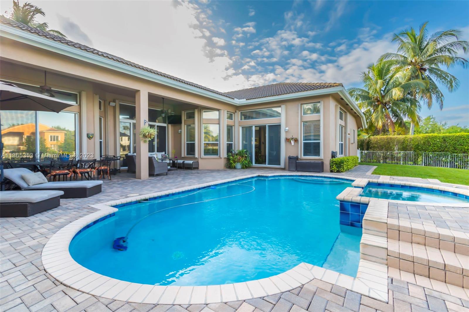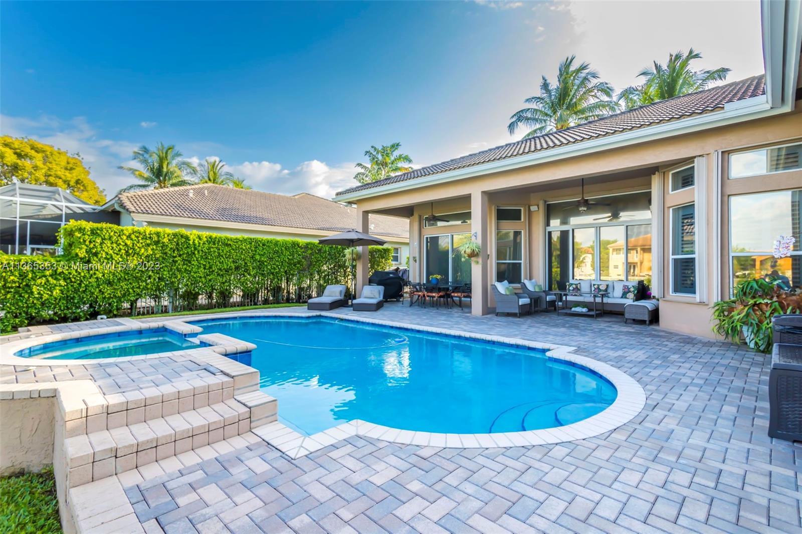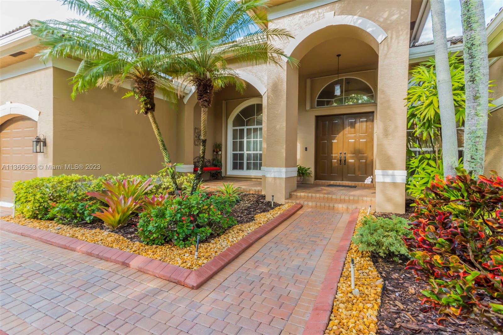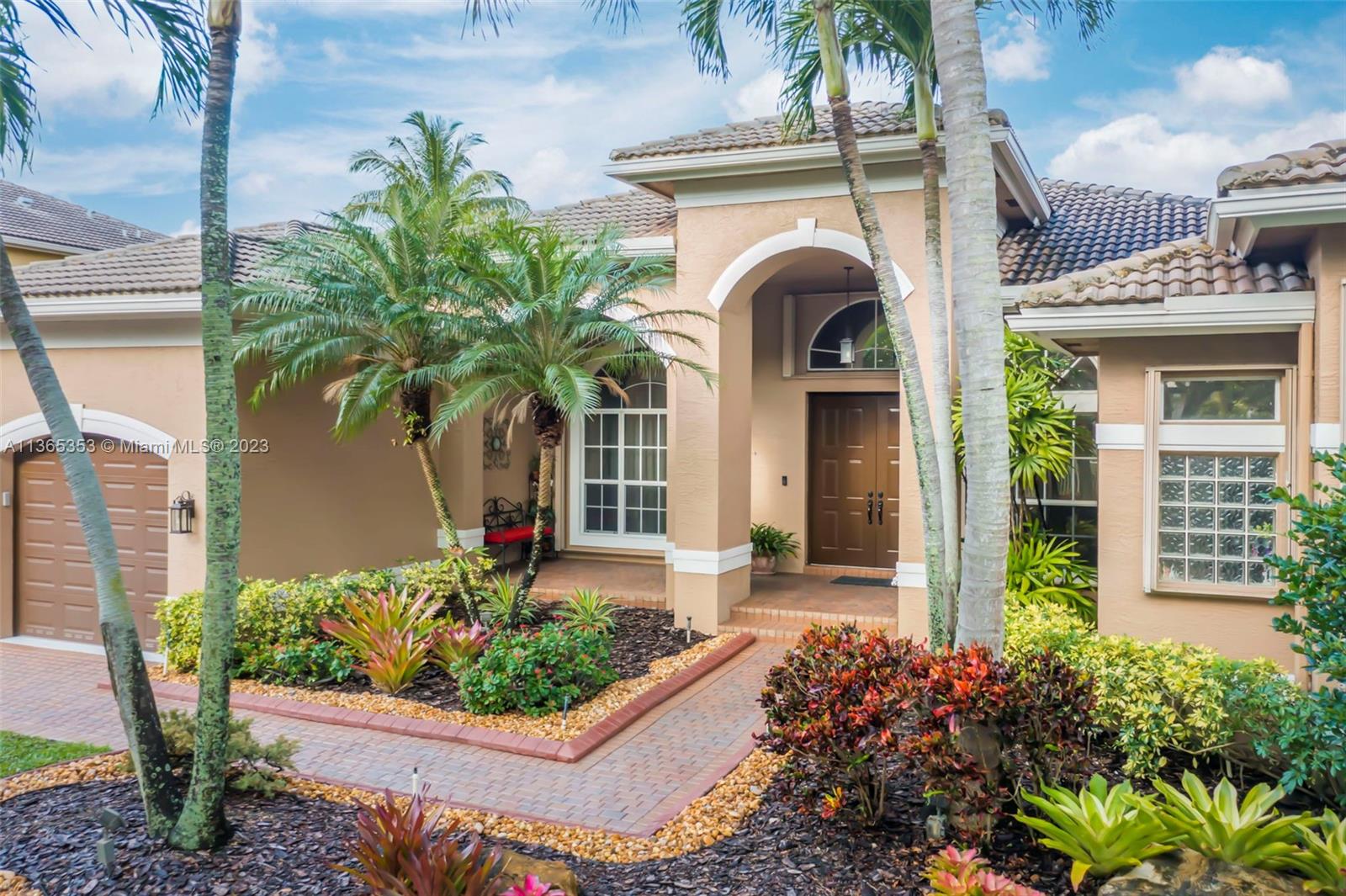 Stunning home in the sought after guard gated section of Majestic Falls in Sunset Lakes. This highly desired Caliterra model is privately located on a cul de sac street w no thru traffic.Its amazing lush landscaping awaits you. Interior features an abundance of natural light, plantation shutters, & new flooring throughout.The kitchen boasts all GE SS appliances, a snack bar & a breakfast nook. Butlers pantry located off of the dining room. Primary suite features 2 large walk-in closets & sliding doors that open to stunning lake views. Pavered Patio is complete w a covered area including a TV & speakers, perfect for entertaining.The beautifully resurfaced freeform pool includes a spa. Lots of greenery for kids & pets Brand new epoxy flooring in garage.Standby Interior photos coming soon.