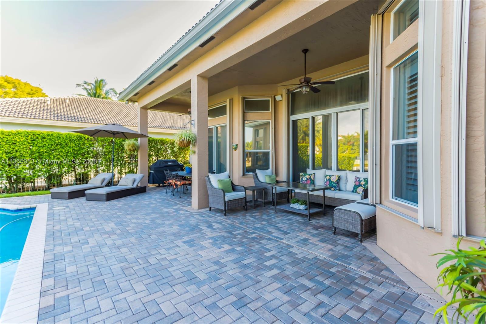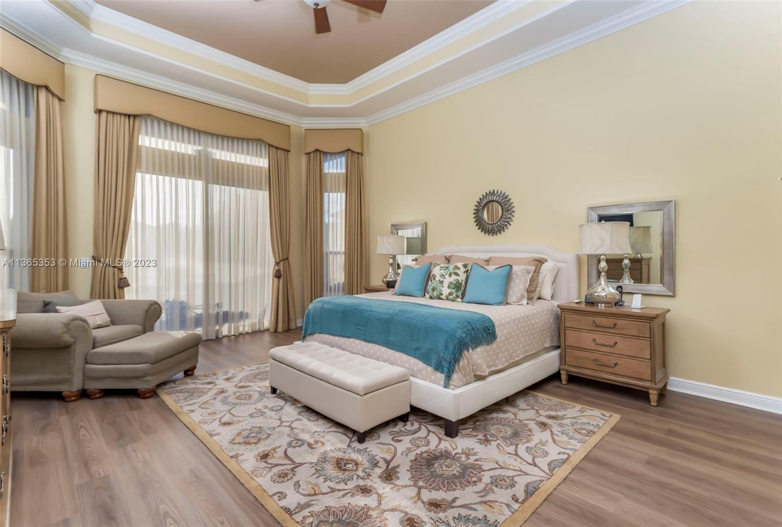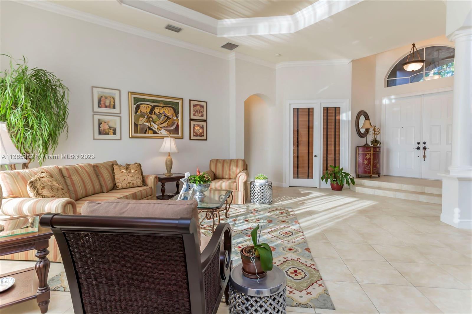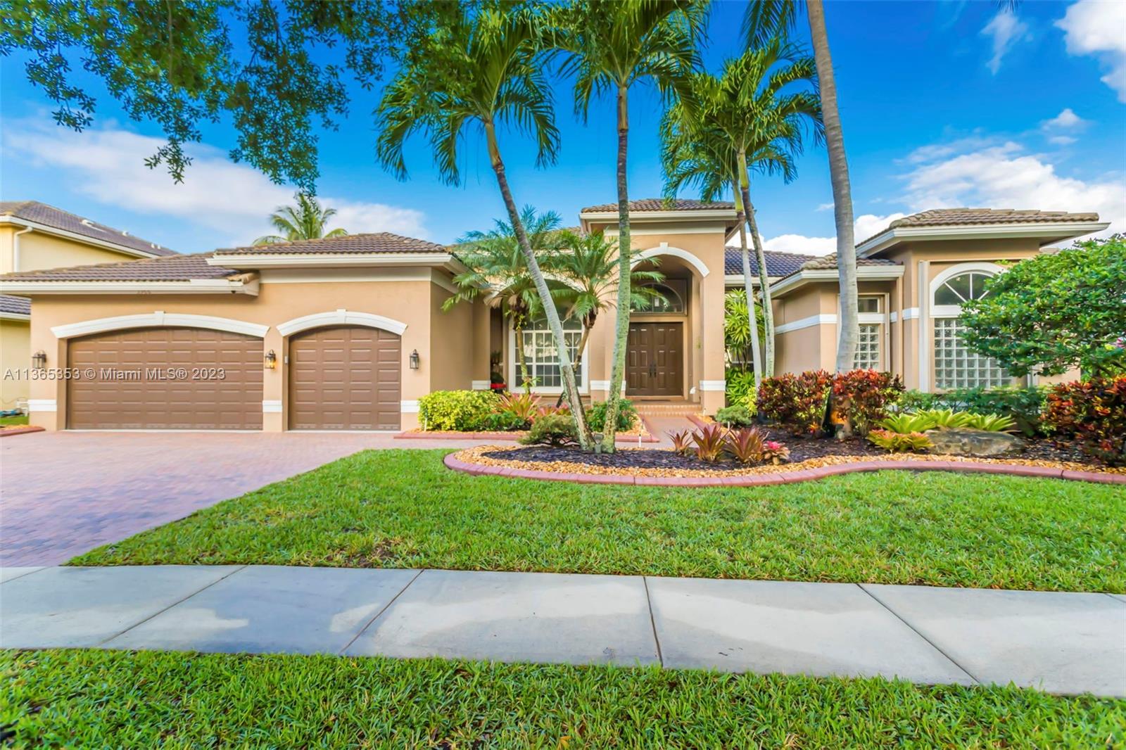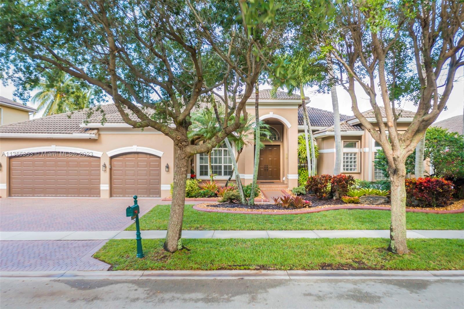 Stunning home in the sought after guard gated section of Majestic Falls in Sunset Lakes. This highly desired Caliterra model is privately located on a cul de sac street w no thru traffic.Its amazing lush landscaping awaits you. Interior features an abundance of natural light, plantation shutters, & new flooring throughout.The kitchen boasts all GE SS appliances, a snack bar & a breakfast nook. Butlers pantry located off of the dining room. Primary suite features 2 large walk-in closets & sliding doors that open to stunning lake views. Pavered Patio is complete w a covered area including a TV & speakers, perfect for entertaining.The beautifully resurfaced freeform pool includes a spa. Lots of greenery for kids & pets Brand new epoxy flooring in garage.Standby Interior photos coming soon.