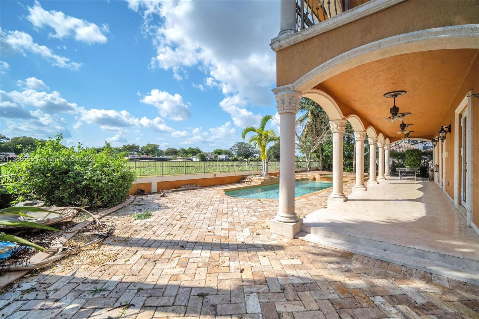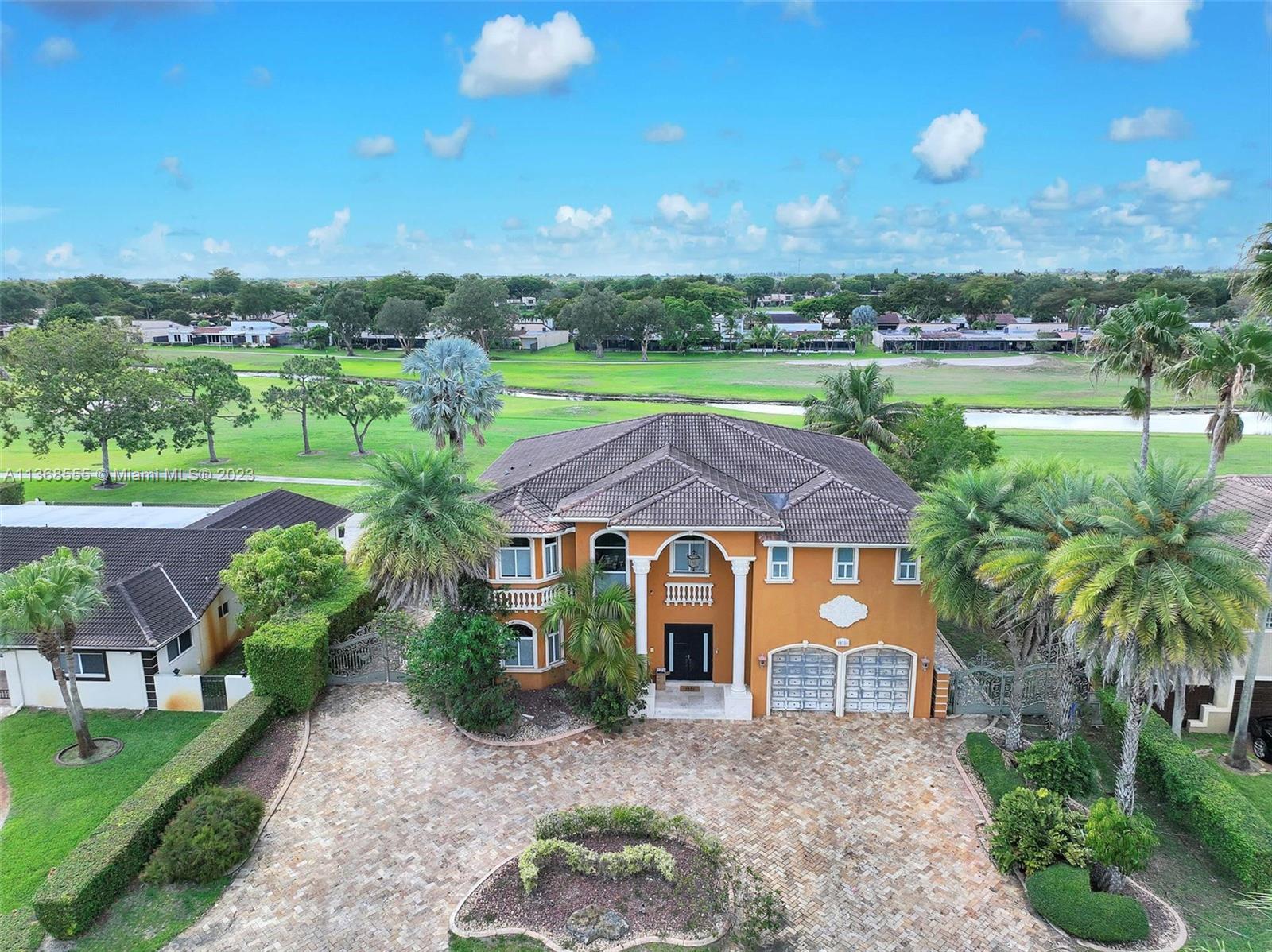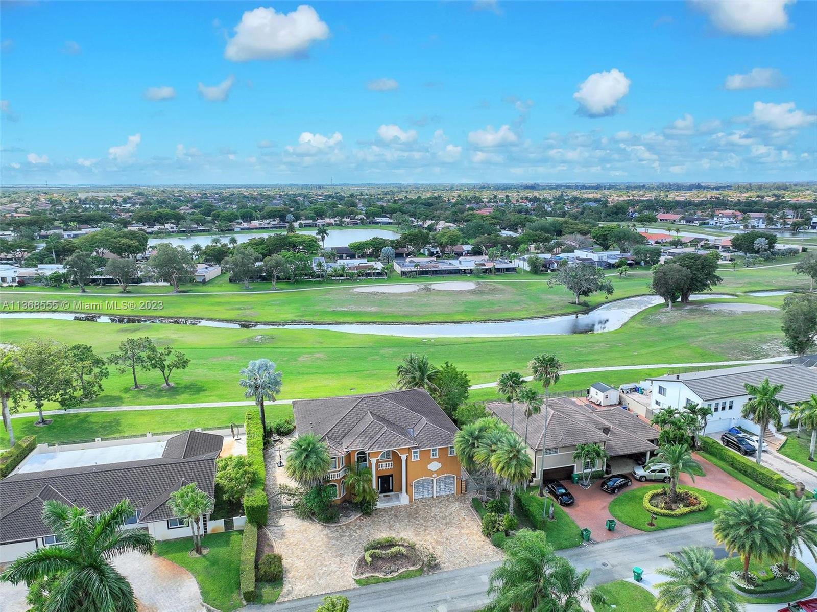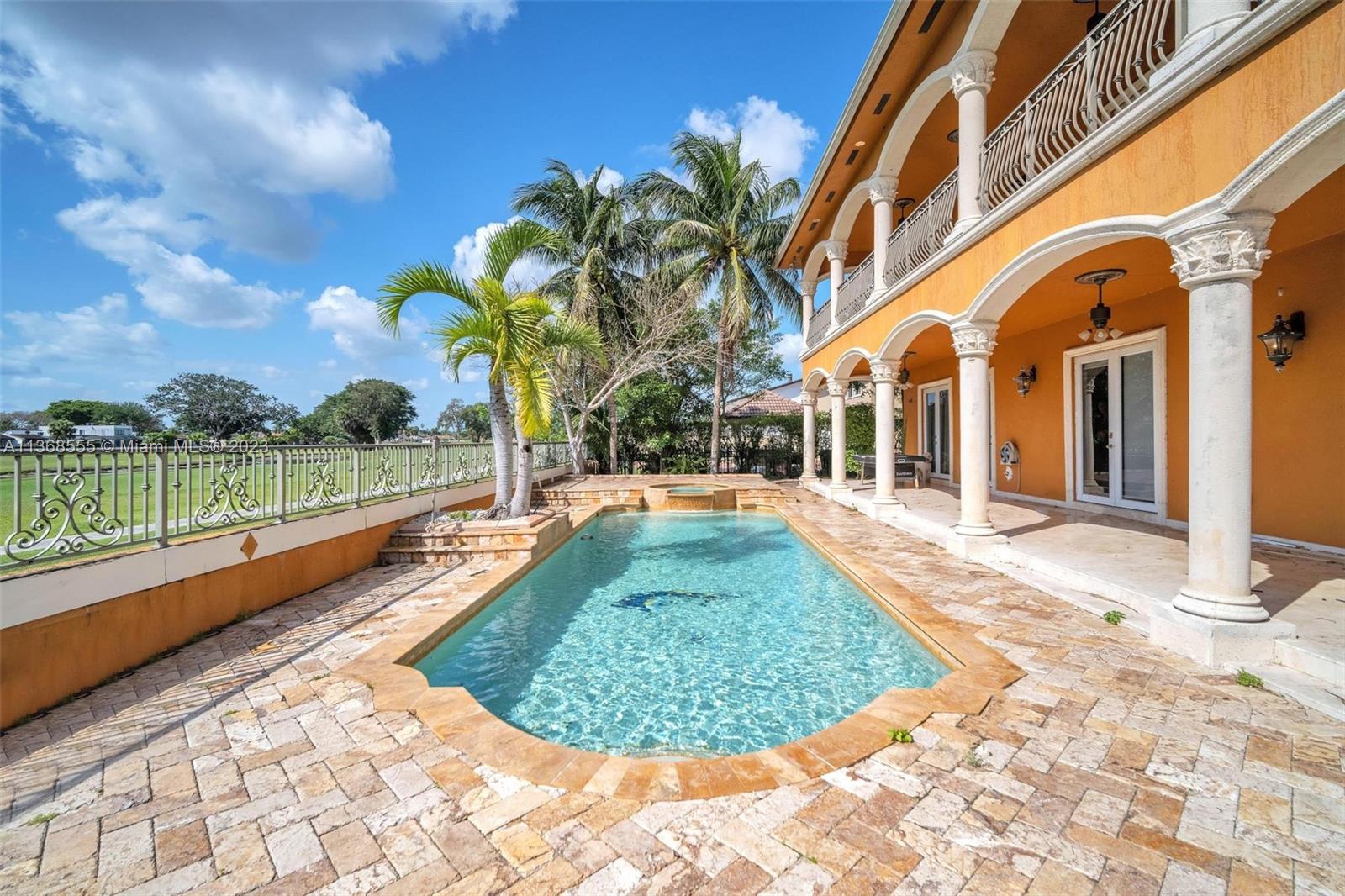 Luxury and elegance throughout this 2-story jewel! Resort style home includes pool & jacuzzi. Watch the sun set. A breath-taking view of the Country Club of Miami Golf Course. The picturesque detail on the ceilings complements the marble floors throughout the home. Custom cabinetries adore the walls of the kitchen which is adjacent to a spacious formal dining area. Each bedroom is oversized and accommodates family members with private bathrooms. This split-level floor plan also has a full downstairs bedroom for your guest to enjoy. Experience sophistication at its best as you open custom French doors leading to an extraordinary huge upstairs master bedroom with an enormous sitting area and equally large bathroom. Large balcony. Welcome home, this is a must-see property!