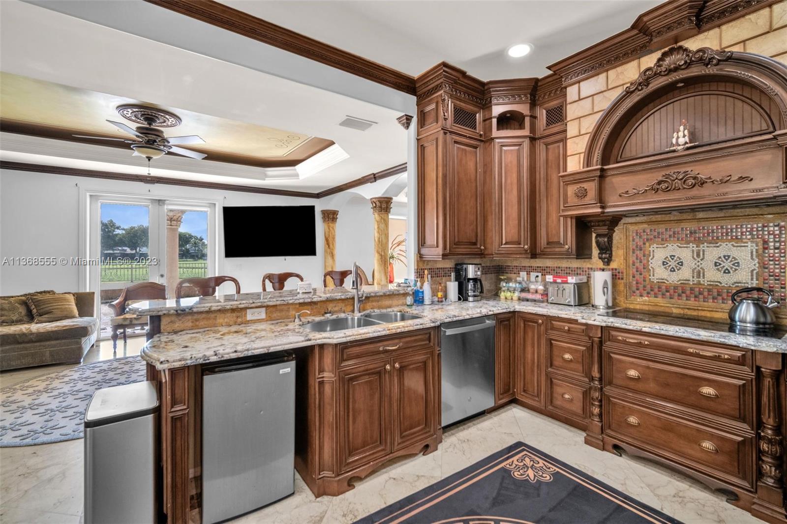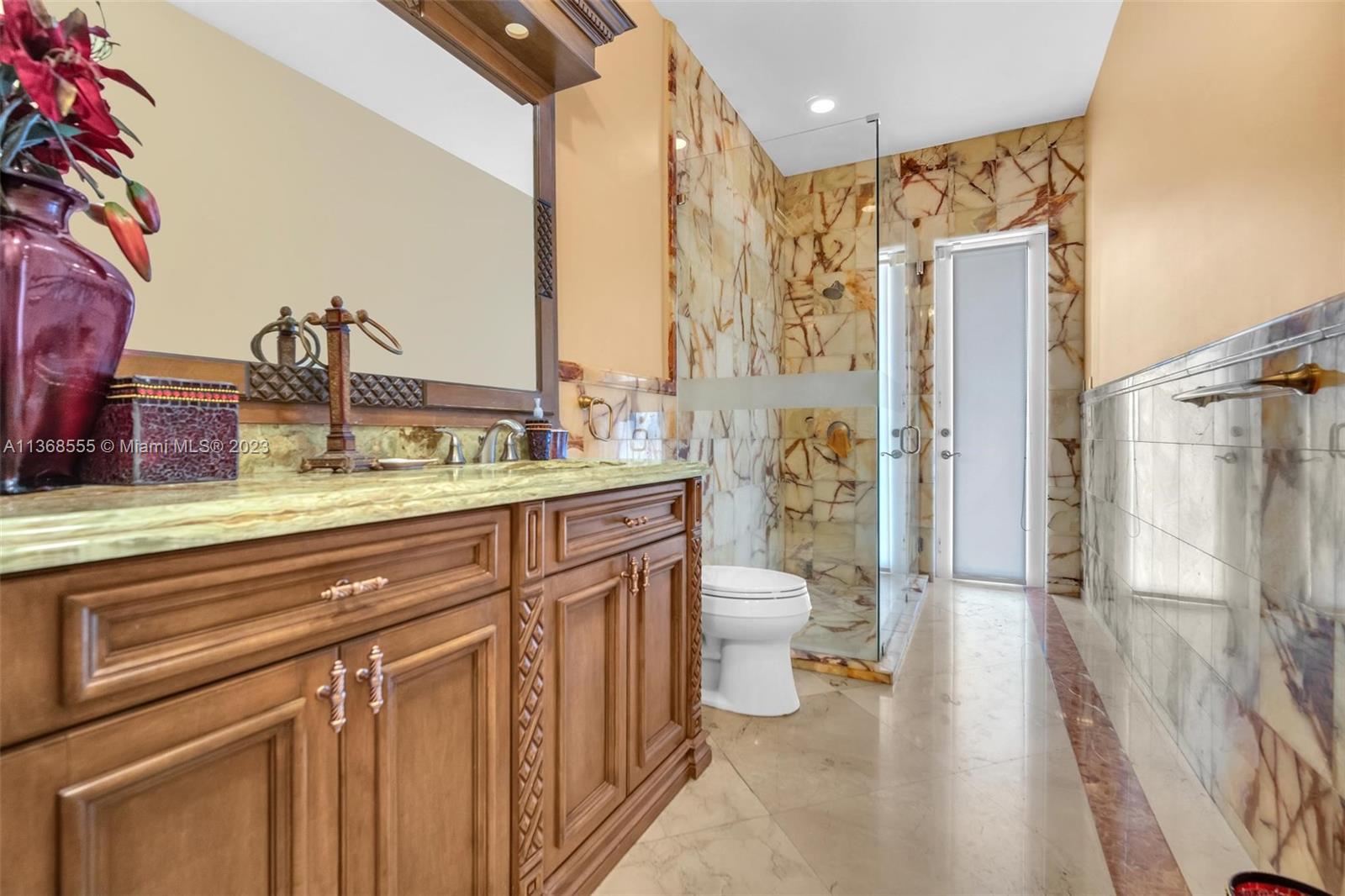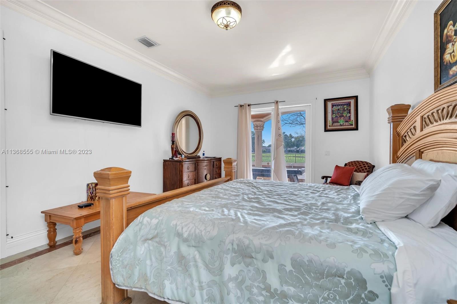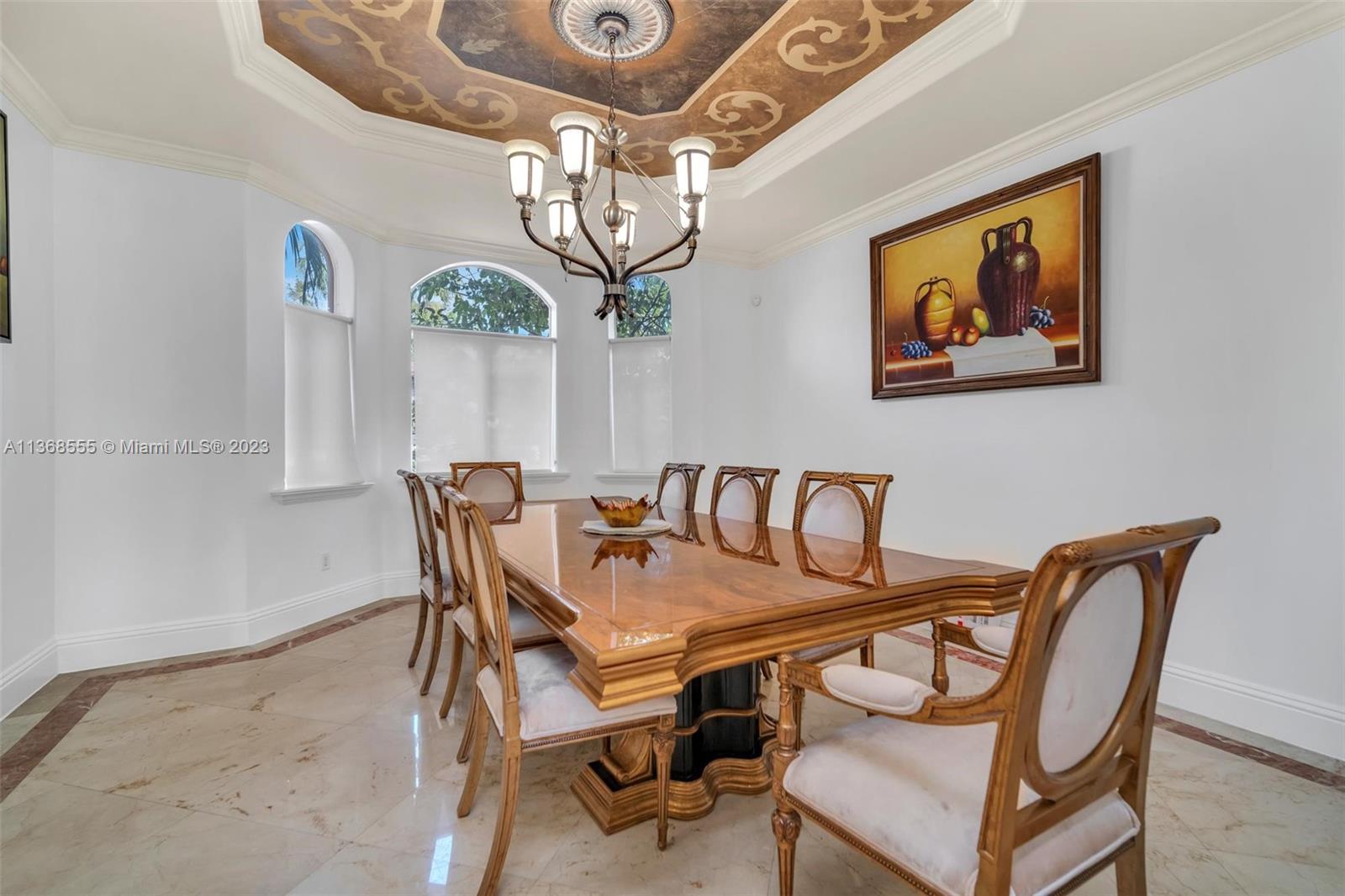 Luxury and elegance throughout this 2-story jewel! Resort style home includes pool & jacuzzi. Watch the sun set. A breath-taking view of the Country Club of Miami Golf Course. The picturesque detail on the ceilings complements the marble floors throughout the home. Custom cabinetries adore the walls of the kitchen which is adjacent to a spacious formal dining area. Each bedroom is oversized and accommodates family members with private bathrooms. This split-level floor plan also has a full downstairs bedroom for your guest to enjoy. Experience sophistication at its best as you open custom French doors leading to an extraordinary huge upstairs master bedroom with an enormous sitting area and equally large bathroom. Large balcony. Welcome home, this is a must-see property!