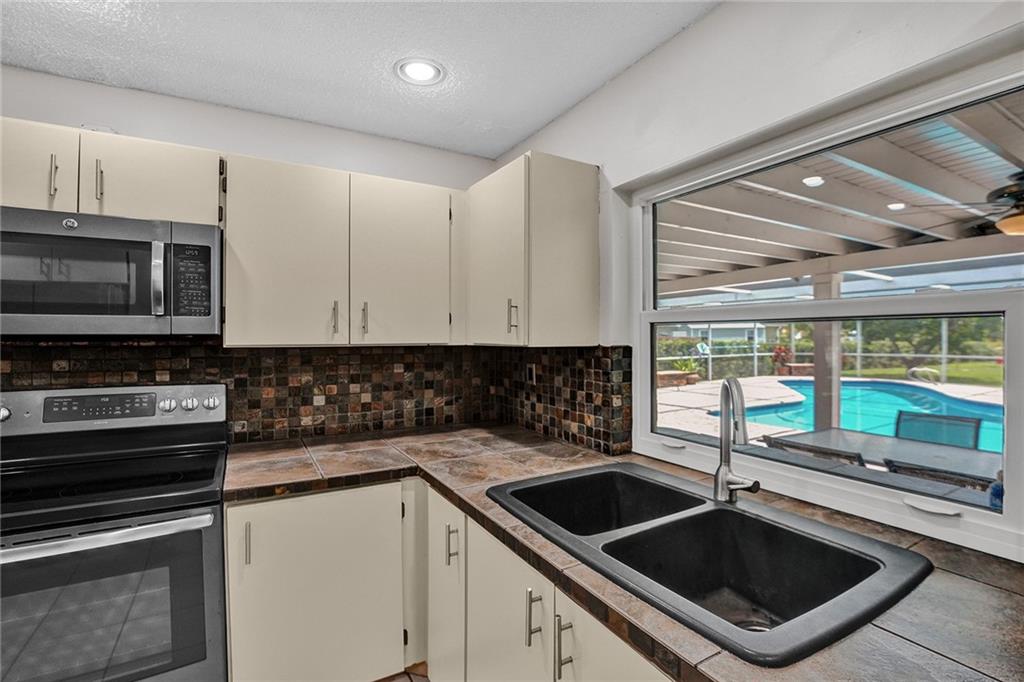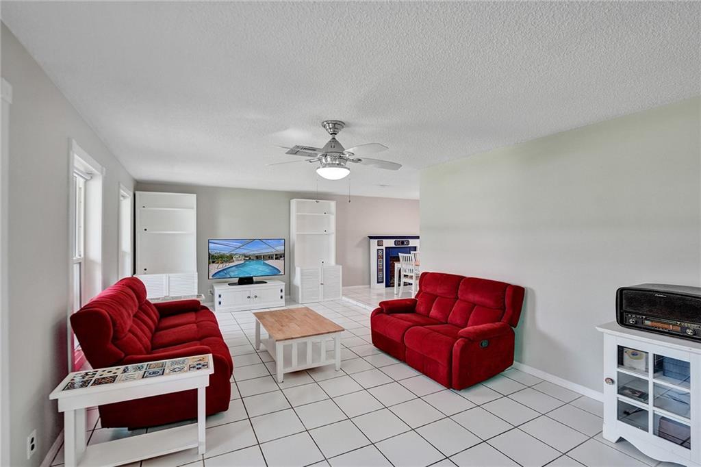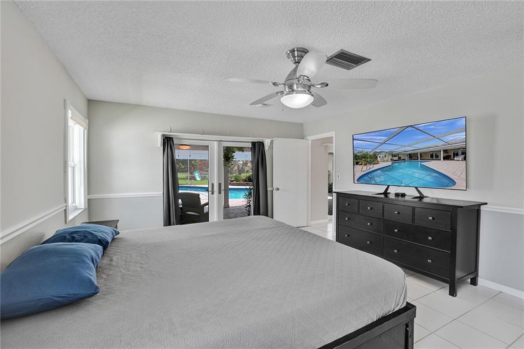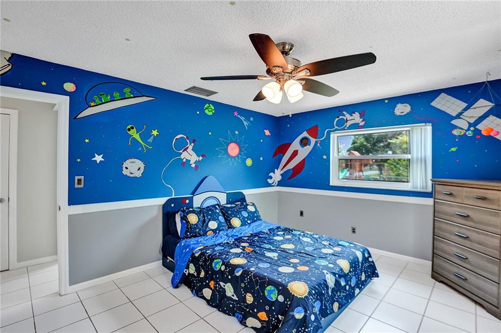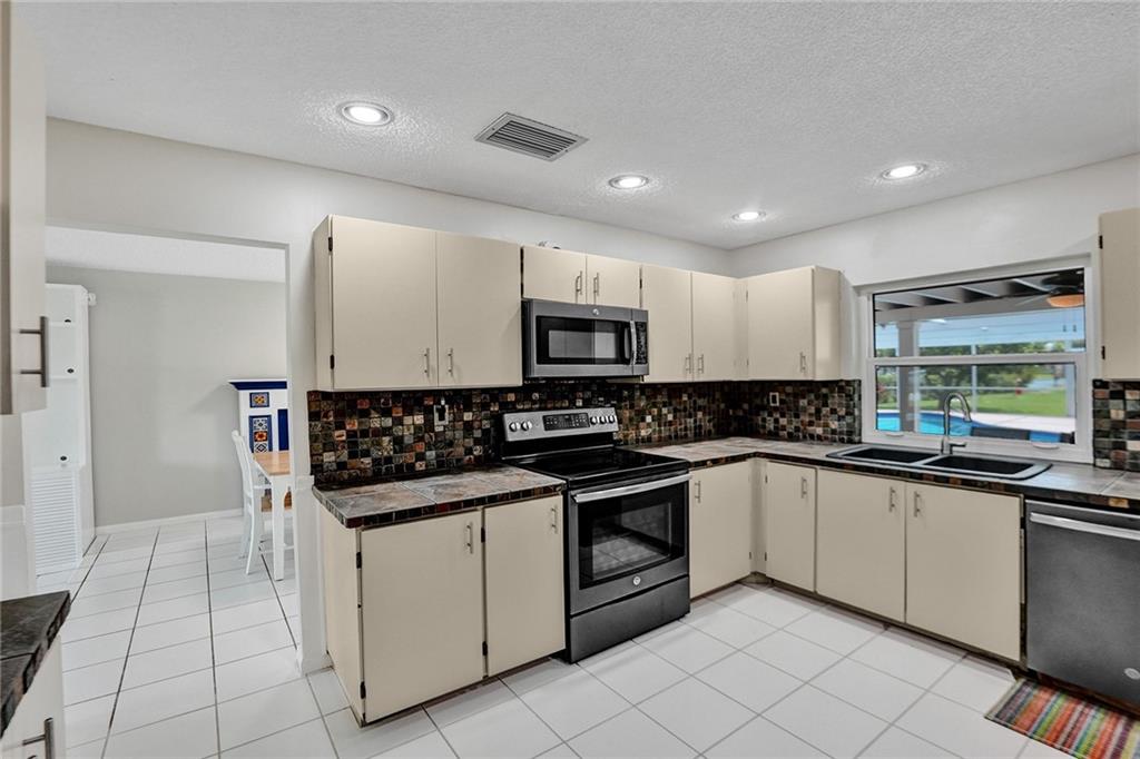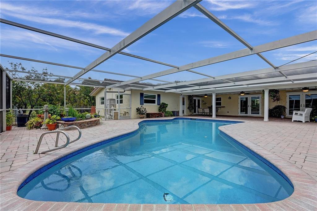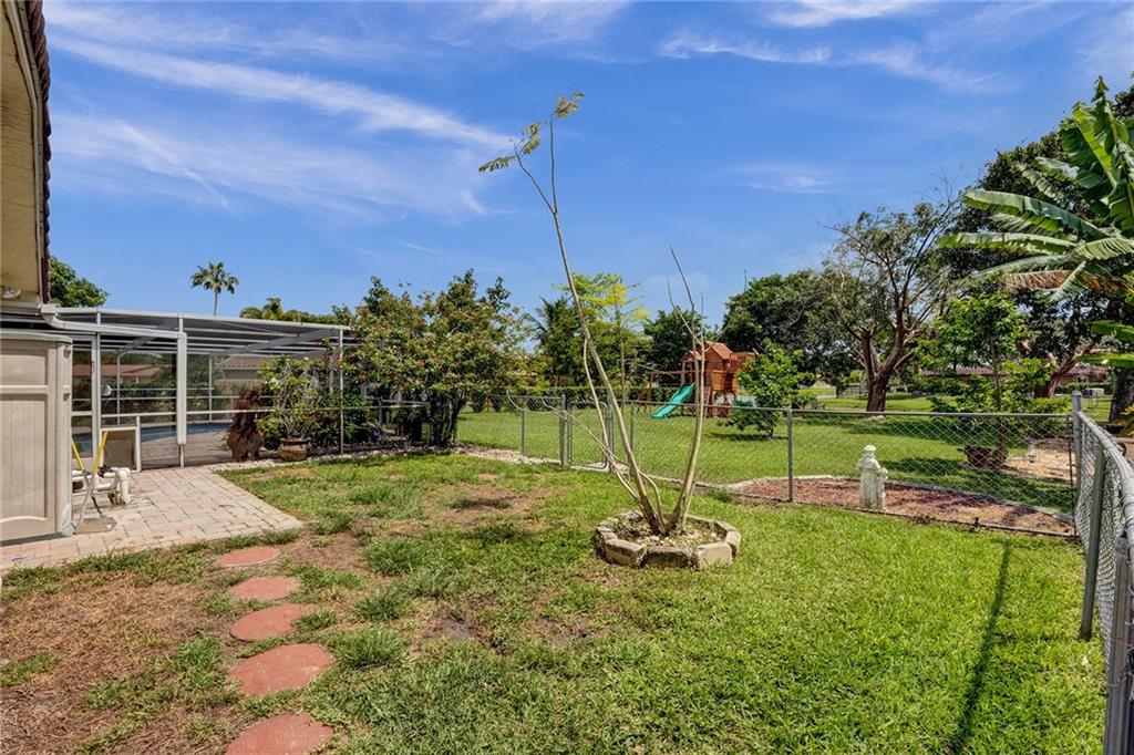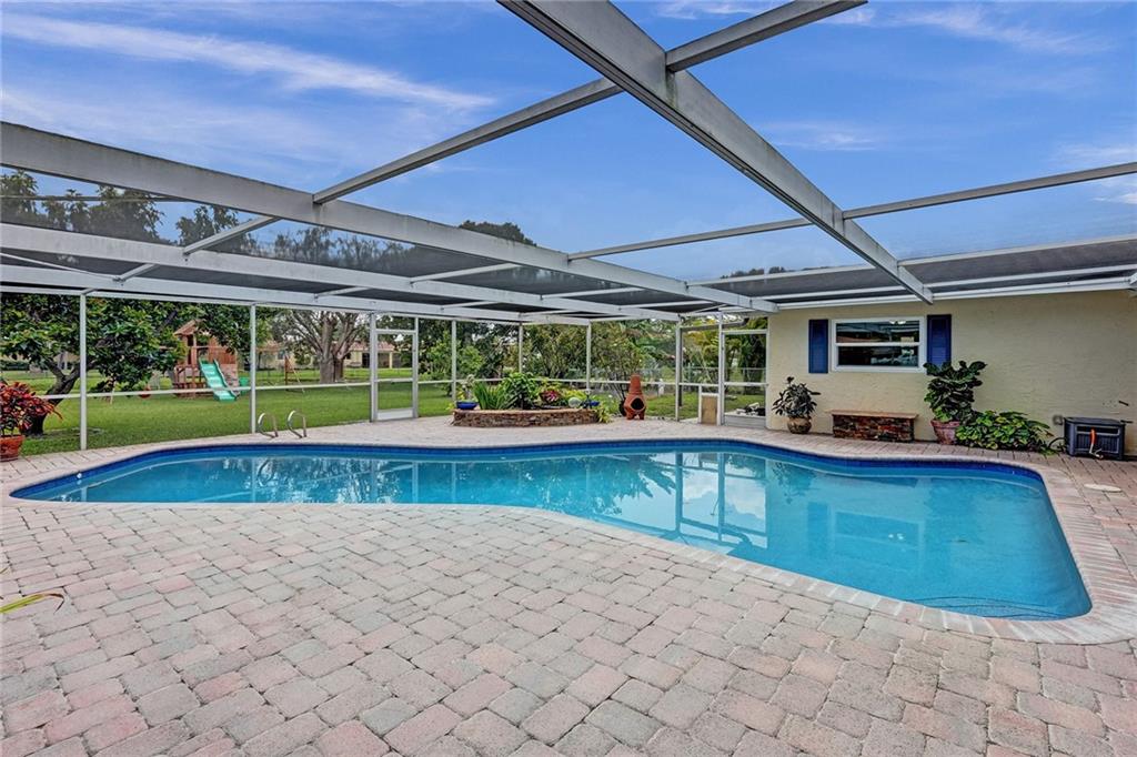 This spacious 4-bedroom, 2-bathroom home, with an inviting living room features large windows that allow natural light to flood in, creating a bright and welcoming ambiance. The floor plan flows seamlessly into the dining area and kitchen, complete with stainless steel appliances, and ample storage space. The primary bedroom boasts a spacious layout with a walk-in closet and an en-suite bathroom that features a dual sink vanity and walk-in shower. Step outside into your very own private oasis, where you can enjoy year-round Florida living with a screened-in patio and a sparkling pool. The fenced backyard offers plenty of space for entertaining and outdoor activities, and the lush landscaping with many fruit trees creates a tranquil and joyful atmosphere.