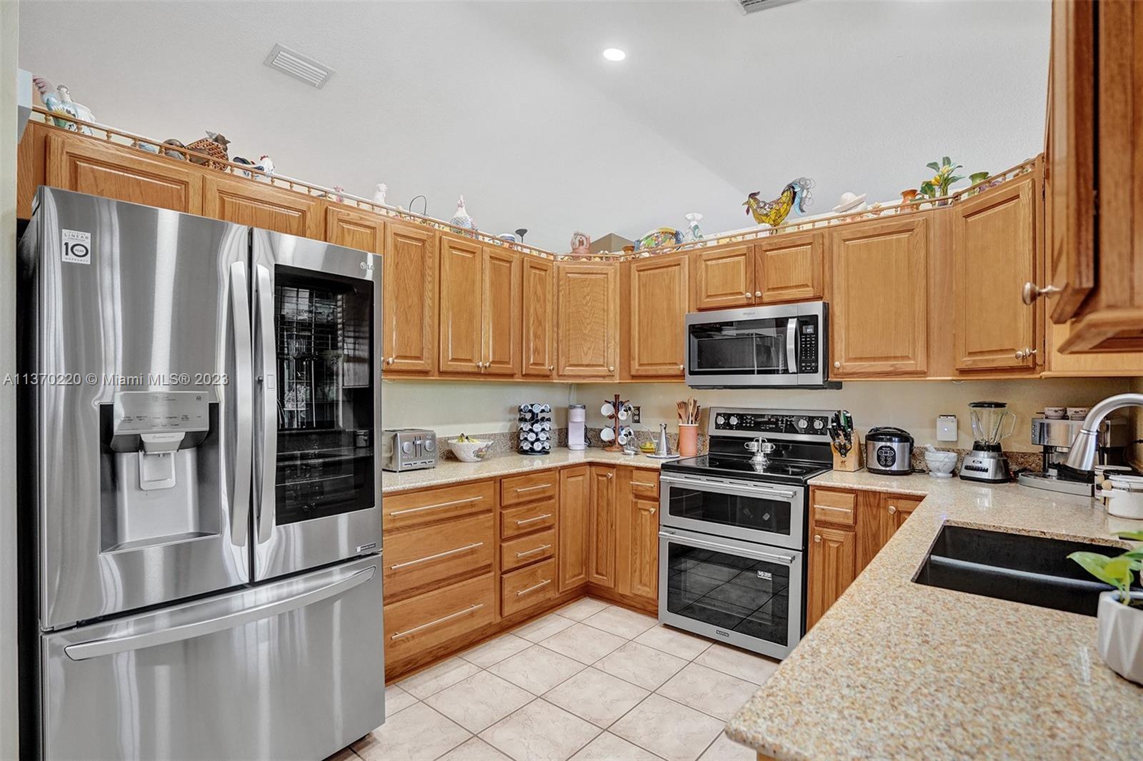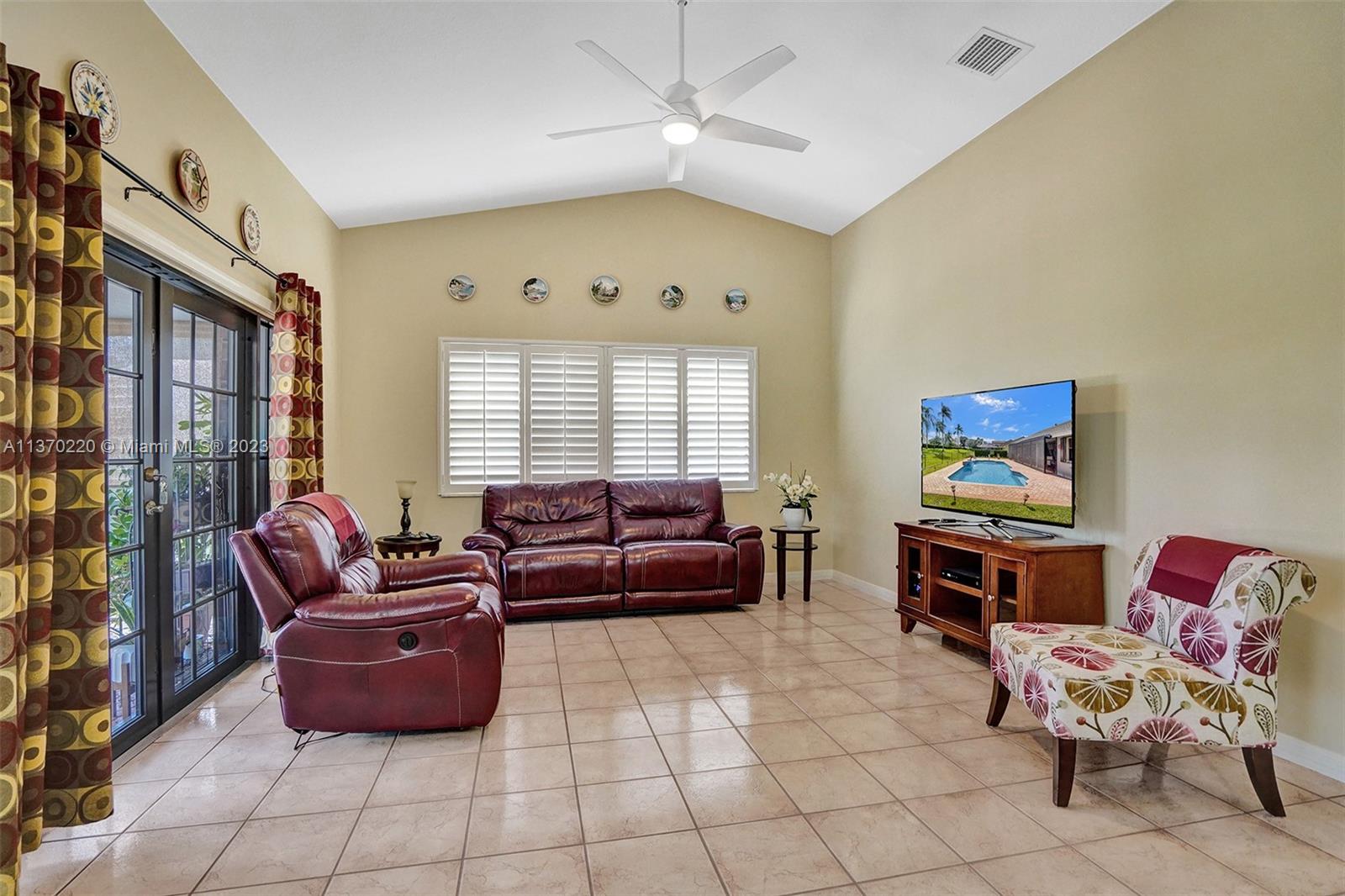 Maintained to perfection by original owner! This popular Sagamore model is situated on a spacious (11,074 sq. ft.) lot. Tile floors throughout. Freshly painted interior, neutral colors. Kitchen features granite countertops, newer SS appliances all replaced in the last 5 years. Updated cabana bath. Master bath with dual sinks. Large Master bedroom, plantation shutters, walk-in closet. Aluminum screen enclosure installed 2022 overlooking lovely pool area with pavers. Enjoy freshly resurfaced pool with waterfall. Fully Fenced backyard. Impact windows on front of home and impact front door. Accordion shutters on all other openings. Roof replaced 2010, A/C replaced 2017. Mud sink in laundry room. Low HOA dues cover basic cable and internet. Excellent schools!