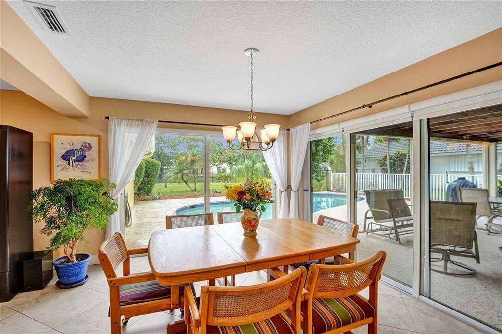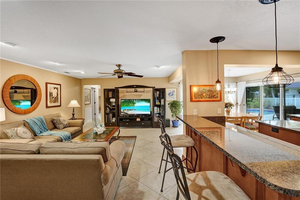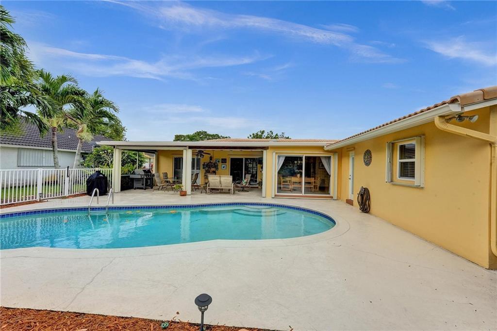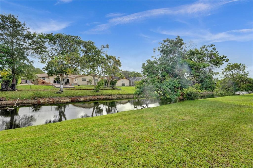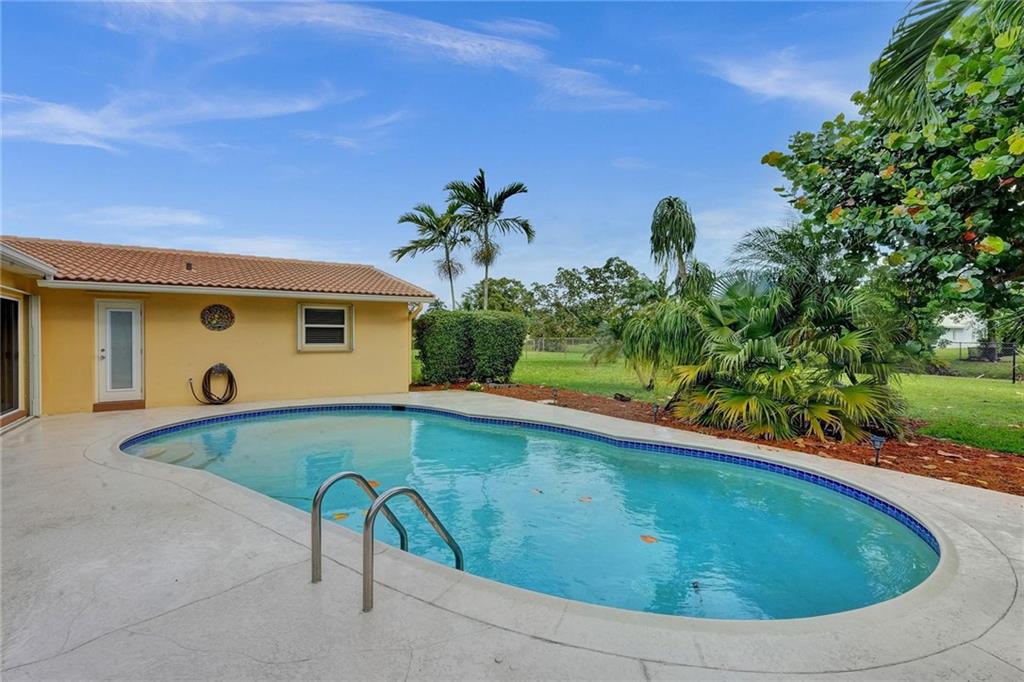 Oversized .28 acre waterfront lot in highly desirable Ramblewood neighborhood - NO HOA! 5 true bedrooms - tons of closets! Glass inlay double doors welcome you w/ tons of natural light. Split bedroom plan for added privacy. Beautifully updated kitchen w/ granite counters, island, and stainless steel appliances opens up to the large family room & eat-in kitchen area. Master bedroom has views of the pool & features XL walk-in closet w/ 2 sinks & built in extra storage. Updated master bathroom has an oversized shower w/ frameless glass door & waterfall shower head. 3 bedrooms towards the back have a pocket door for added privacy. 2nd bathroom is also updated & leads out to the pool. Extra deep lot is great for pets or kids. Flat roof - 2018, Barrel Tile Roof 2000, AC 2021, Water heater 2011.