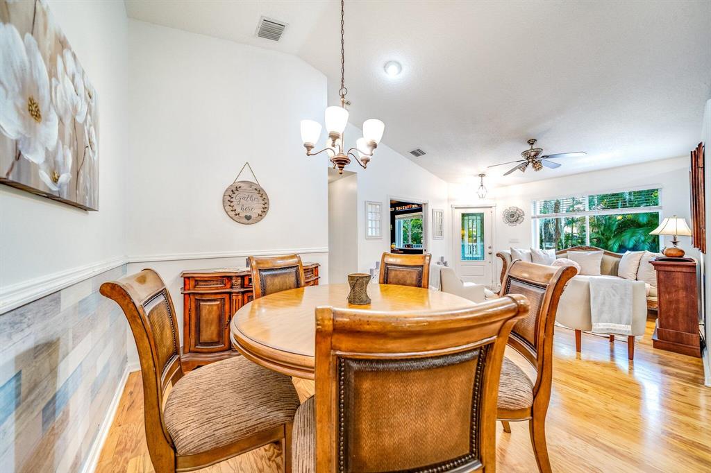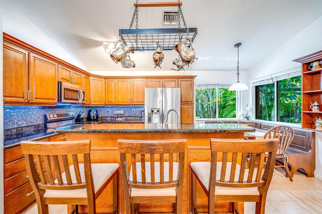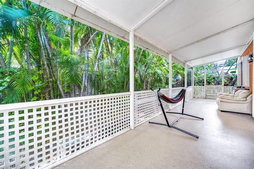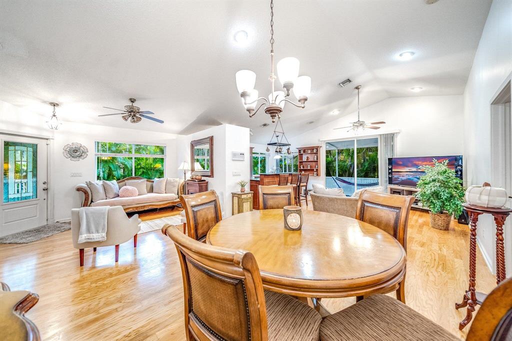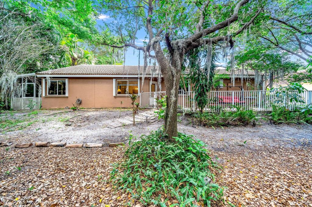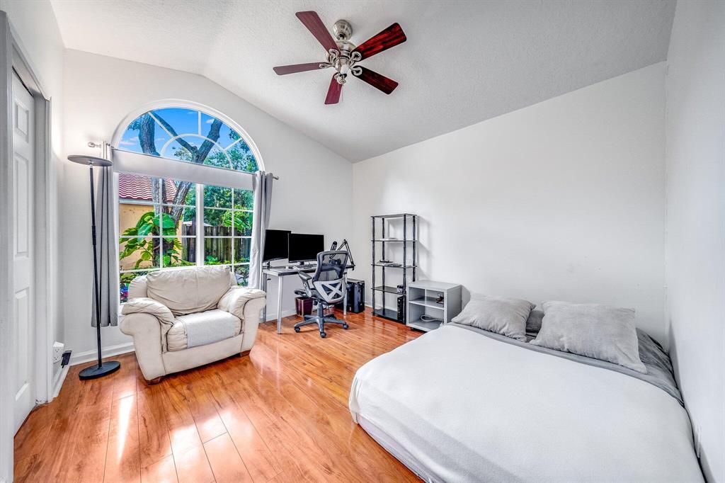 This cozy, peaceful, private feel corner home offers 4 bdrms (4th bdrm is being used as a studio...just paint & put closet doors back) 2 bath, 2 car garage w/ extra driveway space & large fenced yard is awaiting you. Impact front windows & have accordion. Stainless steel appliances, granite counters, wood floors (living areas) laminate (bdrms) & open floorplan are ready for you to make it your own. Cov'd screened patio is width of home, great for entertaining & relaxing. The yard has so much potential and shaded by many trees. Garage has portable a/c, owner does crafts in it. One way in/out this secluded, quaint neighborhood has 28 homes & a community pool. Close by is a park with pickleball, basketball, volleyball, tennis & more. Location is minutes to beach, airport, turnpike, I95 & more