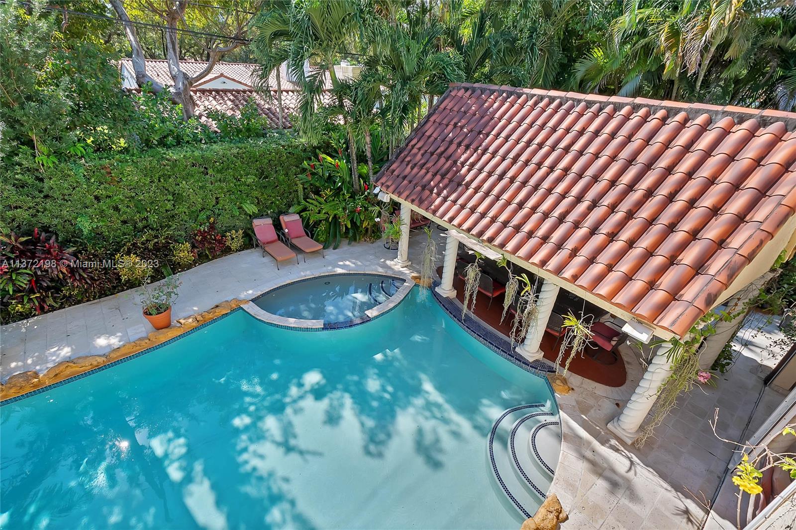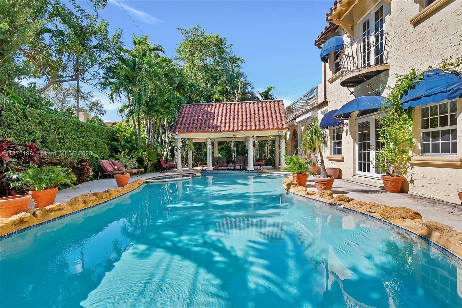 Stunning, classic Spanish style home built in 1923, renovated & move-in ready. 5 bdrm/ 3.5 bath home, on a 11,250 sq ft lot, on the quintessential Asturia Av in Coral Gables. Beautiful architectural details. Many entertaining areas incl. formal living w/ fireplace, formal dining, sunroom & charming interior courtyard. Fantastic chef’s kitchen w/ center island, granite counters, wood cabinetry, gas stove. Spacious family rm. 3 bdrms up incl. grand primary suite w/ fireplace, marble bath, terrace w/ seating. 1 ensuite bdrm down, perfect for guests. Relax under the shade on one of many covered patios surrounding the pool & heated jacuzzi. Lush landscaping. Gated, brick paver circular driveway. 2 car garage. Full home generator. Impact windows/doors. Only 1 block from Granada Golf Course.