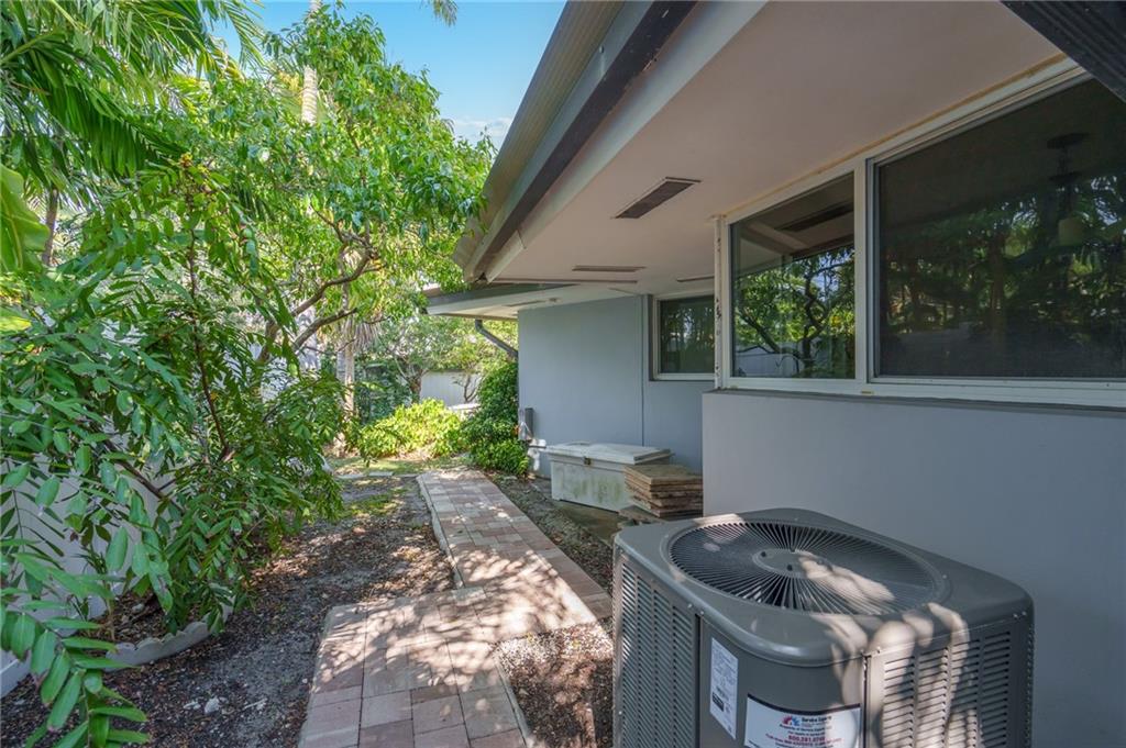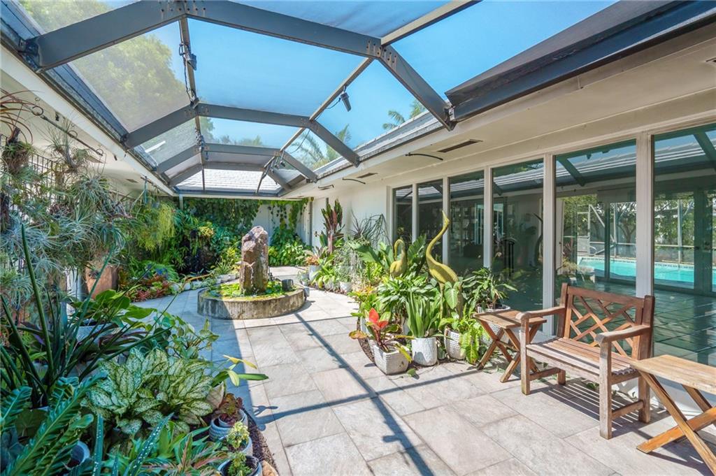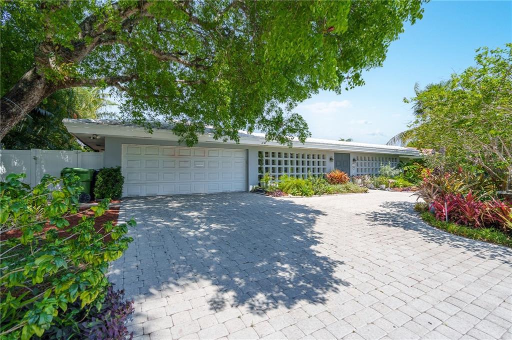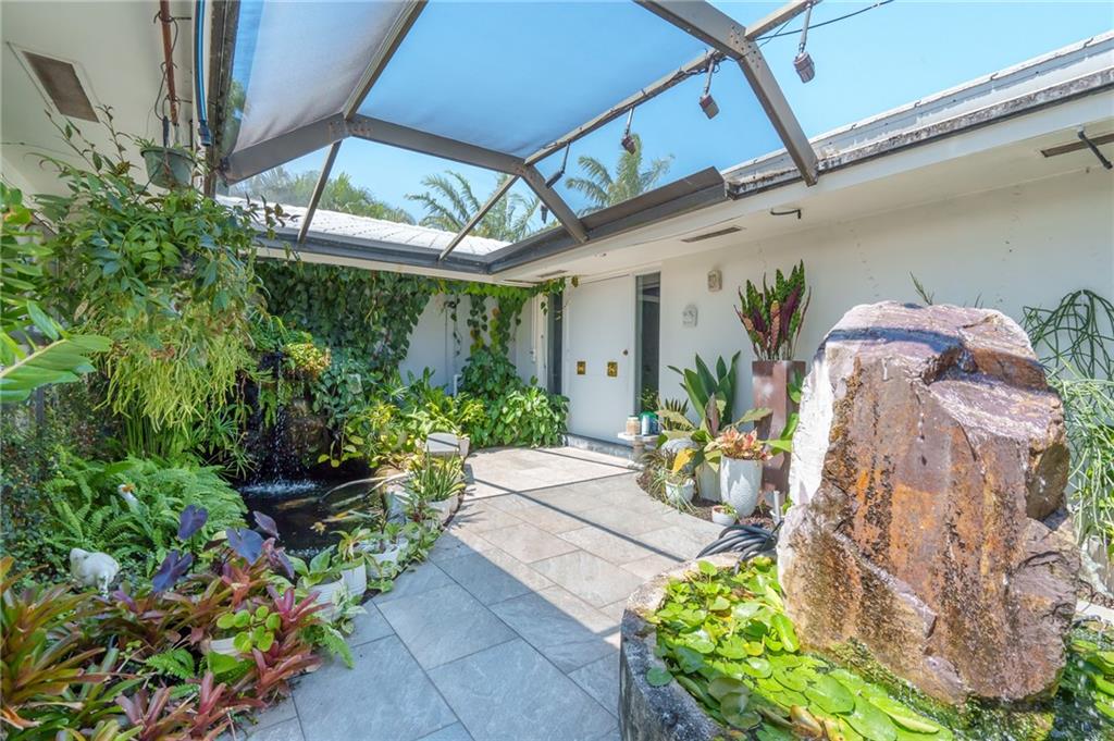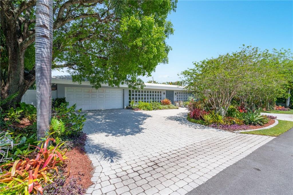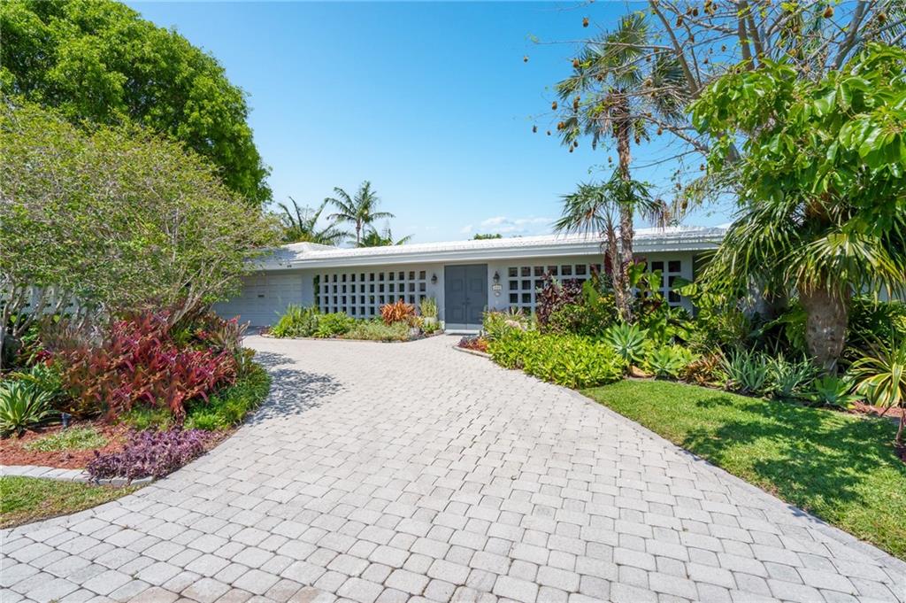 Unique lines in this mid century home offer a fine compliment to both the indoor and outdoor space. Enter the house through a double door courtyard into a well established garden complete with water features and koi pond. The large courtyard windows offer a view into the home, though the house to the backyard pool area. A second double door entry leads you into the home. The kitchen is surrounded by the "round room", a unique feature to this floorplan as well as a garden room. The split bedroom floor plan is a three bedroom, two and a half bath, a large great room, living and dining area. Newer roof, AC and water heater. Full house generator, natural gas, impact windows and doors. The area is walkable to restaurants and 1.5 miles to Lauderdale by the Sea. Property offered AS-IS.