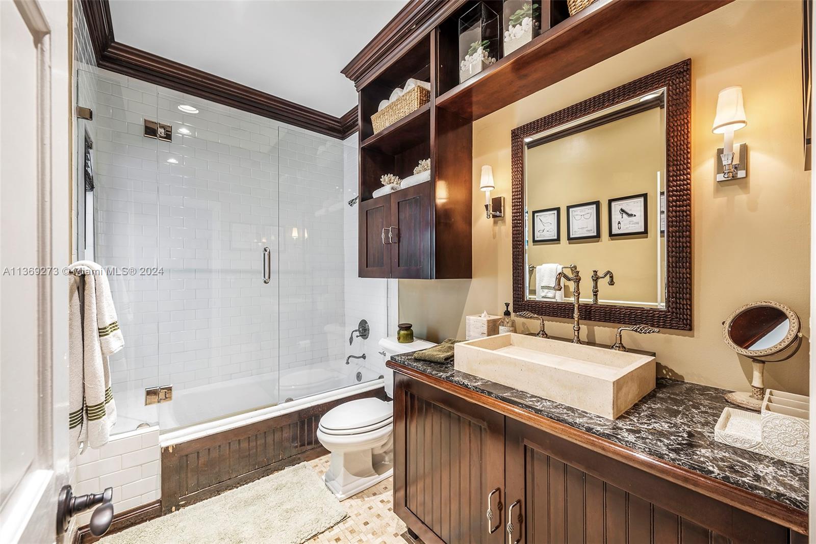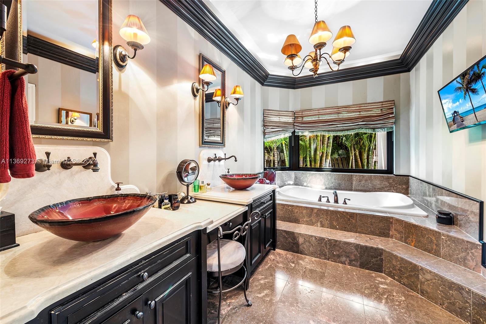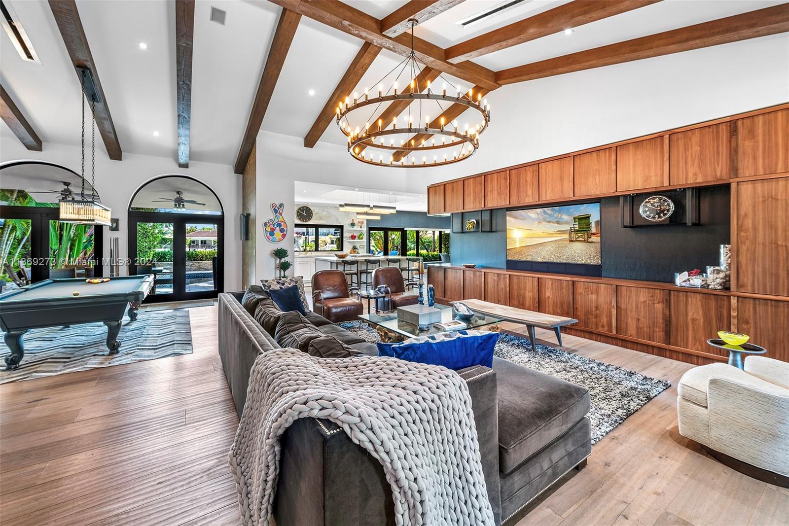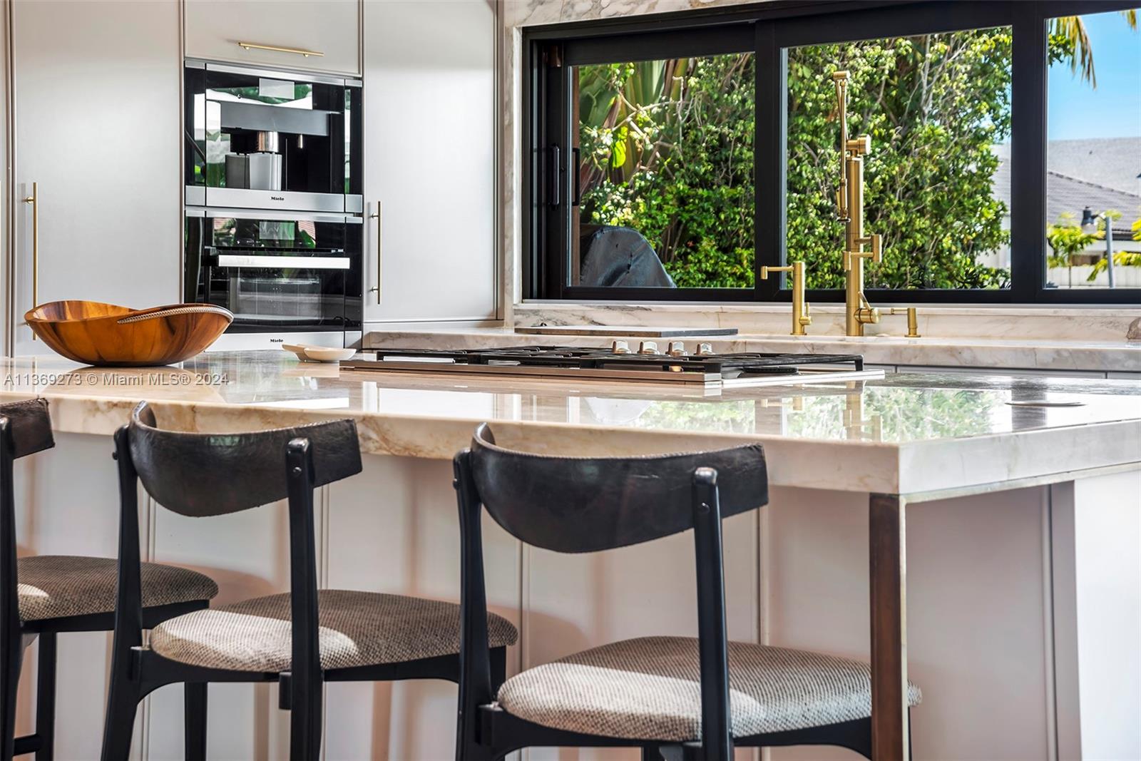 This stunning one-story custom-built home is a dream come true for yacht owners, offering 50ft of waterfront property. The home boasts high ceilings. Perfect for boat enthusiasts. Professionally decorated with the finest quality finishes throughout, including custom-built wall units, impact windows and doors, wood plank floors, and a newer (1 year) flat tile roof. The home features a built-in bar, a huge great room, and a newer remodeled spacious eat-in kitchen with marble countertops and backsplash, a Miele gas stove, Miele oven, microwave, espresso, and wine cooler, built-in Subzero refrigerator and freezer, tall cabinets, and pull-out pantries. A must see opportunity.