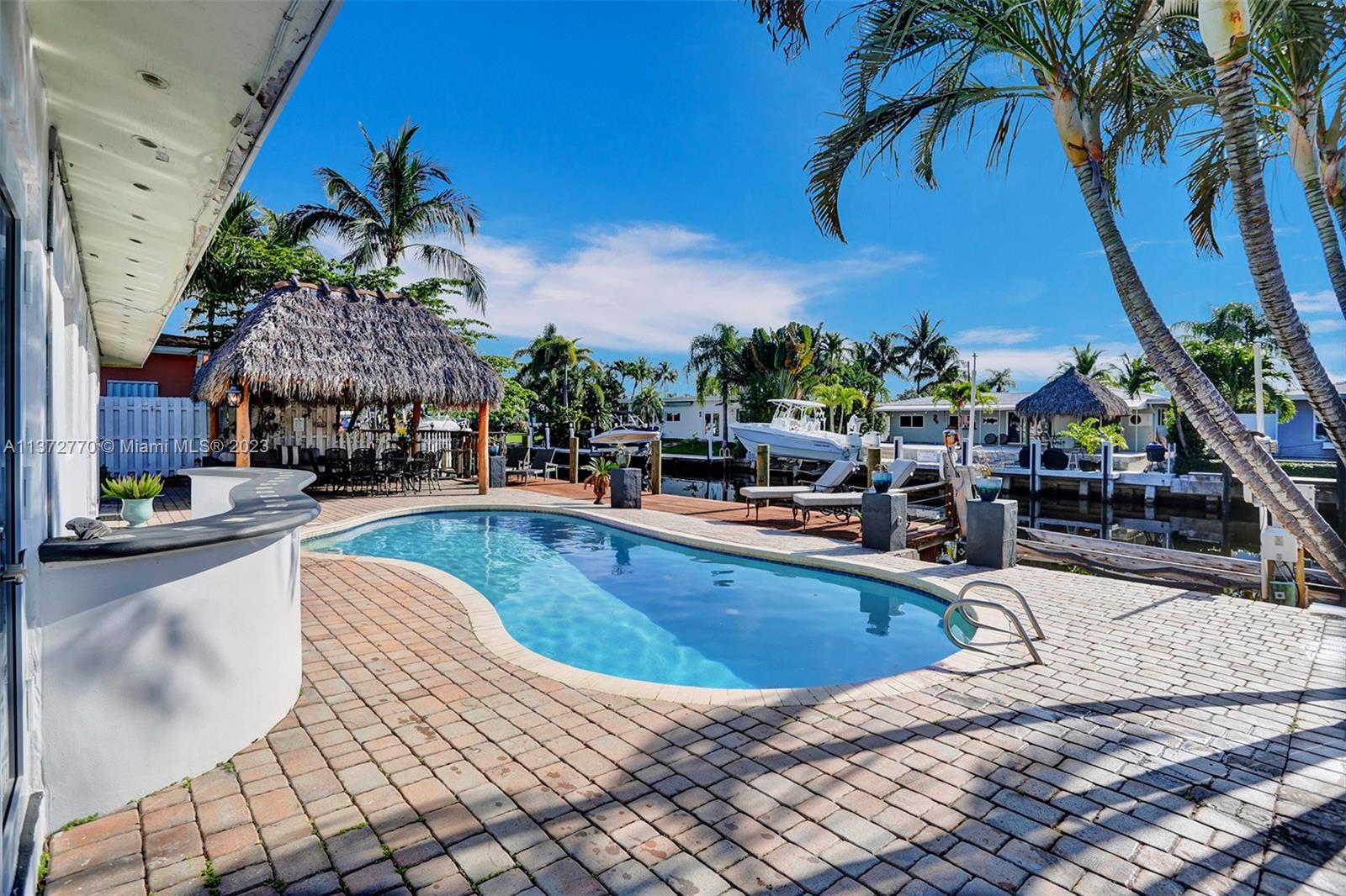 Boaters Delight! Come see this beautifully renovated 3 bed 2 bath home with 1 car garage on 70ft of waterfront with ocean access & boat dock. This home offers a large kitchen with granite countertops, separate office, great room, and a dining room overlooking the pool and canal with tile throughout. Entertain your guests under the Tiki hut on the large concrete deck. Newer roof and AC. 2 Fixed bridges to the ocean. Can be sold fully furnished turn-key