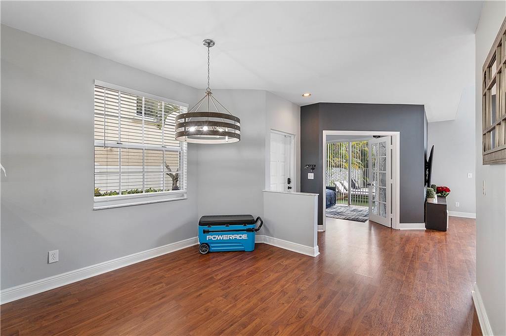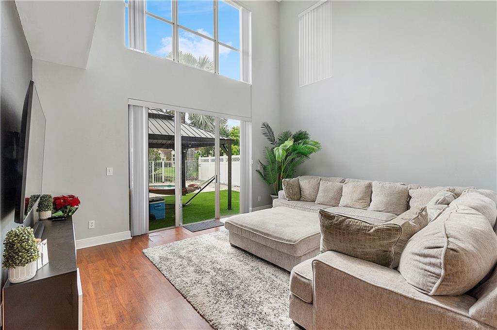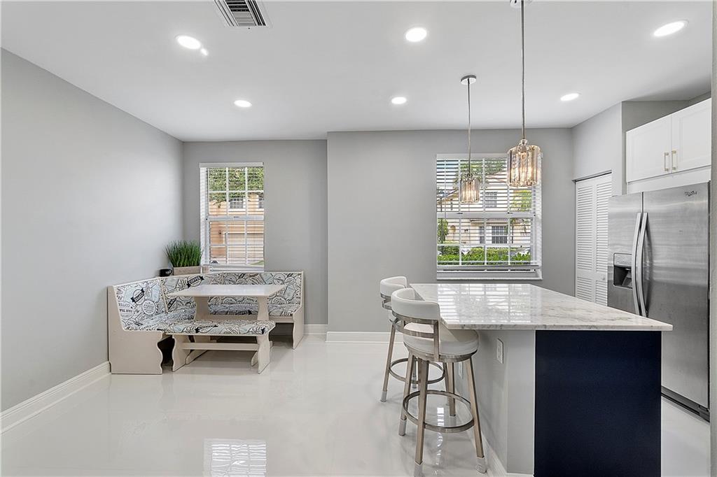Gorgeous, renovated lakefront home with a tranquil full view of the water. Relax under your covered lounging area overlooking your private heated pool & lovely fenced backyard. Renovated contemporary with soaring ceilings and lots of light from the 2 story windows. Custom designed, smart kitchen with island, beverage bar, granite counters, and soft close cabinetry. White upper cabinets and stylish, navy blue lower cabinets with hidden drawers. Stainless steel appliances. 1st floor Den or 4th BR has french doors. Floating vanity in lower level bath. 3 nice sized bedrooms and 2 full baths, upstairs. Freshly painted. No carpet. Utility room, 1 car garage, and great closet space. Immaculate condition. You will love Kensington South neighborhood with gated entrance and community pool.