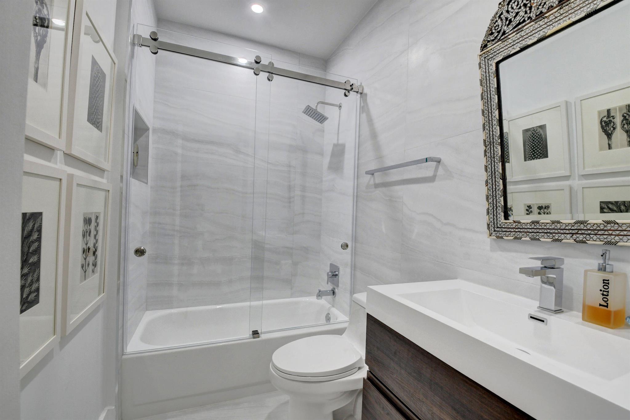 Located within Broken Sound's beautiful village of Timbermill, discover this lavish 3 bed, 2 bath townhome. Sophistication welcomes you from the moment you step inside the gate of this contemporary paradise with smooth walls & vaulted ceilings. The modern kitchen features quartz counters, soft close cabinets/drawers & breakfast area with brilliant natural light. The luxurious primary suite with generous walk in closet has a stunning bath with marble tile, floating vanity, frameless shower & gold finishes. The professionally designed 3rd bedroom has been transformed into ultimate office space with mother of pearl backsplash & custom cabinets. Experience breathtaking sunrises from the east exposure of this exquisite backyard surrounded by Espalier Lattice, porcelain tiles & astroturf.