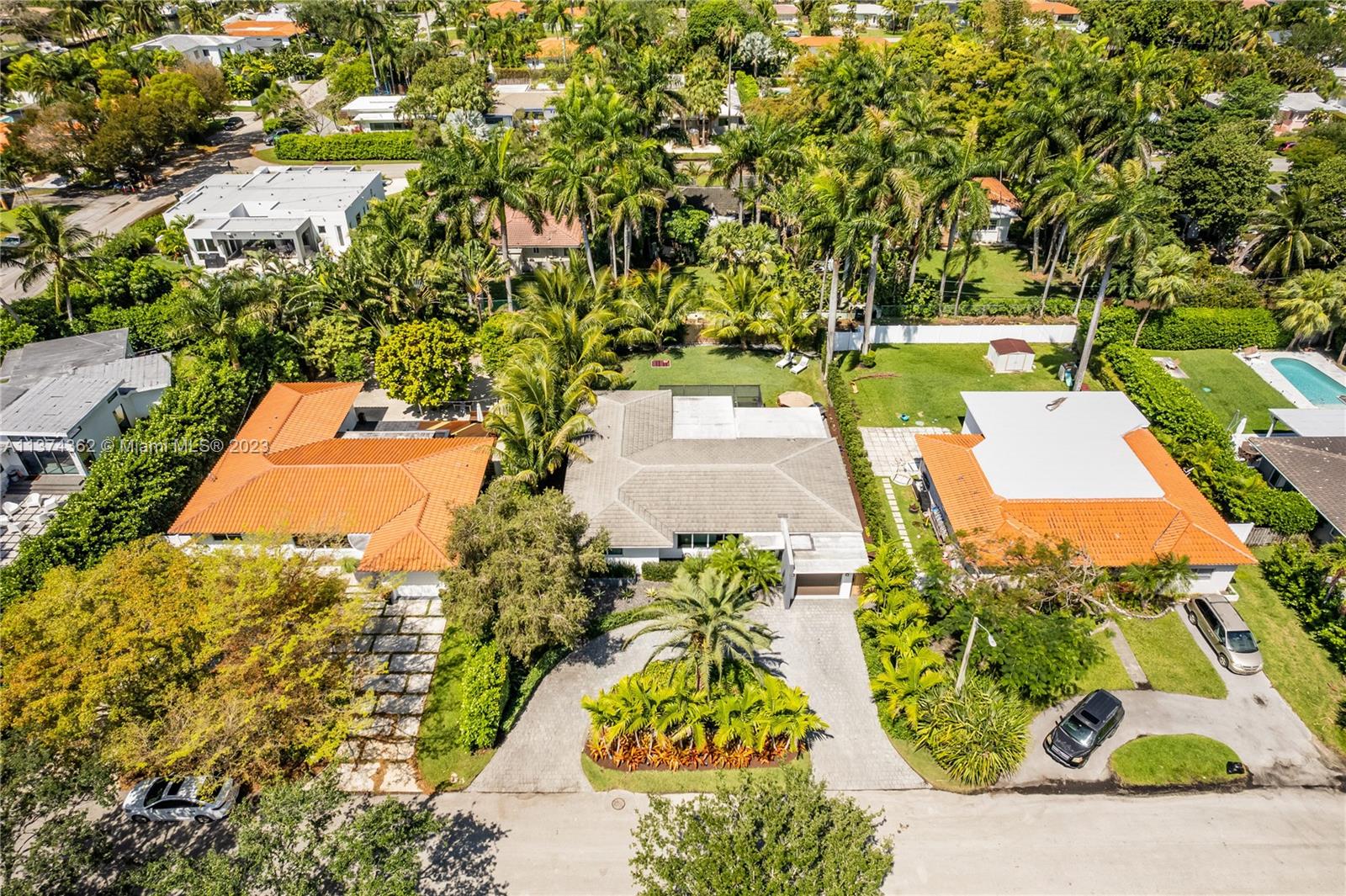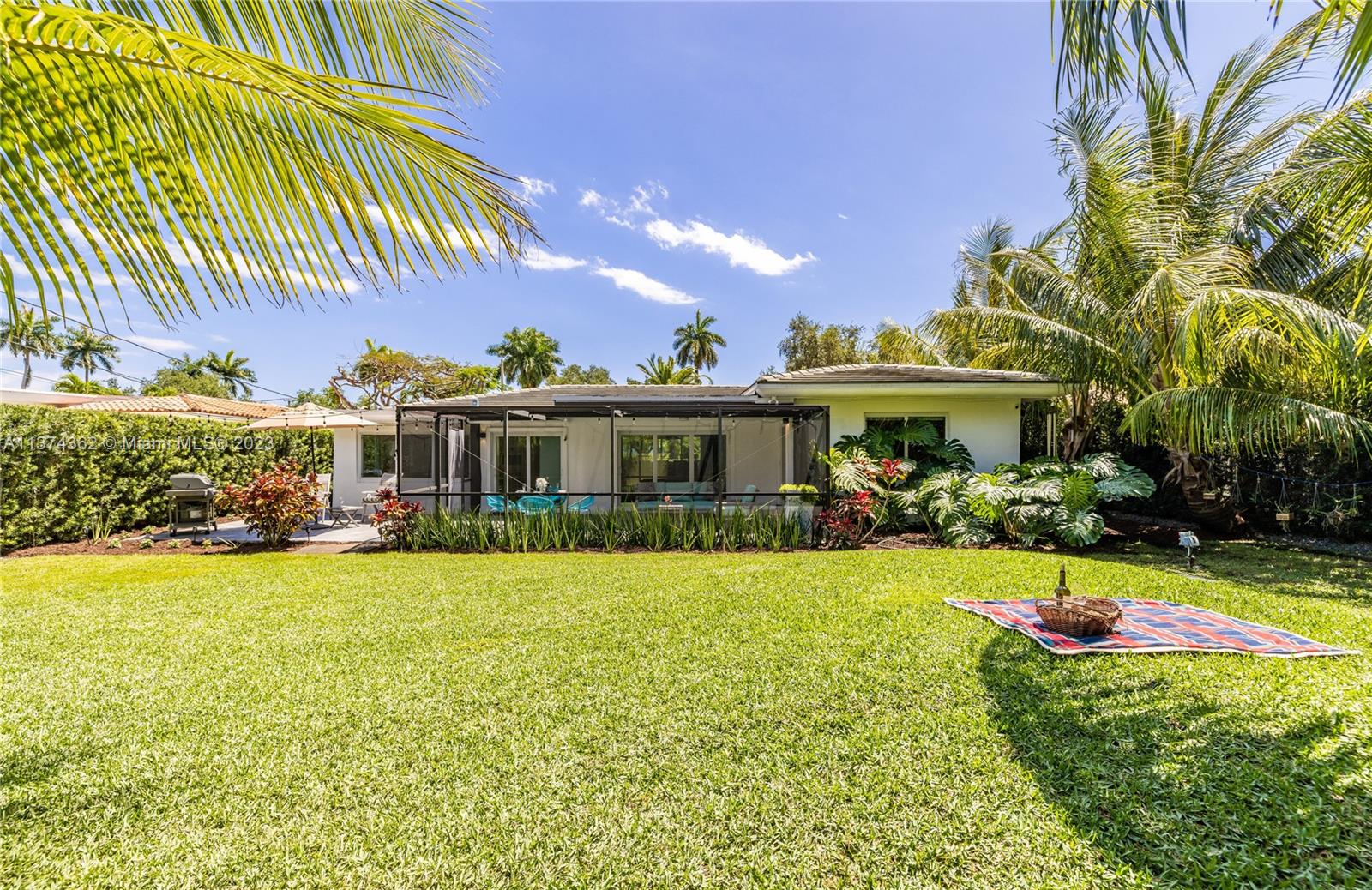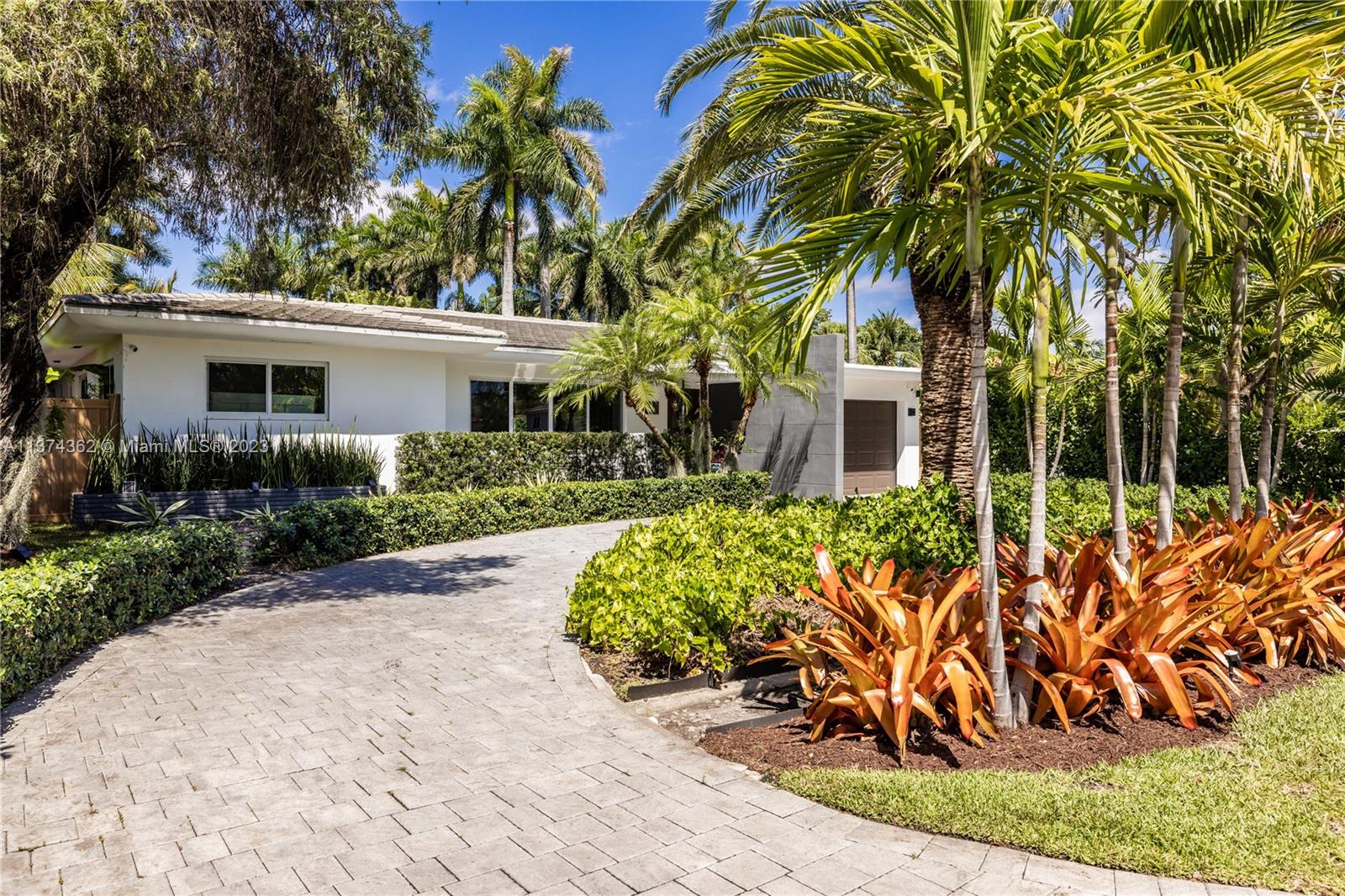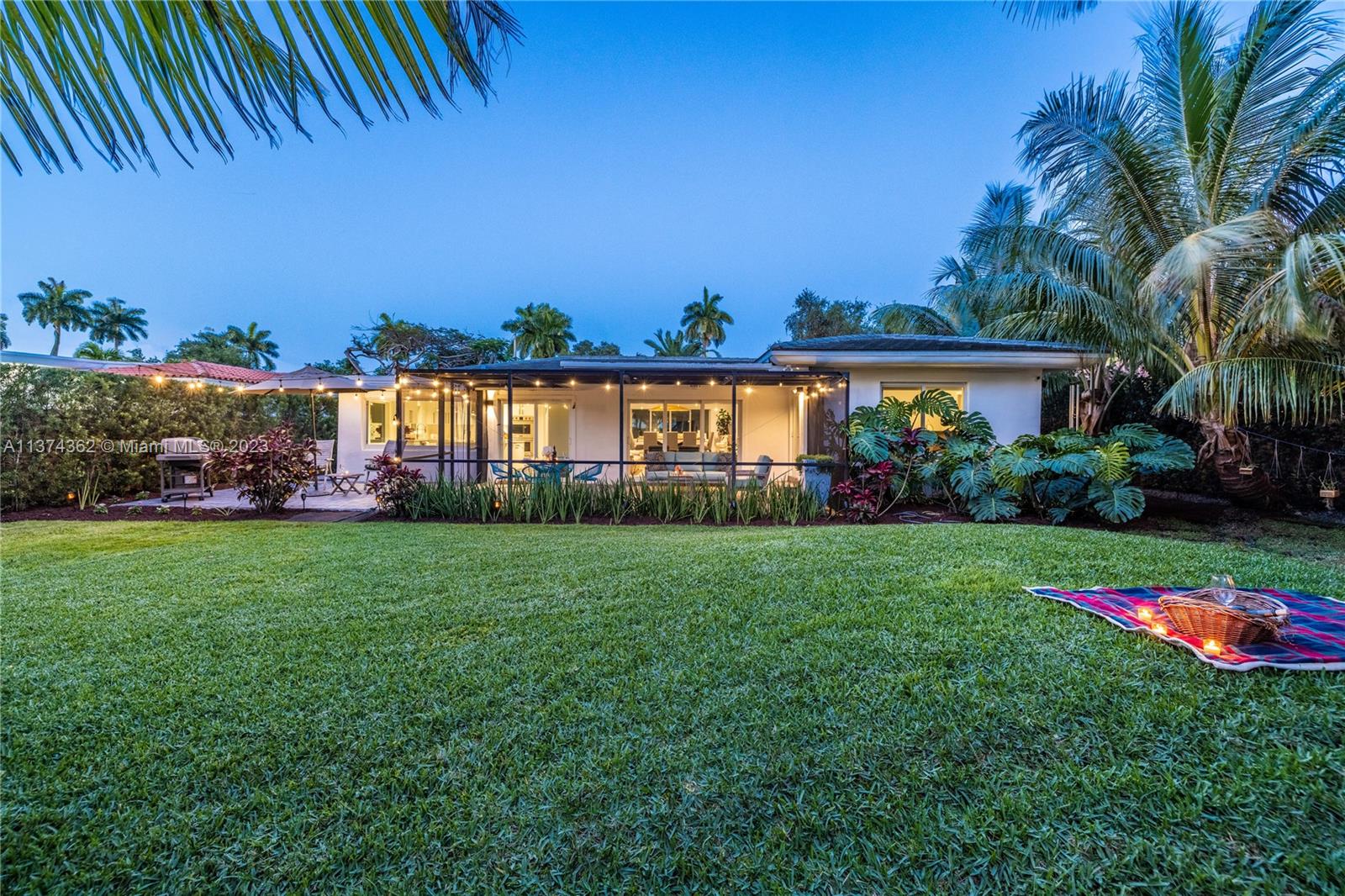 Welcome to Las Palmas! Modern luxurious finishes await you at this beautifully-updated Miami Shores Mid-Century Modern tropical oasis. Enter into light and bright wide open multiple living and dining areas, leading to the grand “live-in” kitchen with a huge eat-in island, a professional grade refrigerator, and two dishwashers for easy entertaining. Three spacious bedrooms including the main en-suite retreat, plus a bonus room perfect as den, office, home gym or 4th guest bedroom. Exit sliding doors to the rear screened porch, open BBQ patio, and lush rolling greens with room for a pool. Carefree living with newer roof, impact windows-doors, updated electric, wood tile plank floors, designer kitchen and baths, plus garage and plenty of guest parking. Come live the good life under the palms!