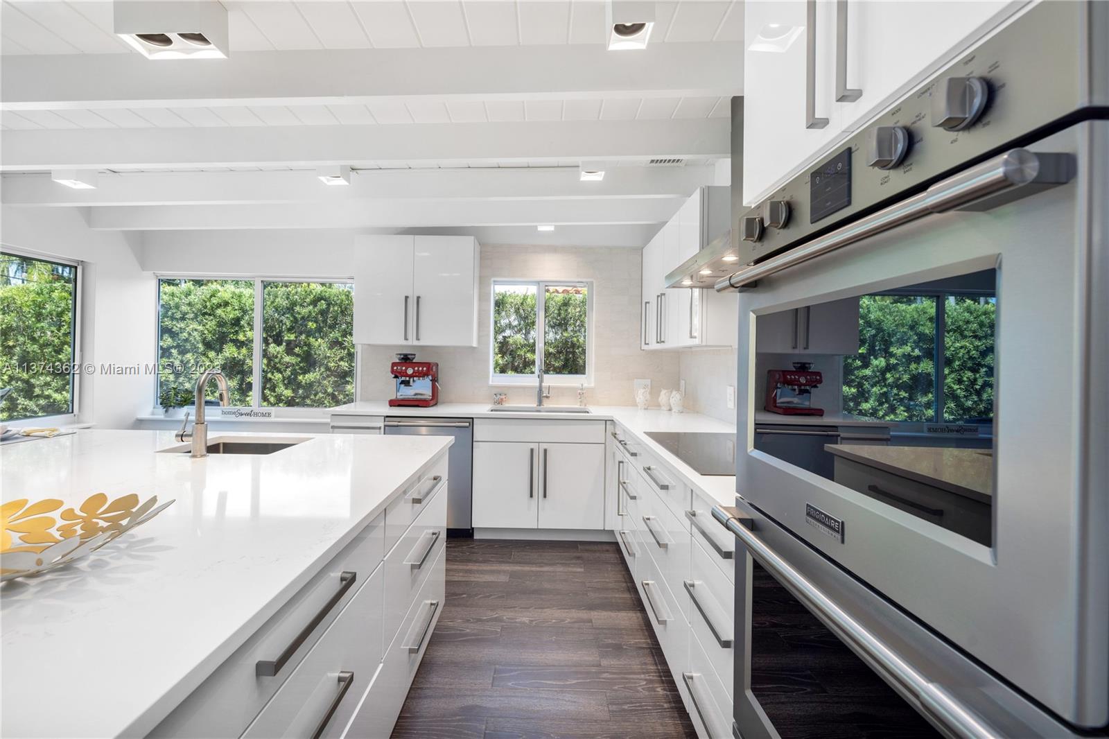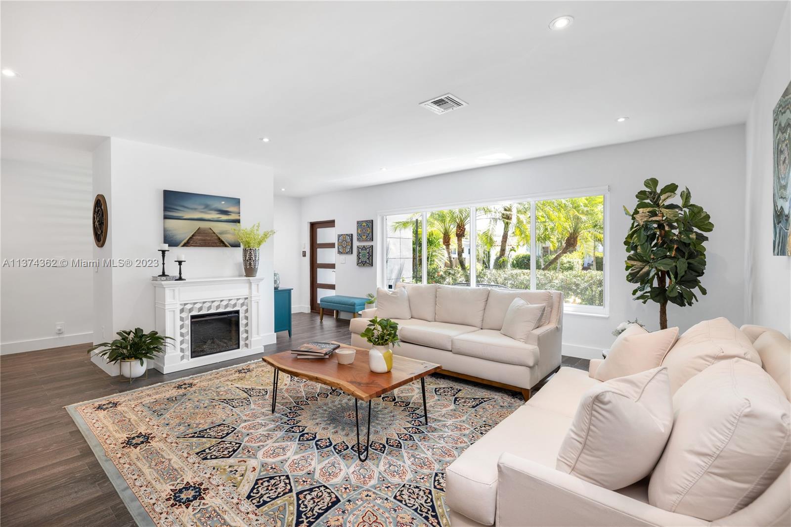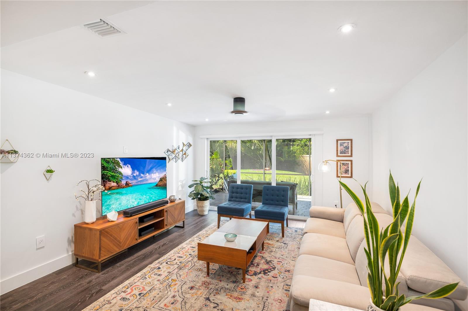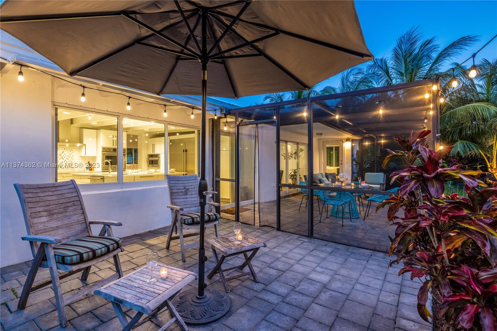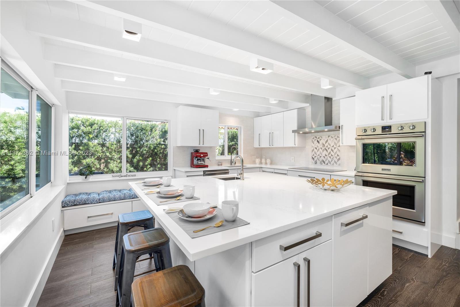 Welcome to Las Palmas! Modern luxurious finishes await you at this beautifully-updated Miami Shores Mid-Century Modern tropical oasis. Enter into light and bright wide open multiple living and dining areas, leading to the grand “live-in” kitchen with a huge eat-in island, a professional grade refrigerator, and two dishwashers for easy entertaining. Three spacious bedrooms including the main en-suite retreat, plus a bonus room perfect as den, office, home gym or 4th guest bedroom. Exit sliding doors to the rear screened porch, open BBQ patio, and lush rolling greens with room for a pool. Carefree living with newer roof, impact windows-doors, updated electric, wood tile plank floors, designer kitchen and baths, plus garage and plenty of guest parking. Come live the good life under the palms!