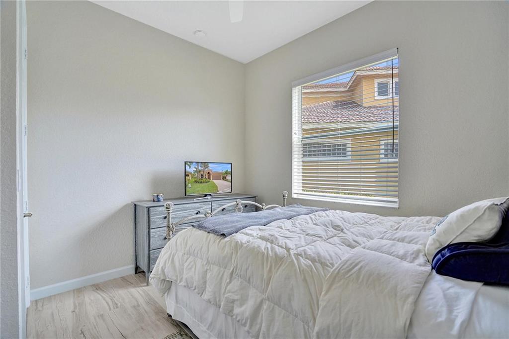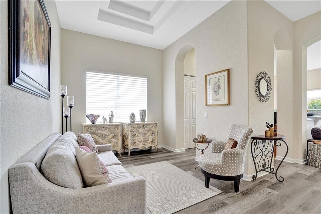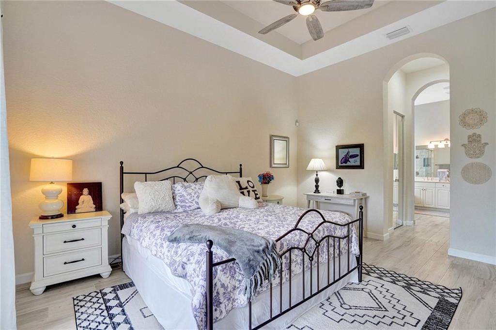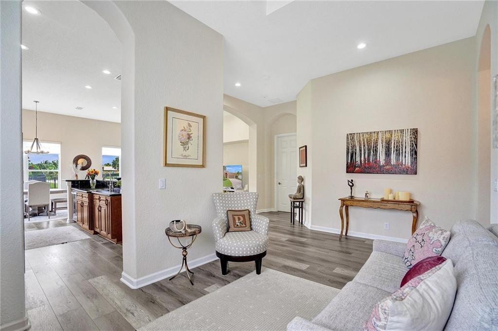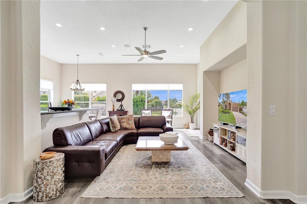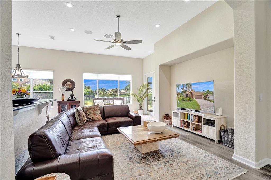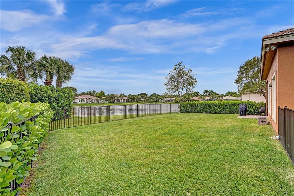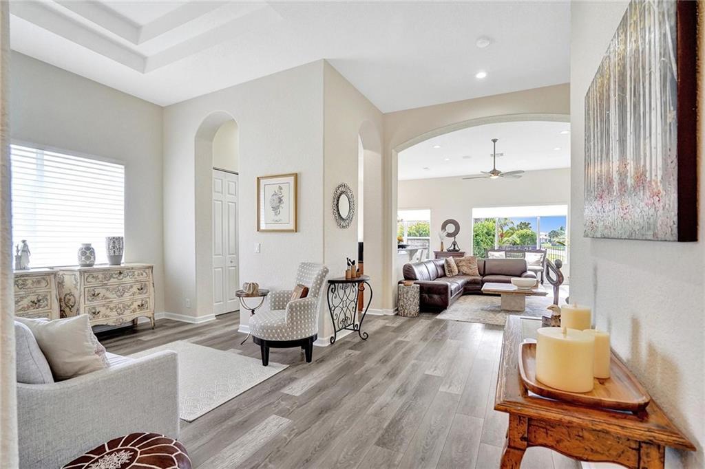 Expansive, updated 3 Bedroom waterfront home on oversized Cul du Sac, fenced lot. Contemporary, open plan w foyer entry, volume ceilings & lake views. Featuring wide plank wood laminate flooring throughout the main areas, wood plank porcelain tile floors in the bedrooms & baths. Spacious living areas, huge kitchen w island, rich wood cabinetry, under counter lighting accents, granite counters, new stainless appliances & plumbing fixtures. Big Master Suite, walk-in closet & stylish updated bathroom w separate tub & large shower. Good sized Bedrooms 2 & 3 w adjacent bath. Lakeside screened patio w fenced yard and privacy hedges. Close by resort caliber pool, clubhouse, gym, party rooms, tennis & pickleball. HOA includes lawn care. Special financing incentives available w Sirva Mortgage.
