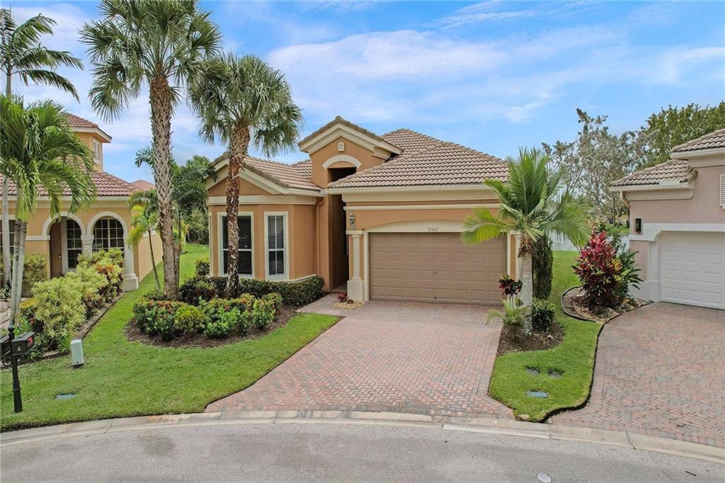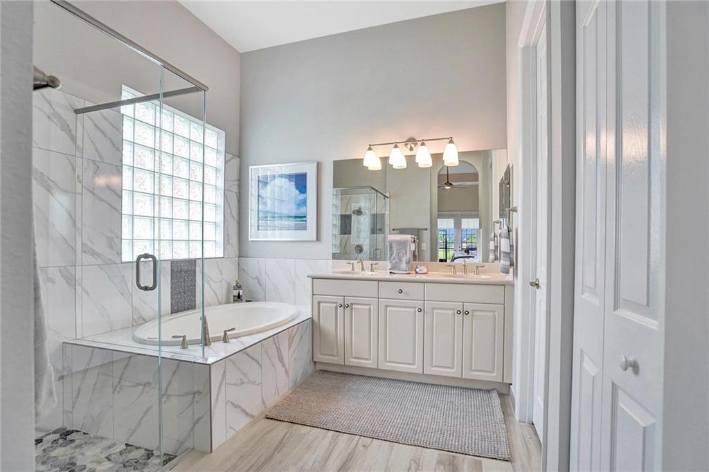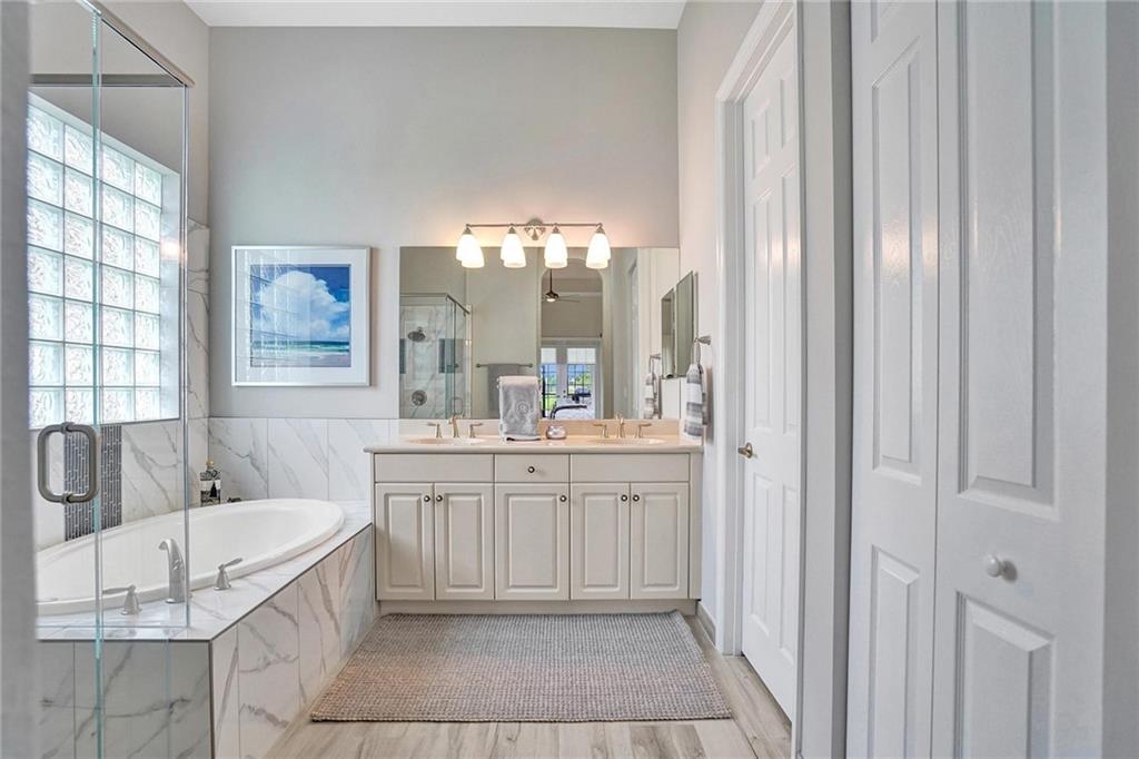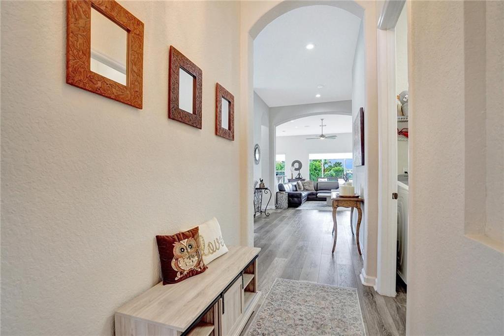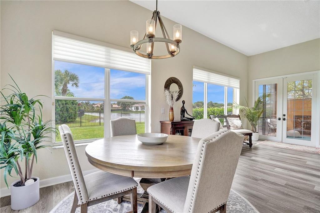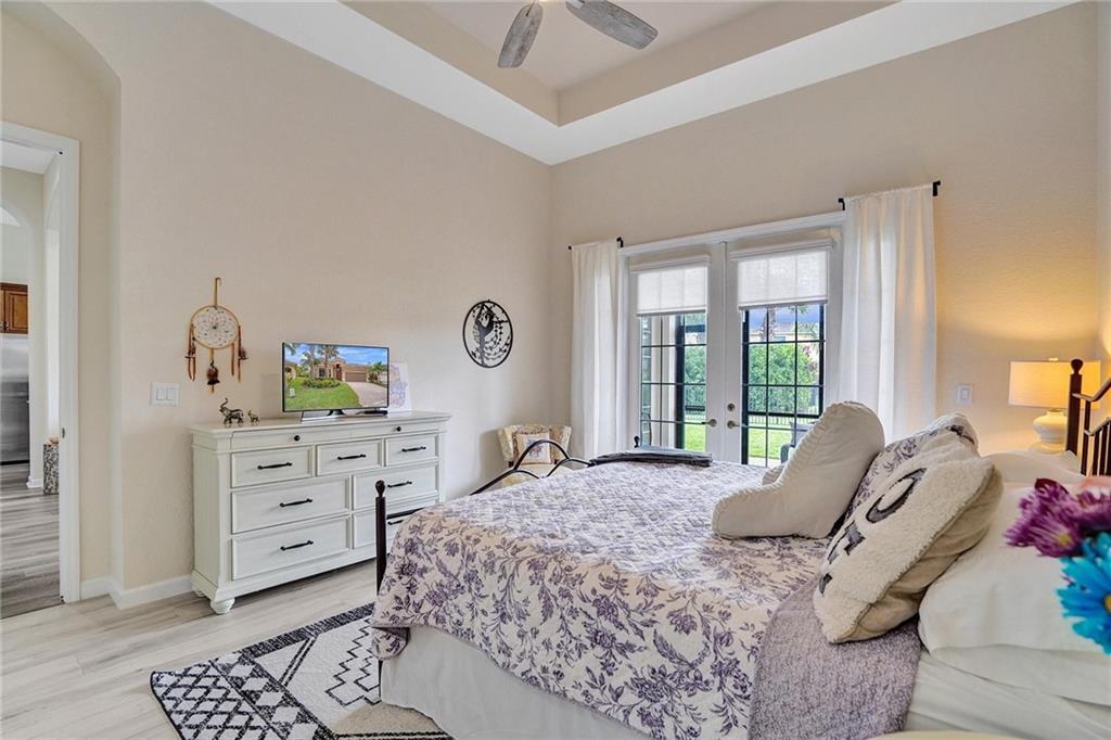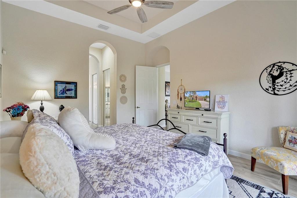 Expansive, updated 3 Bedroom waterfront home on oversized Cul du Sac, fenced lot. Contemporary, open plan w foyer entry, volume ceilings & lake views. Featuring wide plank wood laminate flooring throughout the main areas, wood plank porcelain tile floors in the bedrooms & baths. Spacious living areas, huge kitchen w island, rich wood cabinetry, under counter lighting accents, granite counters, new stainless appliances & plumbing fixtures. Big Master Suite, walk-in closet & stylish updated bathroom w separate tub & large shower. Good sized Bedrooms 2 & 3 w adjacent bath. Lakeside screened patio w fenced yard and privacy hedges. Close by resort caliber pool, clubhouse, gym, party rooms, tennis & pickleball. HOA includes lawn care. Special financing incentives available w Sirva Mortgage.