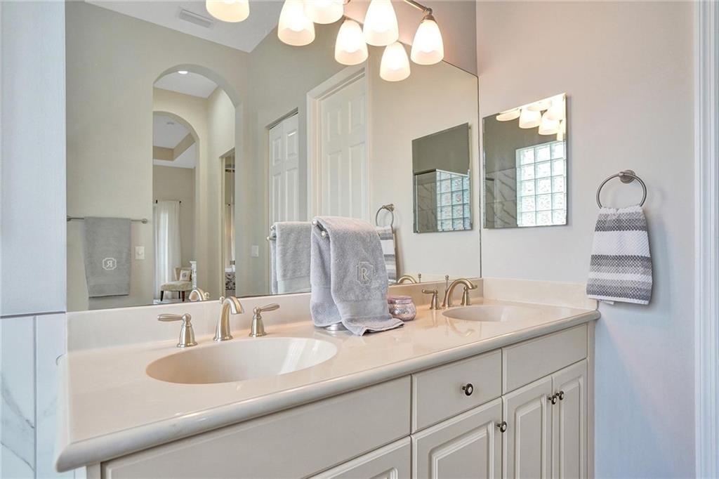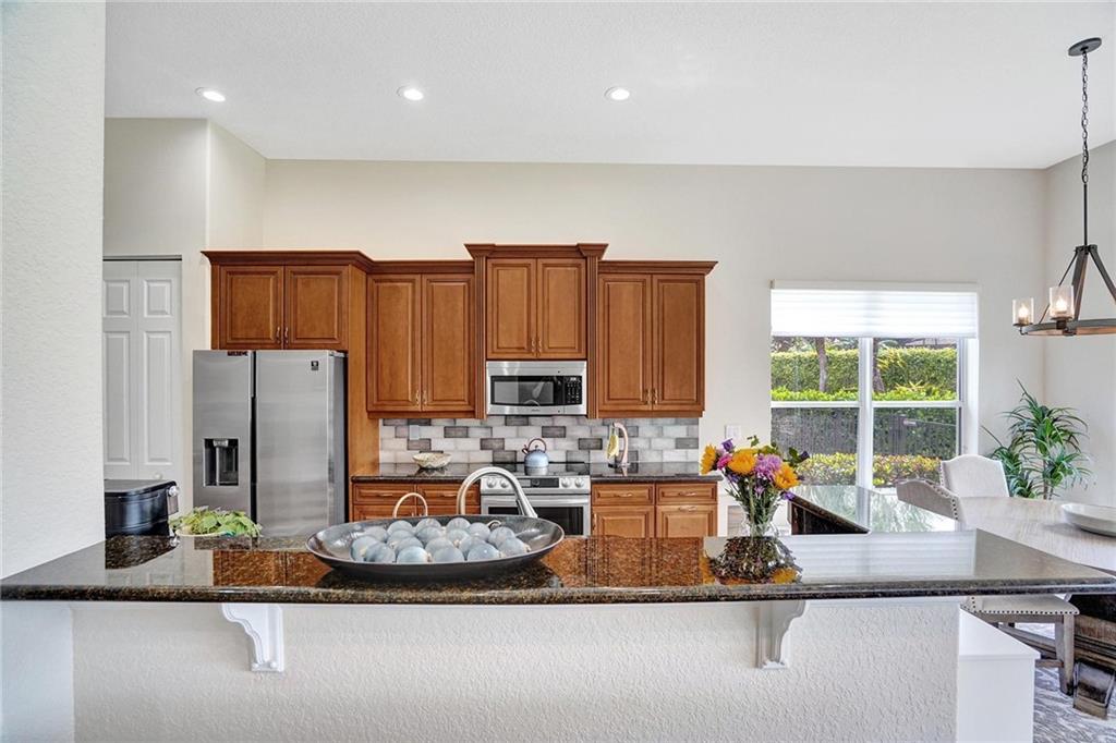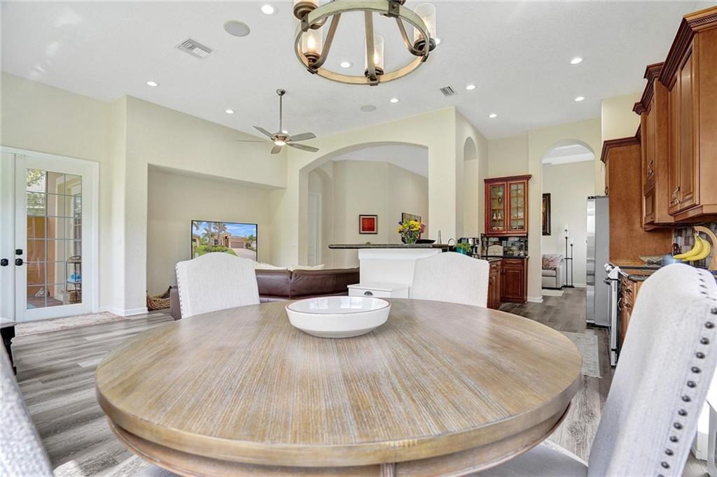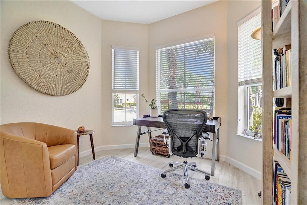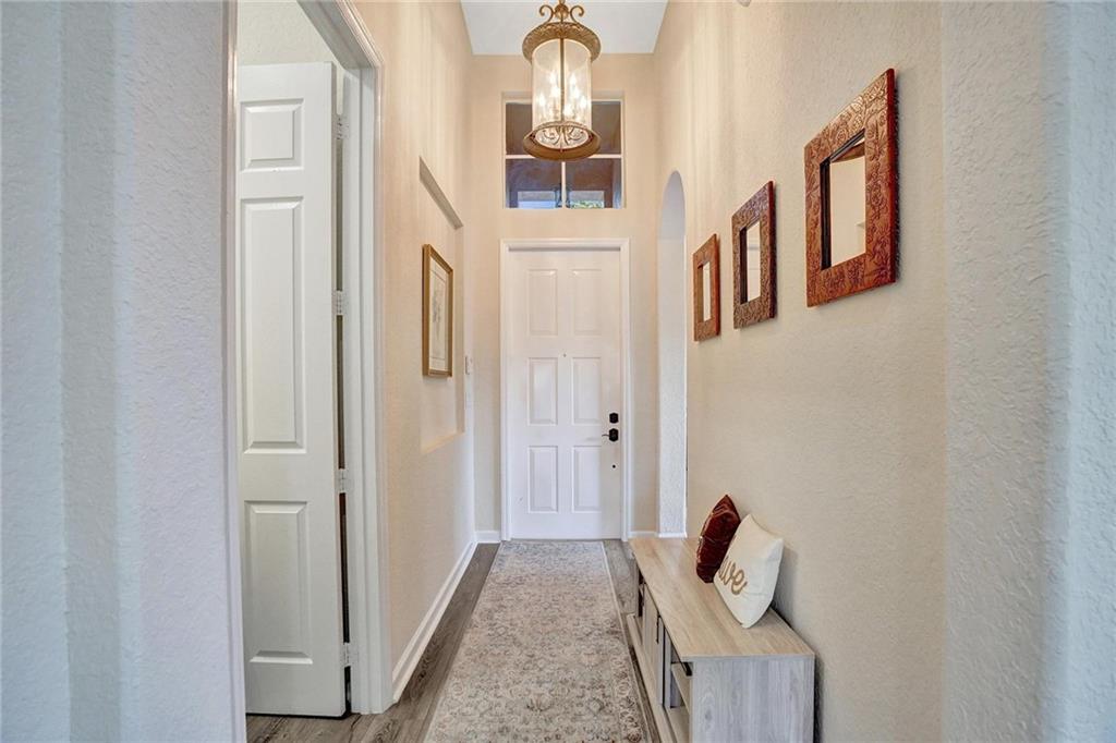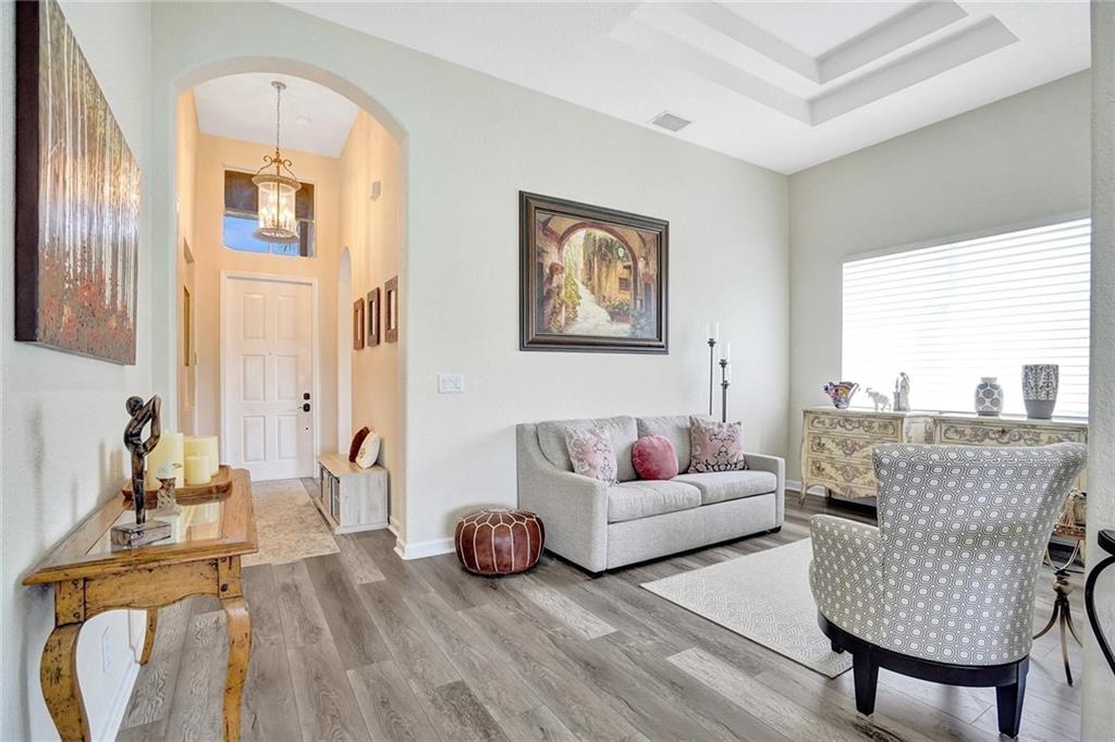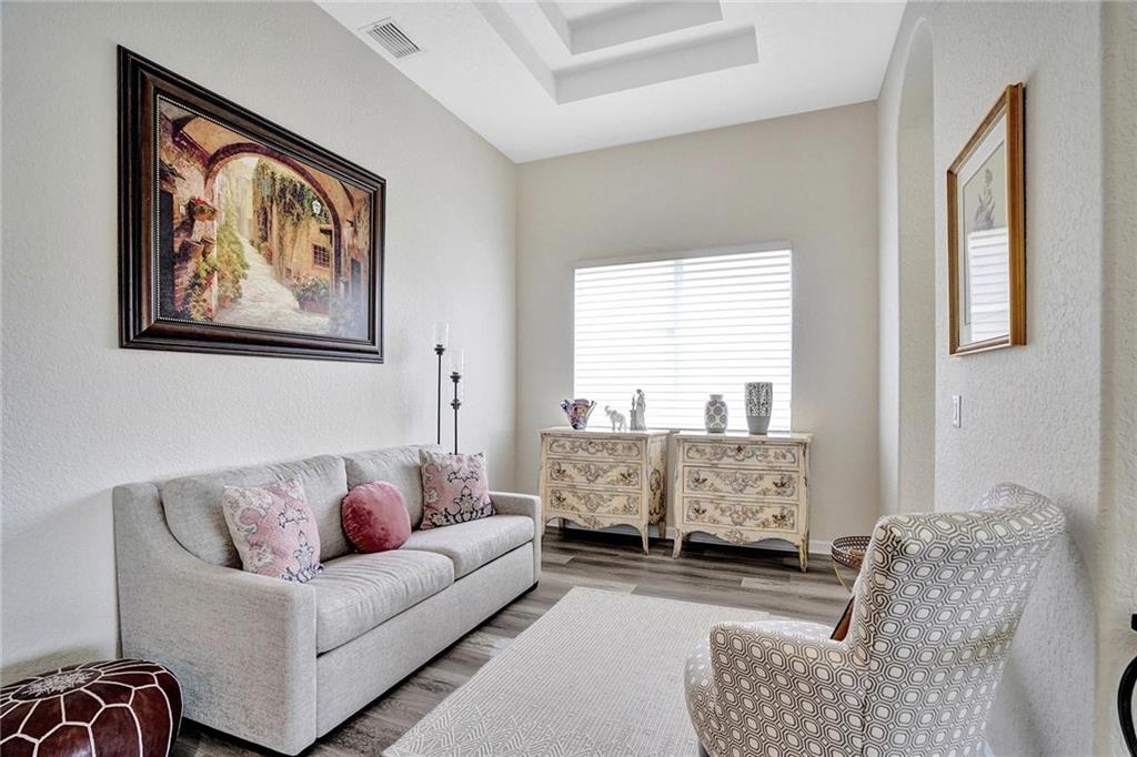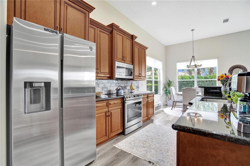 Expansive, updated 3 Bedroom waterfront home on oversized Cul du Sac, fenced lot. Contemporary, open plan w foyer entry, volume ceilings & lake views. Featuring wide plank wood laminate flooring throughout the main areas, wood plank porcelain tile floors in the bedrooms & baths. Spacious living areas, huge kitchen w island, rich wood cabinetry, under counter lighting accents, granite counters, new stainless appliances & plumbing fixtures. Big Master Suite, walk-in closet & stylish updated bathroom w separate tub & large shower. Good sized Bedrooms 2 & 3 w adjacent bath. Lakeside screened patio w fenced yard and privacy hedges. Close by resort caliber pool, clubhouse, gym, party rooms, tennis & pickleball. HOA includes lawn care. Special financing incentives available w Sirva Mortgage.