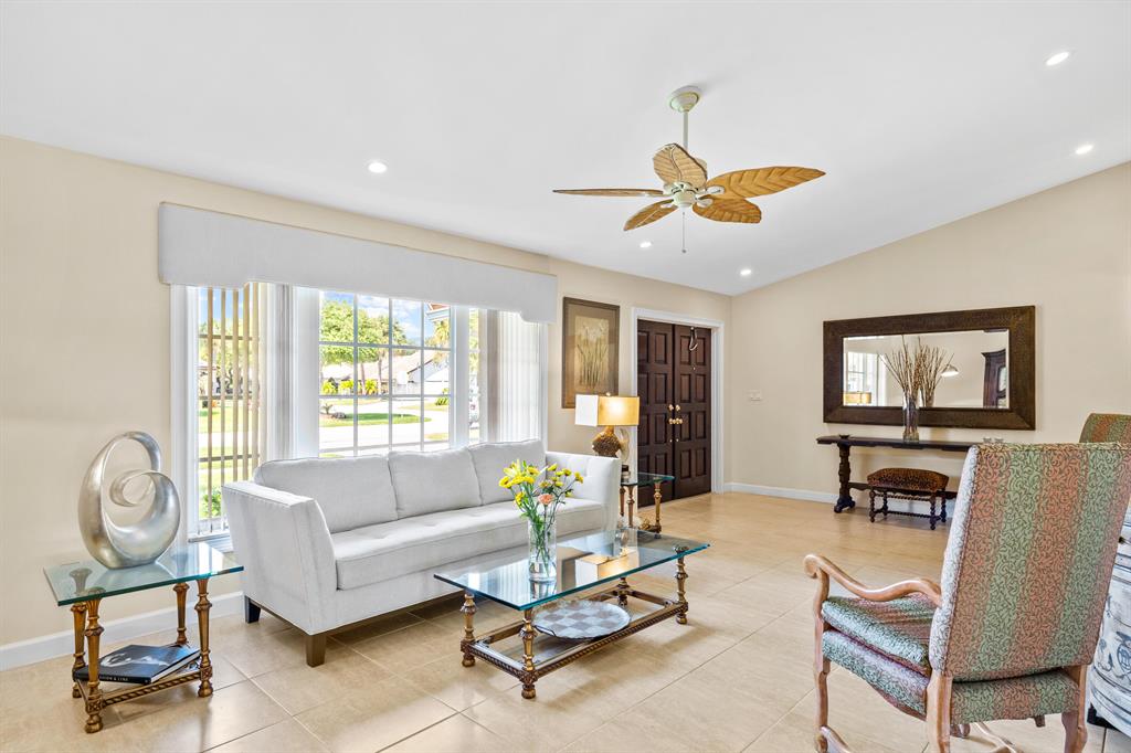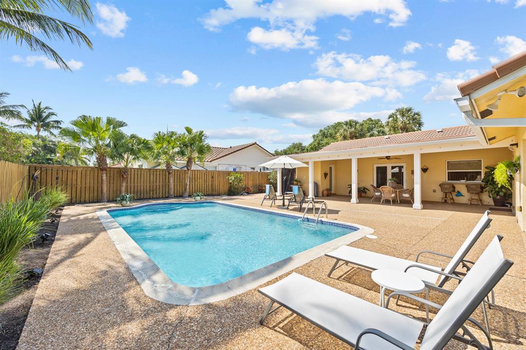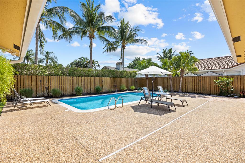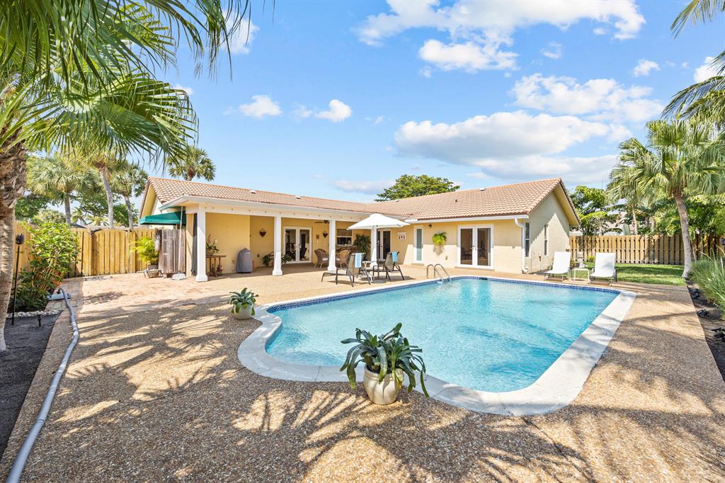 This 4-bedroom and 2-bath home is a must-see! It is beautifully maintained and conveniently located in the desirable community of Camino Lakes in East Boca Raton. This home offers a sunny, bright and spacious split floor plan. 2 cabana bath and french doors in living room and dining room access leading out to a covered patio and a large fenced in yard with a pool. Vaulted ceilings throughout the family room, dining and kitchen area. The master suite also features vaulted ceilings, beautiful trimming and molding finishes throughout. The master bath has a dual sink vanity, walk in closet and a step down shower. All bedrooms have custom wooden plantation shutters. Porcelain tile floors throughout the home. The entire house has a Culligan filtered water softener system.