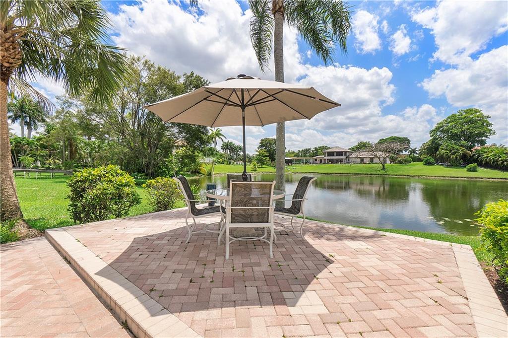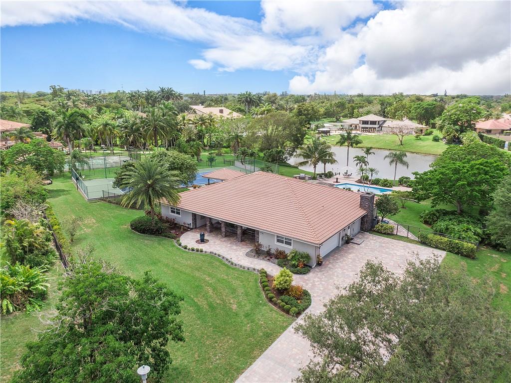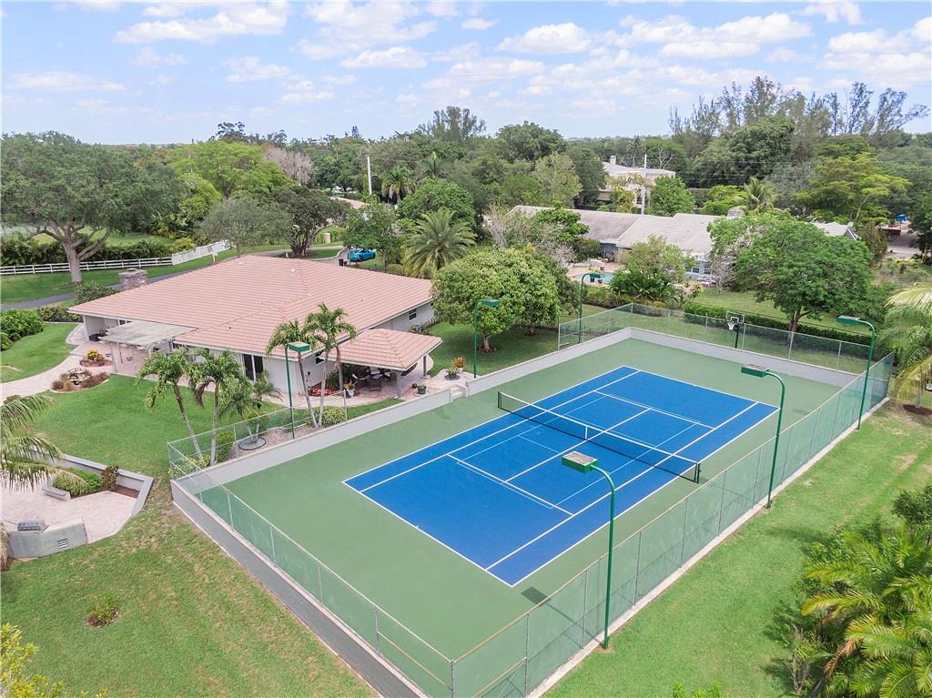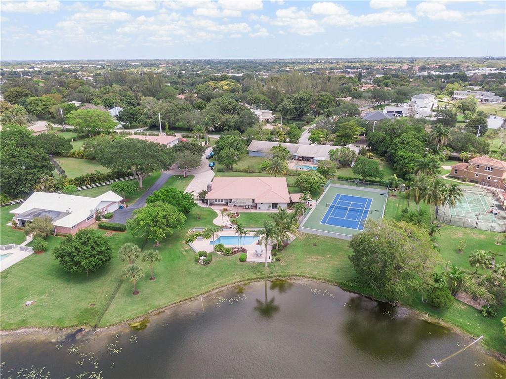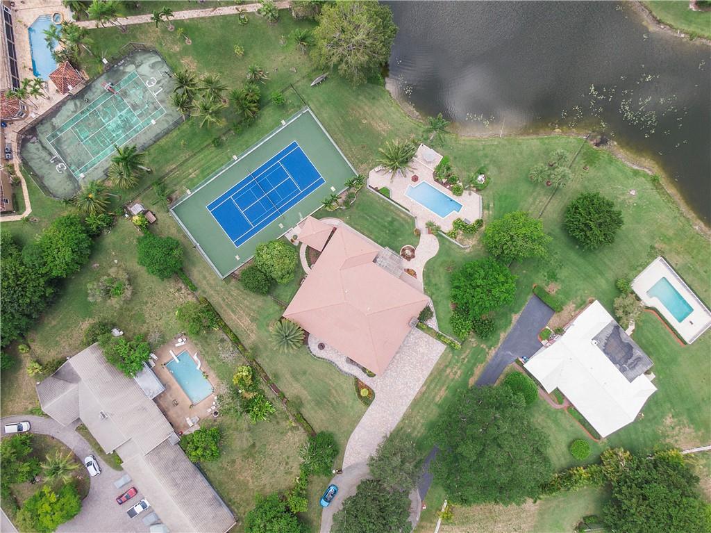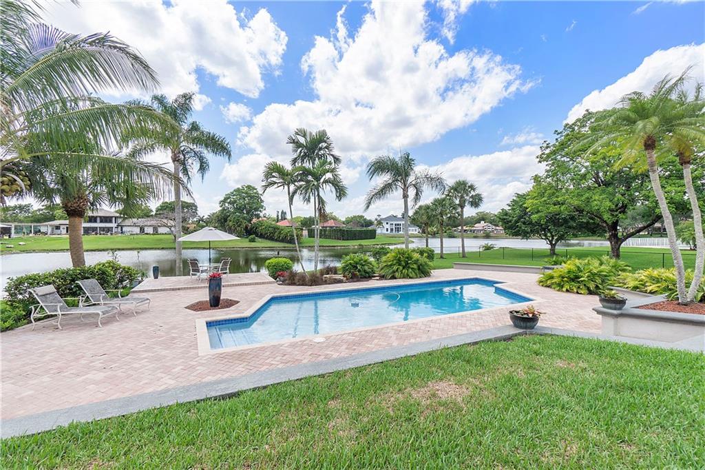 Waterfront estate sits on 1.5 Acres in no HOA community- private tennis court! Impact windows & hip roof for optimal insurance savings, gourmet kitchen with adjoining Sunroom, & an office that can serve as a den or 5th bedroom. Remaining bedrooms stacked away from common areas- with 2 guestrooms, positioned at the front of the home, and sharing a Jack & Jill bathroom. Cabana bathroom leads out to a shaded gazebo, fruit trees, & private tennis court; it flanks a 3rd guestroom. The primary bedroom offers water views & ample closets. The primary bathroom boast a double vanity, large shower, & separate soaking tub. The backyard is fenced, allowing easy enjoyment of the manicured grounds. Whether kayaking the lake, lounging poolside, or hosting sunset parties this property is sure to "Wow!"
