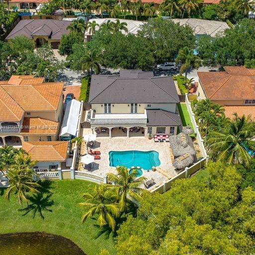 Lakefront mediterranean home with elegant iron stairwell which leads upto the large masterbedroom with balcony overlooking the waterviews . This home has 4 bedrooms plus a loft which can be converted into a 5th bedroom and 3 bathrooms. Gourmet kitchen opens to the family room and breakfast nook, beautiful living room and formal dining room, many windows illuminating the home with natural light and frech doors which open to the pool patio with 2 chickee huts with an outdoor kitchen and lage pool with jacuzzi by the serene lake.