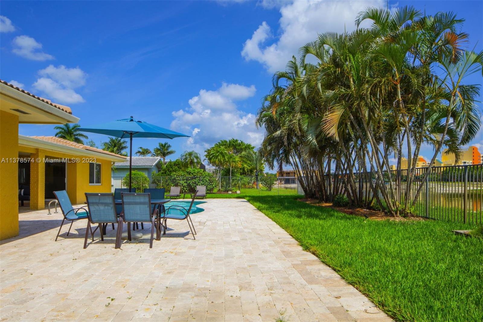 All 2400 sq. ft of this home are thoughtfully designed to achieve ultimate comfort, practicality, and luxury. The circular paved driveway and well-kept tropical landscaping welcomes Buyers to the front of the home, where they’ll find a spacious dining room area and living room. Natural light pours in through the large windows and glass sliding doors to the patio. Step outside and enjoy the shade provided by the patio roof, perfect for a poolside lunch. owners and Renters will be pleased to see the inviting pool, fenced in and surrounded by lush landscaping, a canal, and grassy areas for pets to play.