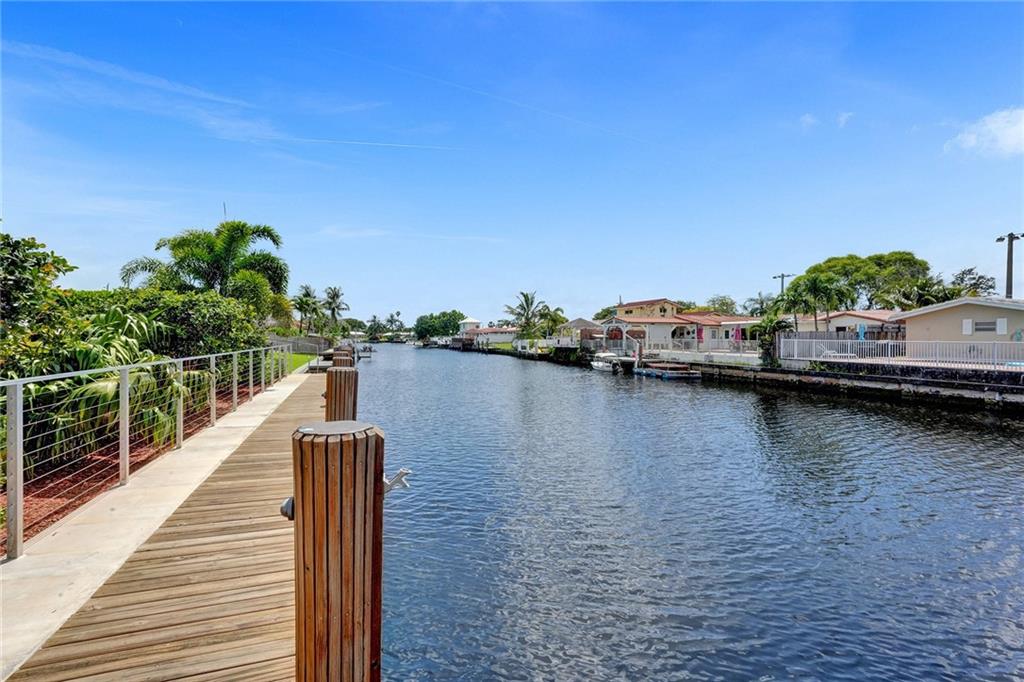 Stunning turnkey Coral Ridge Isles Waterfront property! Over 277k worth of upgrades with current owners, all permitted!! Three sun drenched bedrooms each with walk in closets and 2 oversized bathrooms with dual sinks draped in Calcutta Quartz countertops. 24x48 Porcelain Stone flooring throughout seamlessly transitioning one living space to the next. Large bright kitchen is equipped with solid wood shaker style cabinetry, Calcutta Quartz countertops and top of the line Stainless Steel Appliances. Backyard features 75 linear feet of waterfront, sparkling resort style pool and patio. Brand new seawall and full length dock with electric add extra charm to this already amazing property. Hurricane Impact windows and doors throughout plus 2 car garage. No HOA! Don't walk to this property...run!
