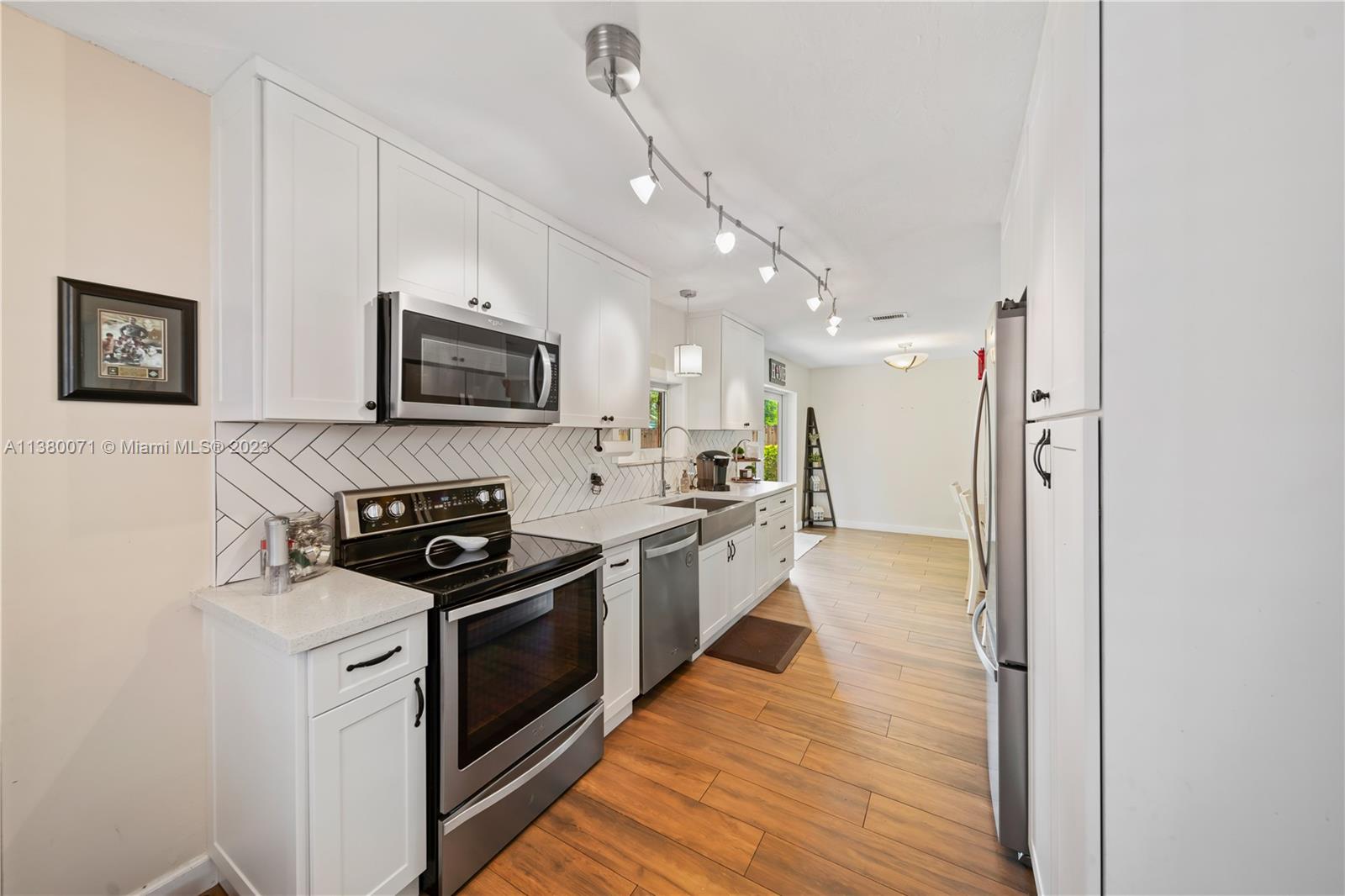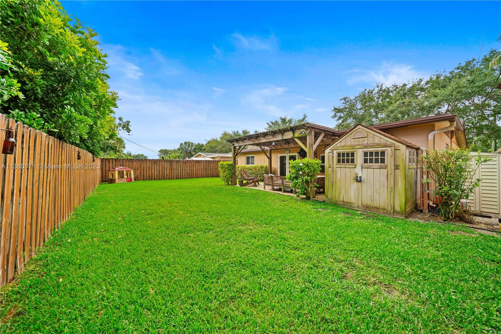 Beautifully updated family home in the heart of Cooper City! Open floor plan highlights the sleek kitchen with white quartz countertops, farmhouse sink, stainless appliances, and built-in office area. Spacious living/dining room with French doors to patio. Primary bedroom has wood slat ceiling, crown molding, and walk-in closet. Both bathrooms have been renovated, with a spa tub in the hall bath. Tile floors (with wood look) throughout. Interior utility closet. Newer A/C system. IMPACT GLASS windows and doors. Big fenced back yard with gazebo-style patio and storage shed ... and plenty of room for a pool. Double wide driveway. Covered front patio. Roof replaced in 2014. EXCELLENT SCHOOLS ... all A-rated. Nearby shopping, restaurants, access to highways.