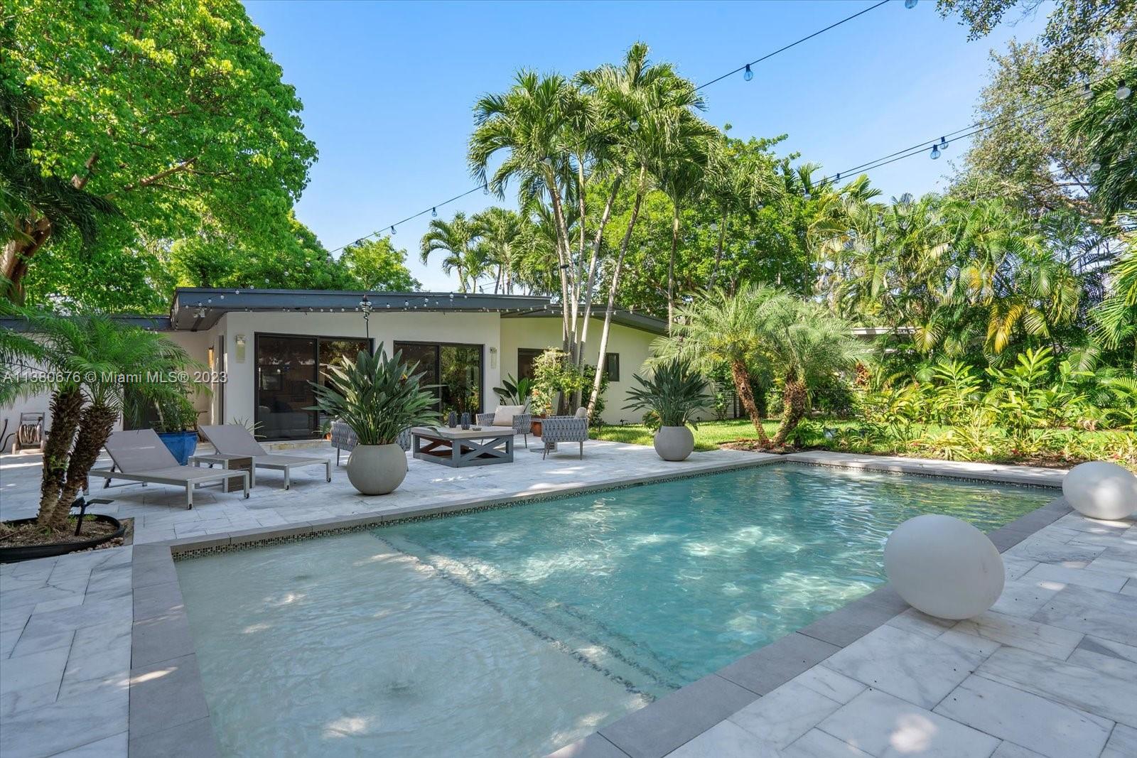 Welcome home to this tastefully newly remodeled tropical oasis located in Miami Shores just steps away from the bay. Featuring 3 spacious bedrooms and 2 bathrooms with an open layout showcasing incredible views of the pool and lush backyard (perfect for entertaining & family gatherings), a large family room, ample living room, open chef’s kitchen with marble countertops, newer appliances, double wall oven, gas stove, large kitchen island with seating, built in wine cooler, plenty of counter space & cabinetry, high impact windows & doors and oversized Italian ceramic tile throughout. This home sits on a 10,625 SF lot and includes an attached single car garage. Miami Shores is one of the most desirable neighborhoods in Miami, centrally located with easy access to major streets and highways.
