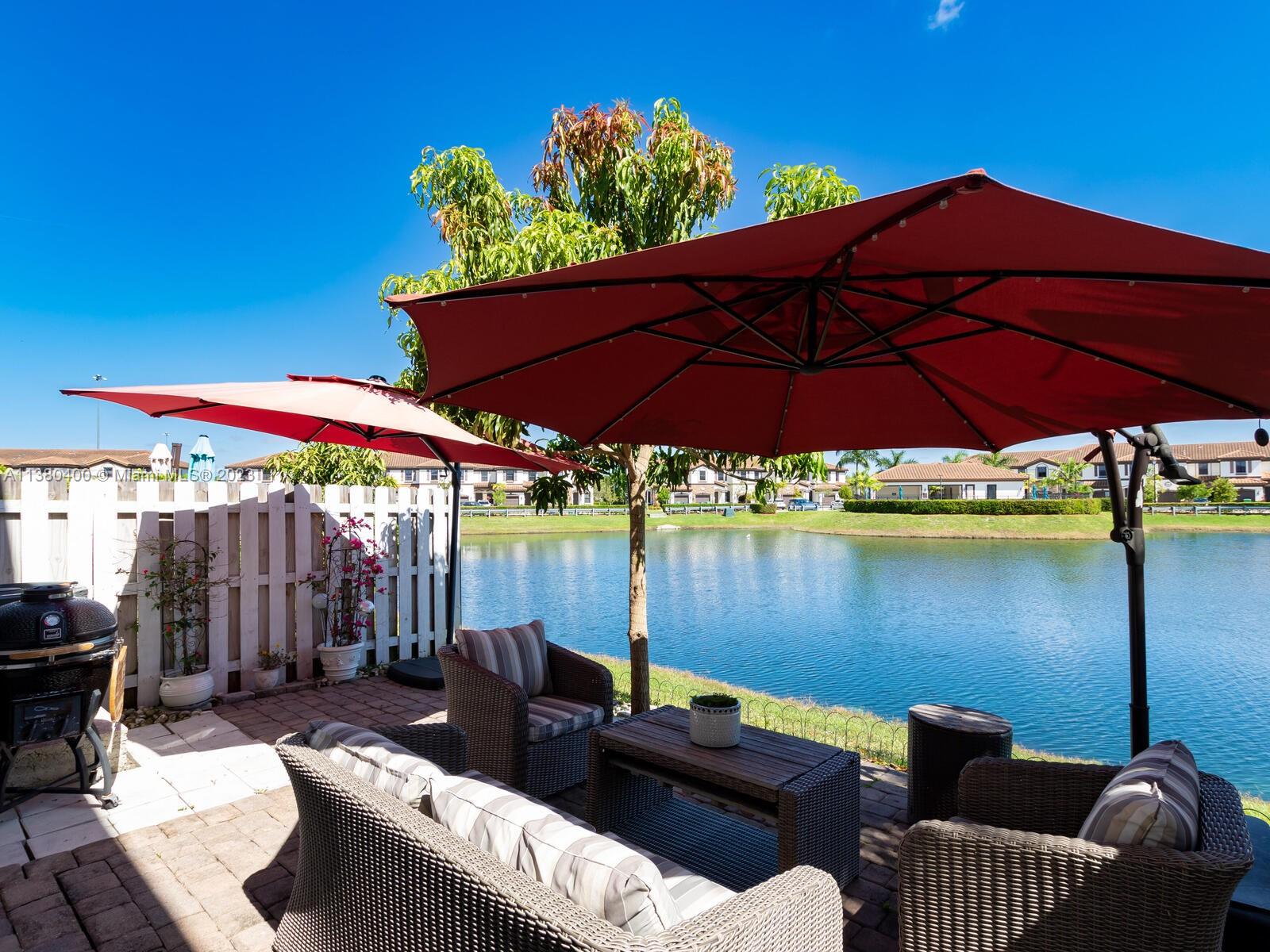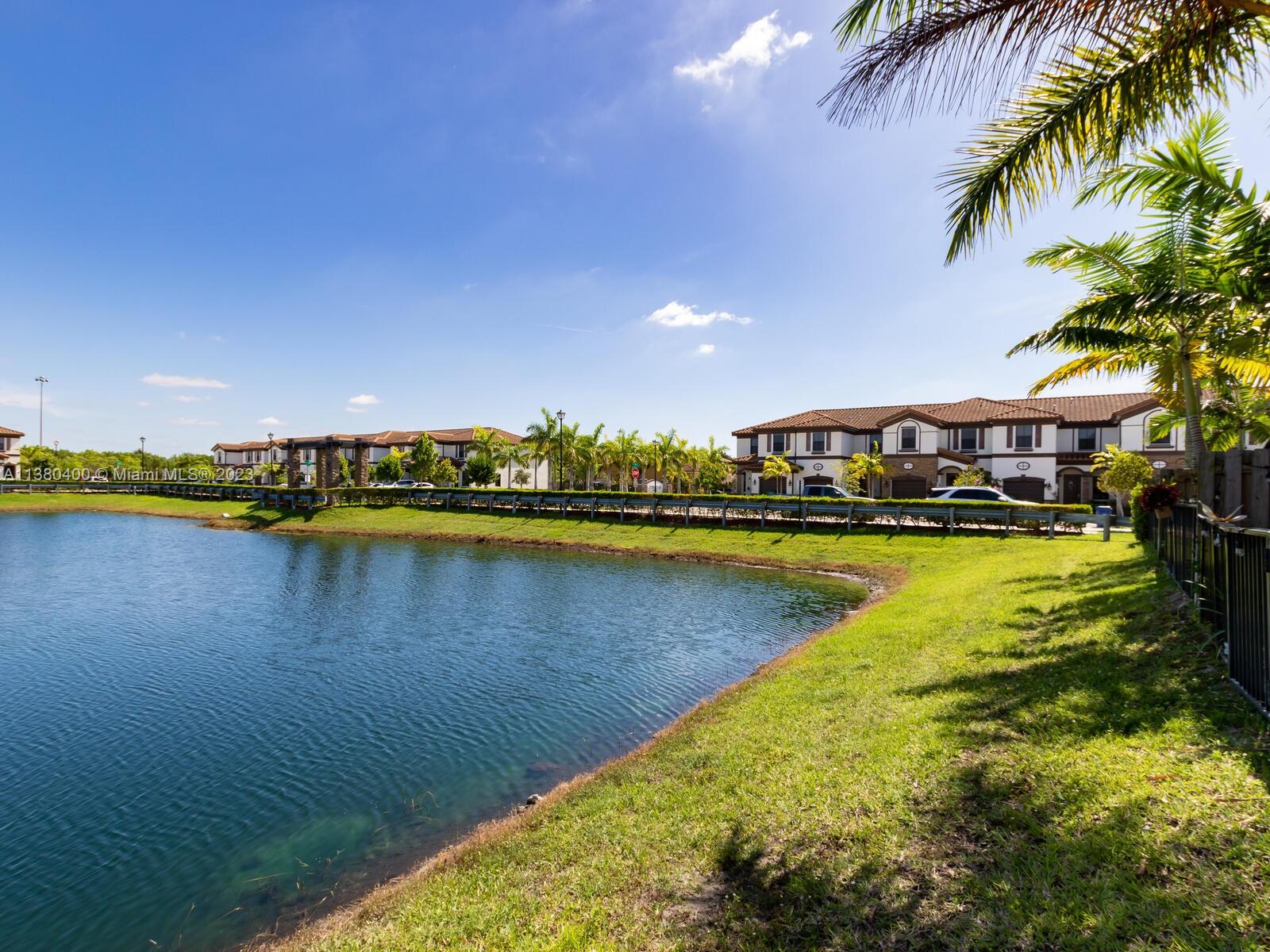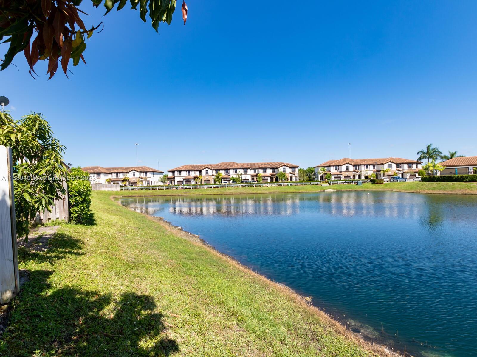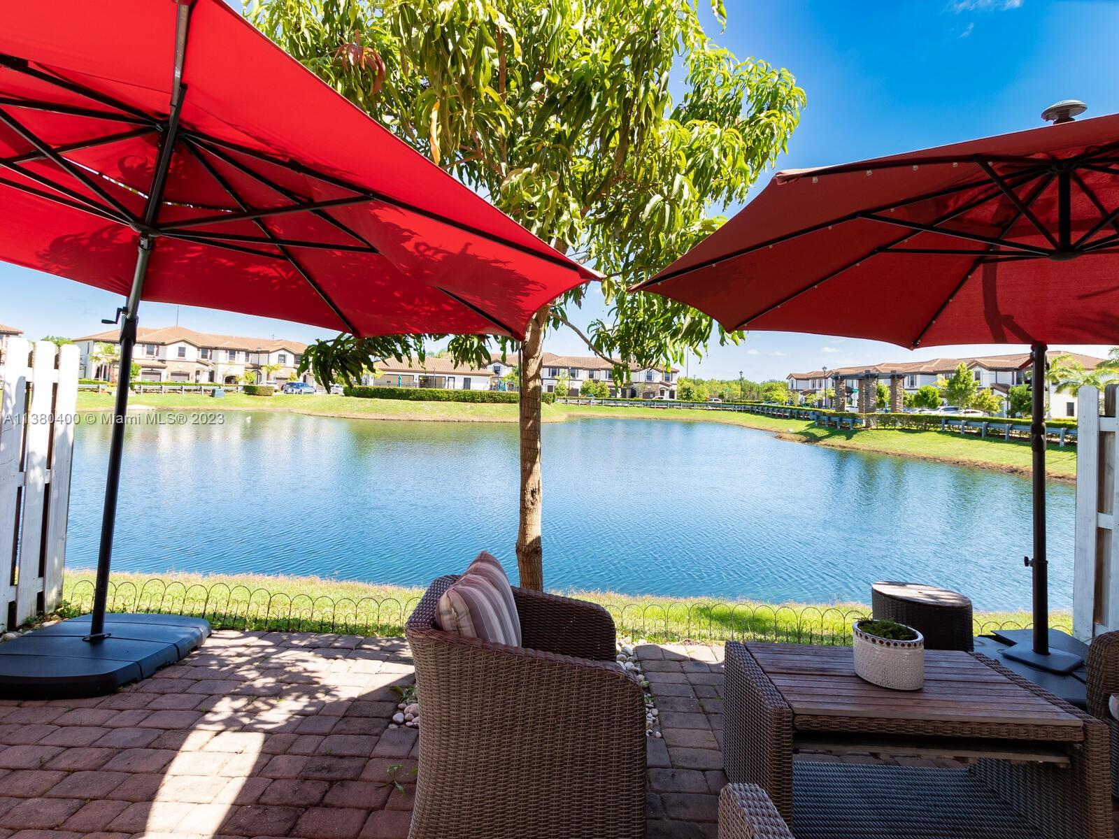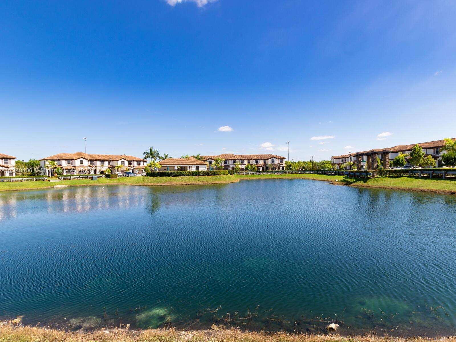 This immaculate lakefront townhome is a true gem located in the boutique community of Turquesa by Lennar. Its inviting atmosphere is evident from the moment you step through the door. Home features tile flooring, wood laminate flooring in staircase, spacious kitchen, refrigerator, dishwasher, disposal, microwave, range, tankless water heater, smart technology thermostat, accordion shutters, security cameras, large closets, washer & dryer conveniently located on second floor, ceiling storage in garage and paved backyard. Tranquil master suite boasts an ensuite bathroom with separate shower. Outdoor area is perfect for morning coffee and enjoying stunning views of the peaceful lake. This rare opportunity to own a lakefront home in a boutique community won’t last long!