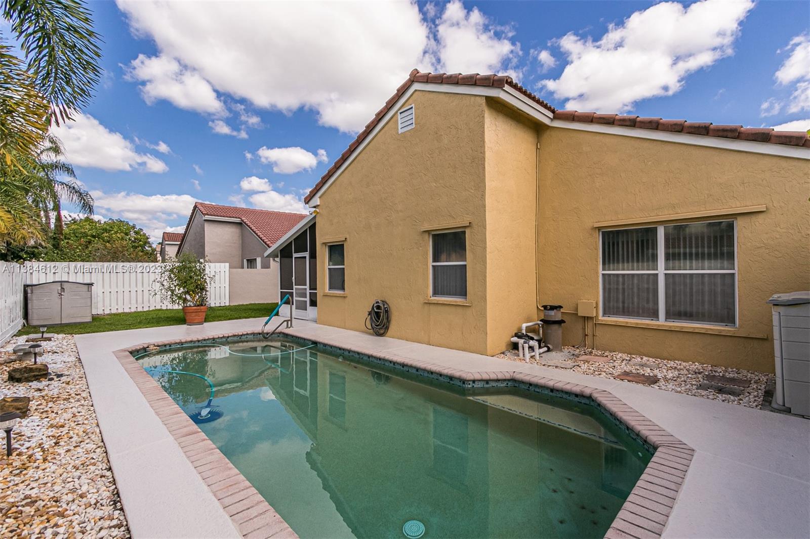 Beautiful 3/2 home with 2 car garage. Screened in patio leading to deck with swimming pool. Spanish tile roof. Steel panel hurricane shutters. Updated electrical panels with dedicated line for electric car charging. Interior jacuzzi tub. Master walk in stall shower.