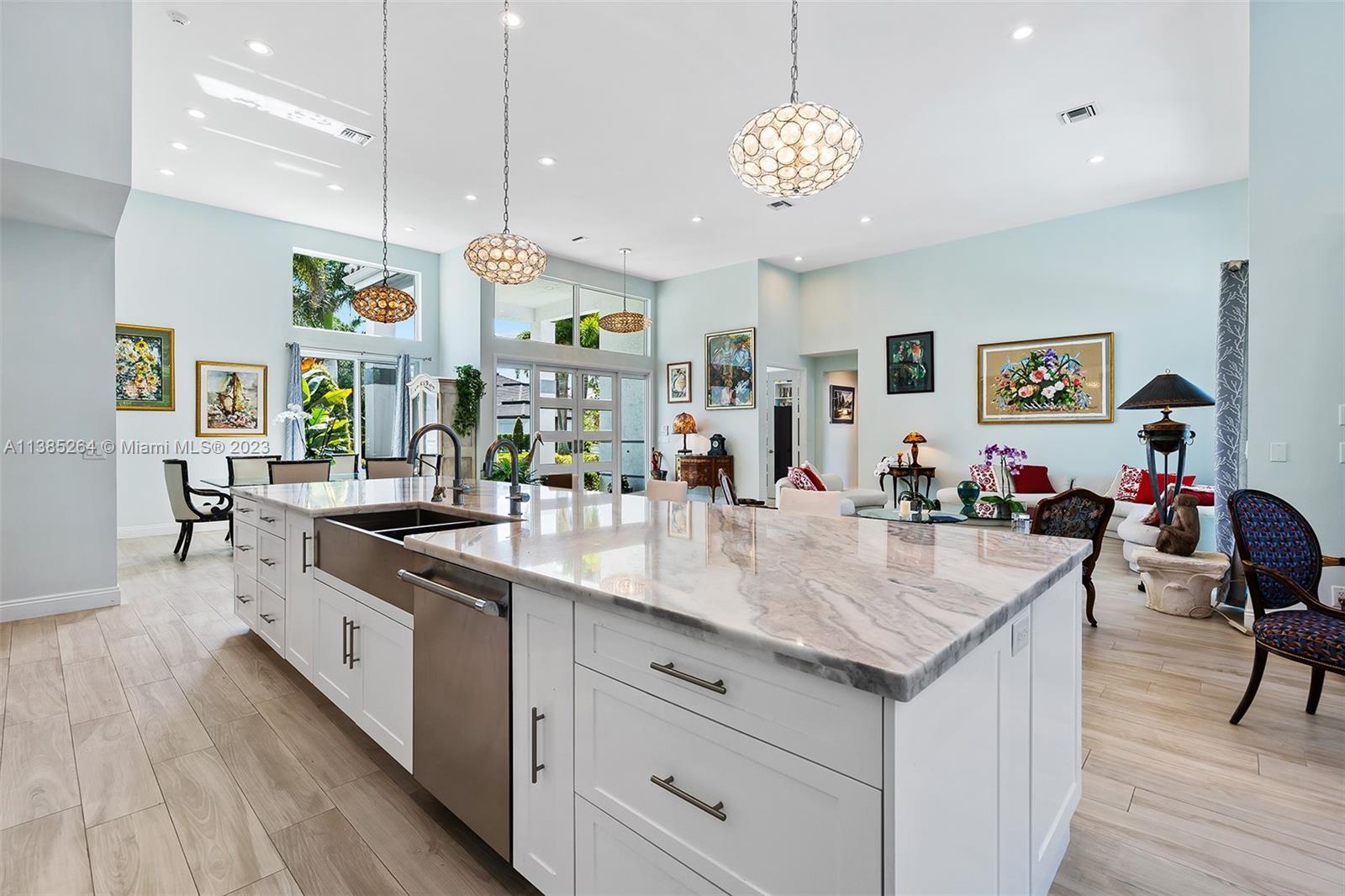 Beautifully remodeled, one story, 3 bedroom, plus office, 3.5 bath home in prestigious St. Andrews Country Club. Light and bright, modern open concept floor plan with volume ceilings and impact windows and doors. Designer finishes include porcelain flooring throughout, chef’s kitchen with marble countertops, top of the line appliances by Jenn Air and Thermador with large walk-in pantry. Primary suite with custom closet and luxurious bath with free standing soaking tub. 2 lovely patios with pool and golf course views. 2 car + golf cart garage.