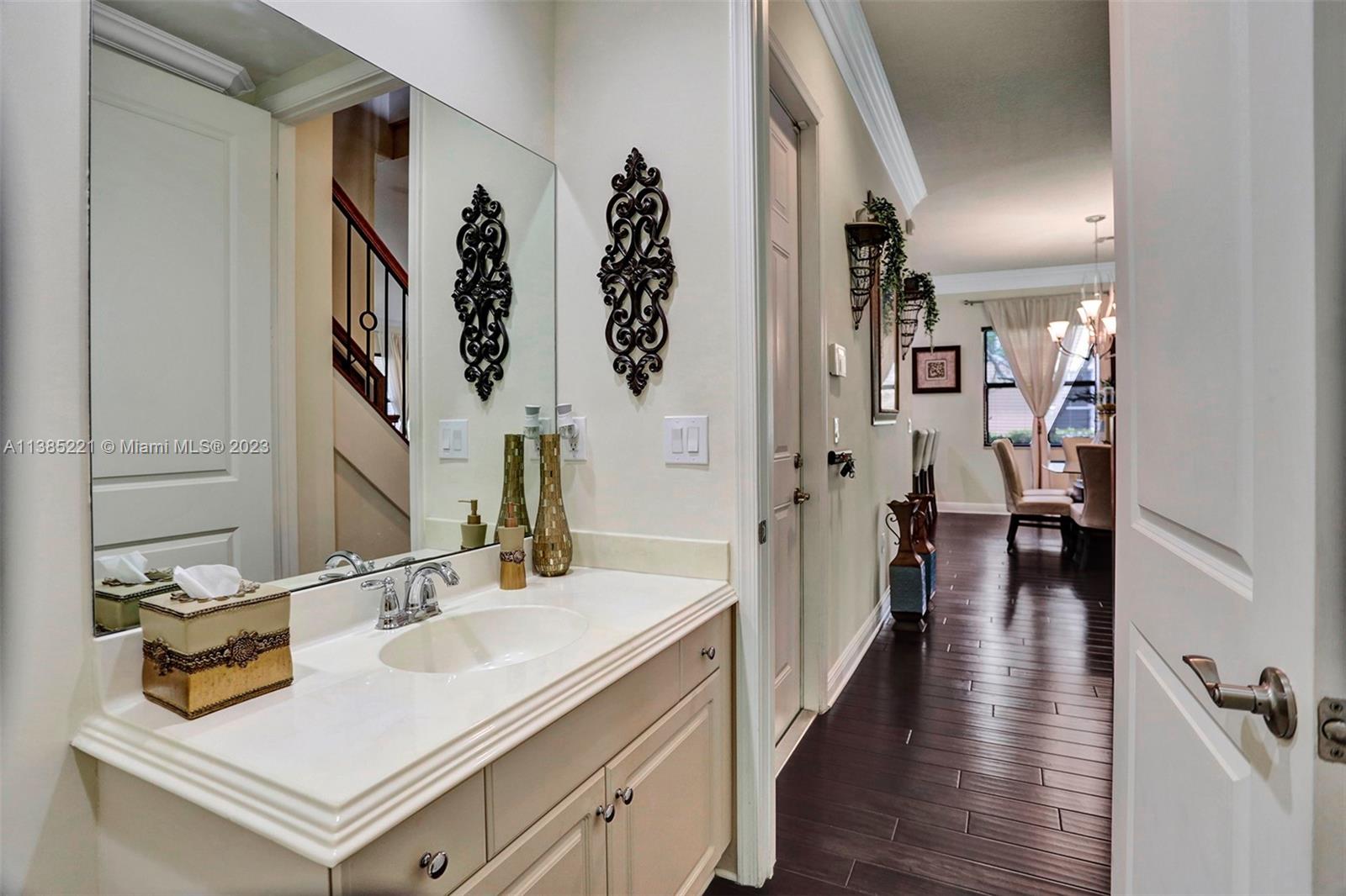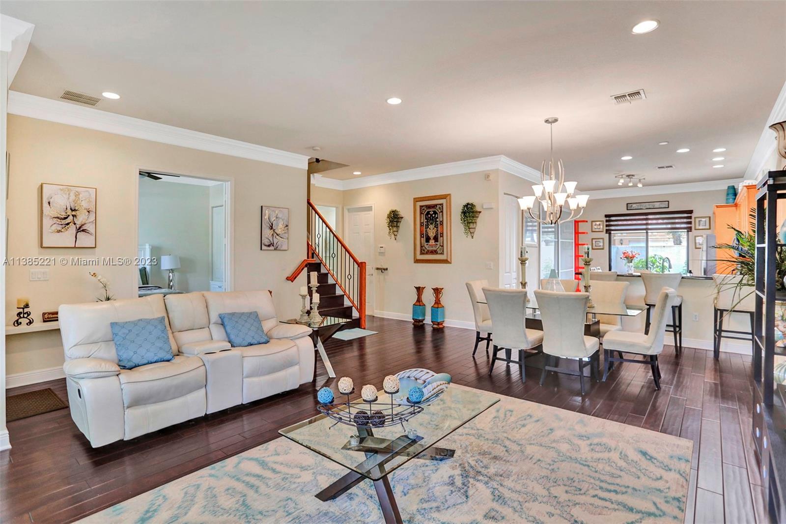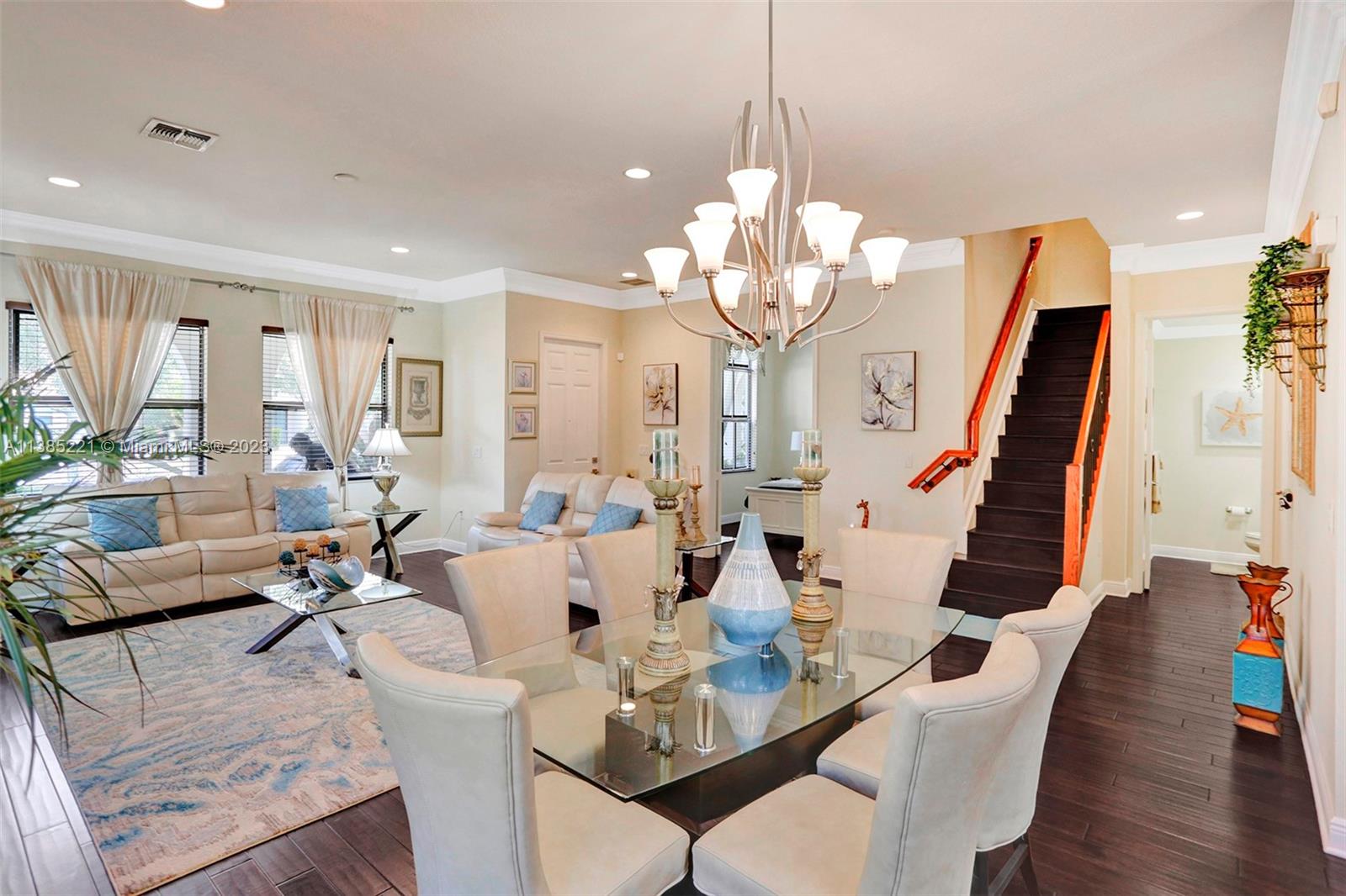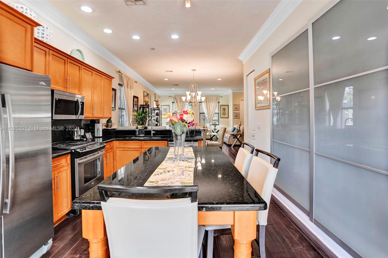 Wonderful Corner Home and Great Community with Resort Style amenities. Three bedrooms upstairs and one bedroom downstairs. Kitchen with island and gas stove and Granite Counter-Tops. Large pantry with sliding doors. Living Room and Dining Room are open to the Kitchen for large open area with plenty of natural light. Relaxing front porch, or enclosed back patio for grilling. Or relax outside of the MBR on the balcony. Separate Laundry Room upstairs. Artesia offers Resort Style Clubhouse, Billiard Room, Pool, Gym, Indoor Basketball Court, Tennis, Child Play Ground and More. Wood and Tile Floors throughout. Impact Windows for safety and security. 2 car garage. Artesia, a gated community with 24-hour Guard. Living Room Furniture is included except the large picture near the garage door.