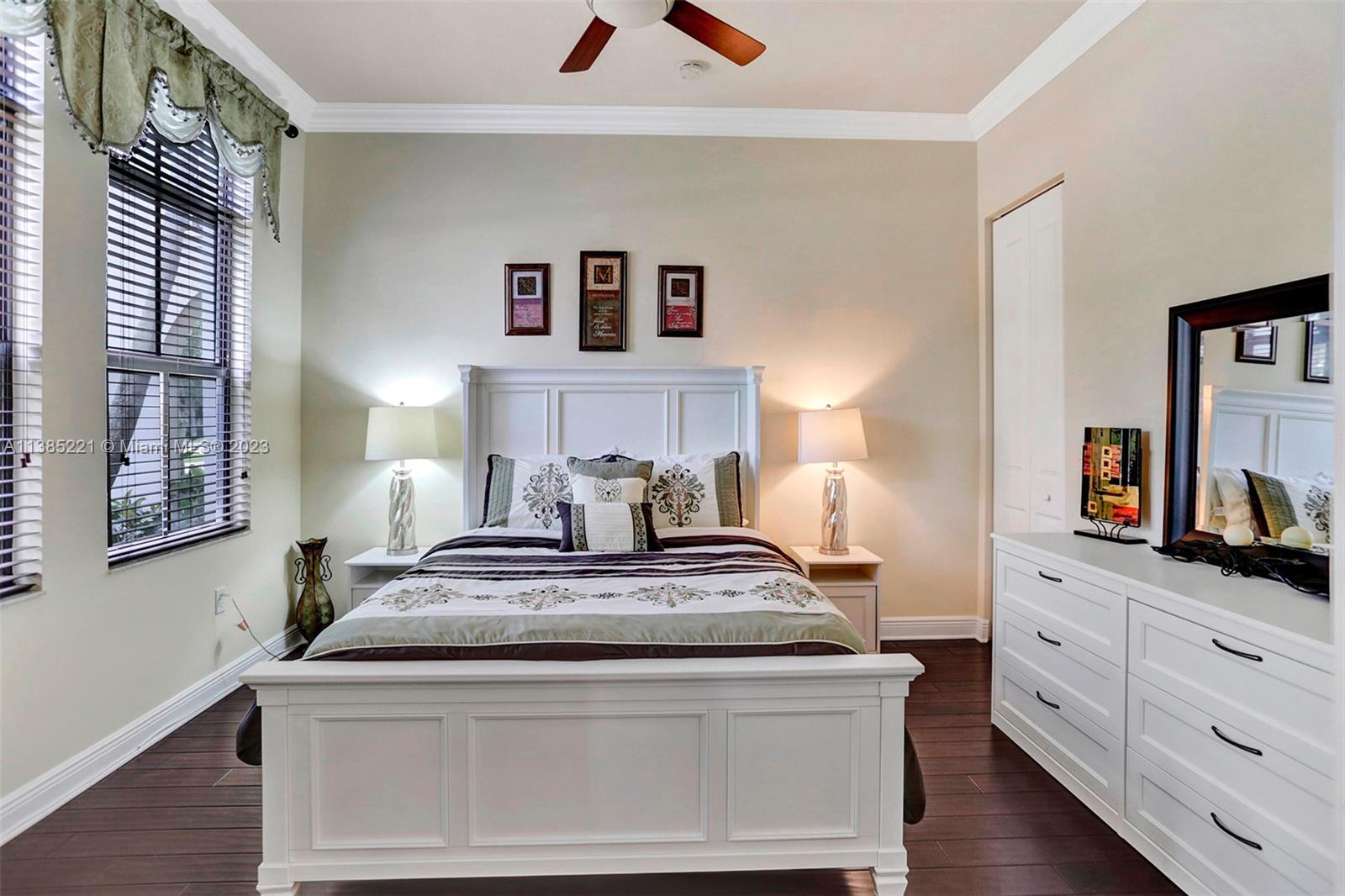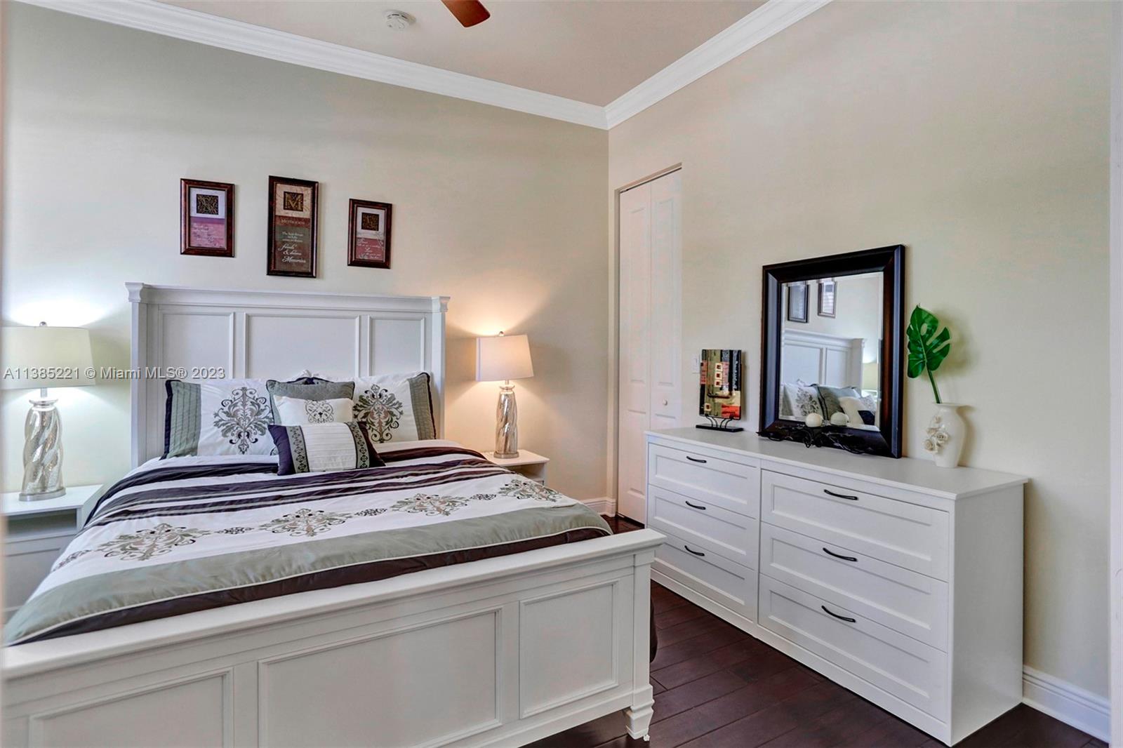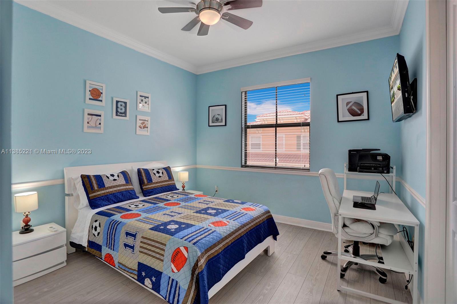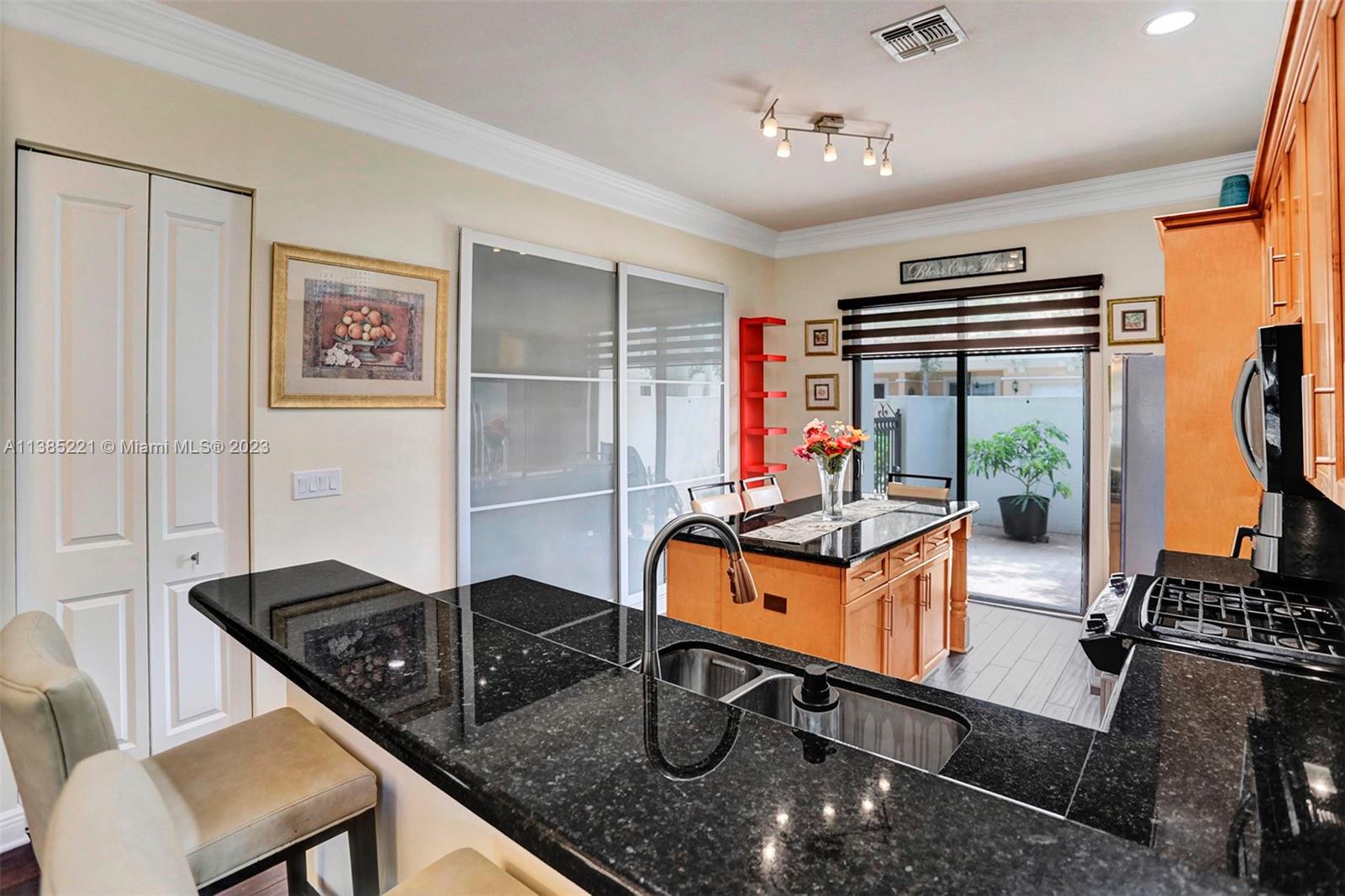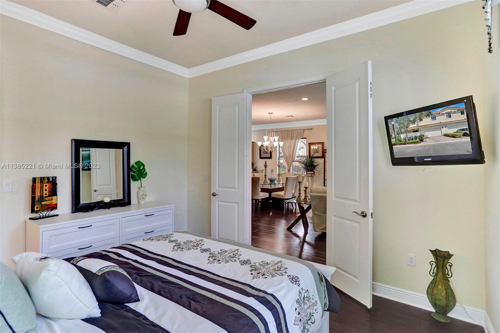 Wonderful Corner Home and Great Community with Resort Style amenities. Three bedrooms upstairs and one bedroom downstairs. Kitchen with island and gas stove and Granite Counter-Tops. Large pantry with sliding doors. Living Room and Dining Room are open to the Kitchen for large open area with plenty of natural light. Relaxing front porch, or enclosed back patio for grilling. Or relax outside of the MBR on the balcony. Separate Laundry Room upstairs. Artesia offers Resort Style Clubhouse, Billiard Room, Pool, Gym, Indoor Basketball Court, Tennis, Child Play Ground and More. Wood and Tile Floors throughout. Impact Windows for safety and security. 2 car garage. Artesia, a gated community with 24-hour Guard. Living Room Furniture is included except the large picture near the garage door.