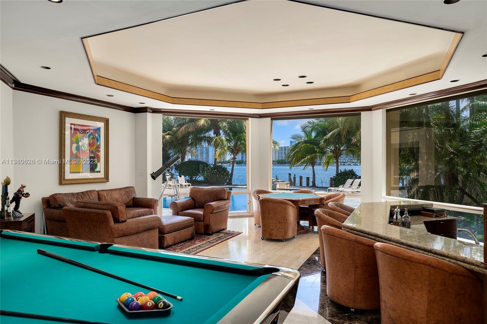Located on exclusive guard-gated Star Island this residence boasts a manicured 40,000 SF lot, and actual area of 12,374 SF, 6BR plus an office, 8+1BA, and 100FT of sparkling waterfront. Impressive foyer with soaring 30+FT ceilings and custom staircase, exquisite Travertine floors and custom millwork throughout, expansive living room and entertainment room/bar all with large windows and amazing views to the pool and bay. A private dining area, chef’s kitchen with top-of-the-line appliances and a separate breakfast room. The large bay-facing principal suite features dual walk-in closets and dual bathrooms. Upstairs has 4 large guest bedrooms with en-suite baths & oversized Plaza Deck terraces. Heated pool, summer kitchen, 40FT dock, direct bay & ocean access plus amazing central location.