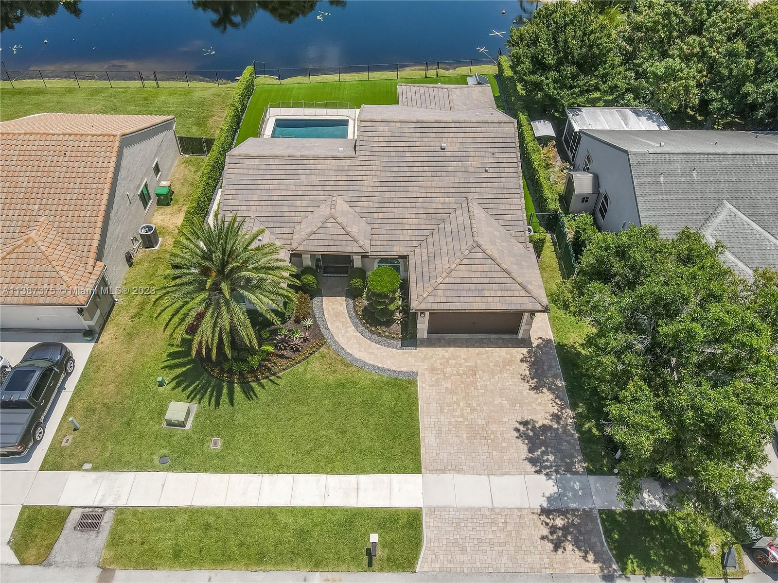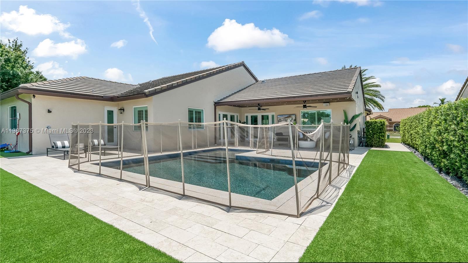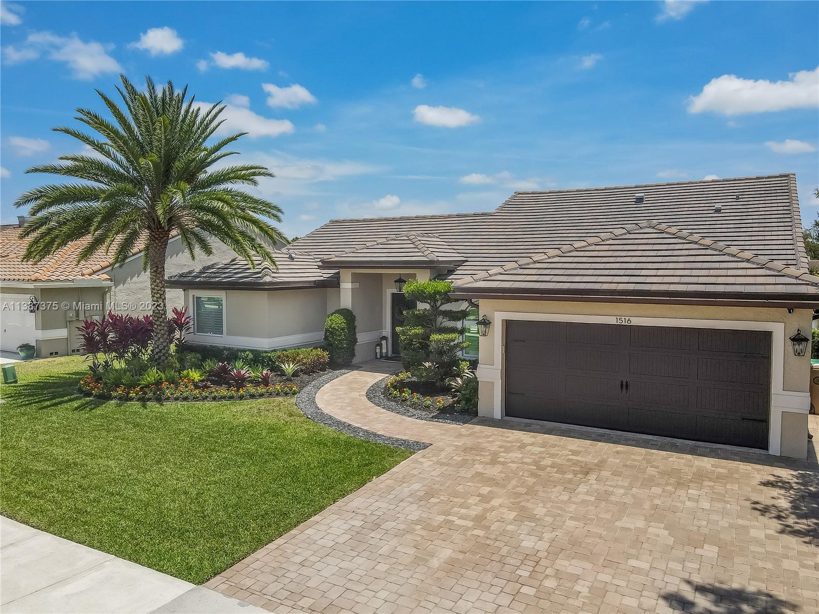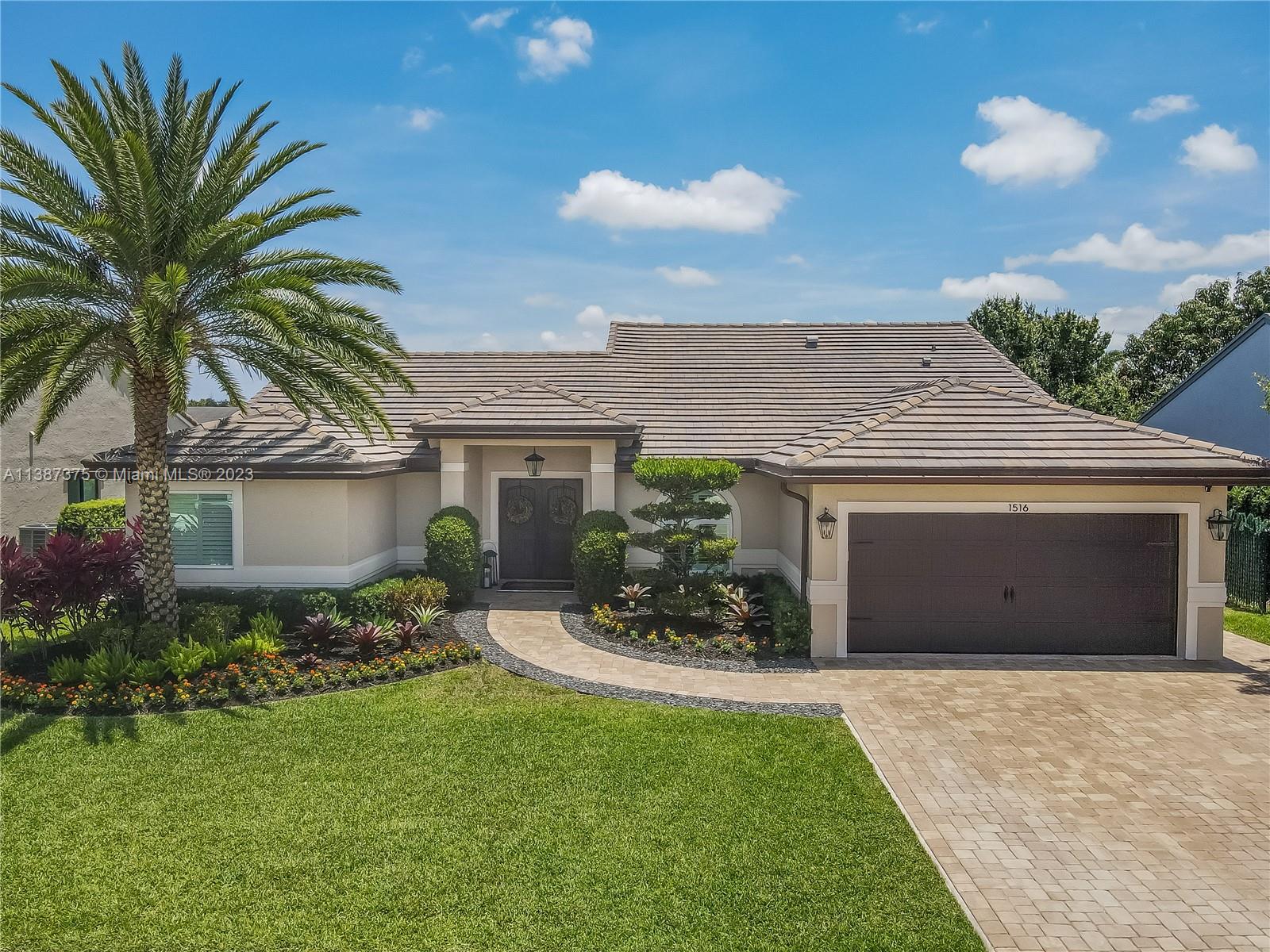 Marvelously Stylish and Upgraded Home with Heated Swimming Pool! Situated in a coveted community only ½ mile from excellent schools, this 4BR/3BA, 2,300+sqft property dazzles with lush tropical greenery and a custom paver driveway. Only updated by licensed contractors with appropriate permits, the interior features an open concept floorplan, plantation shutters, automatic blinds, and a gourmet kitchen with highly-rated GE Monogram appliances. Gather outdoors in the fenced-in and fully-turfed backyard, which has a heated PebbleTec pool with LED lights (controlled by app) and a covered lanai. Find tranquility in the primary bedroom with a California closet and chic en suite. Other features: insulated 2-car garage w/built-ins, newer roof (2018), near shops, and more! Call now for your tour!