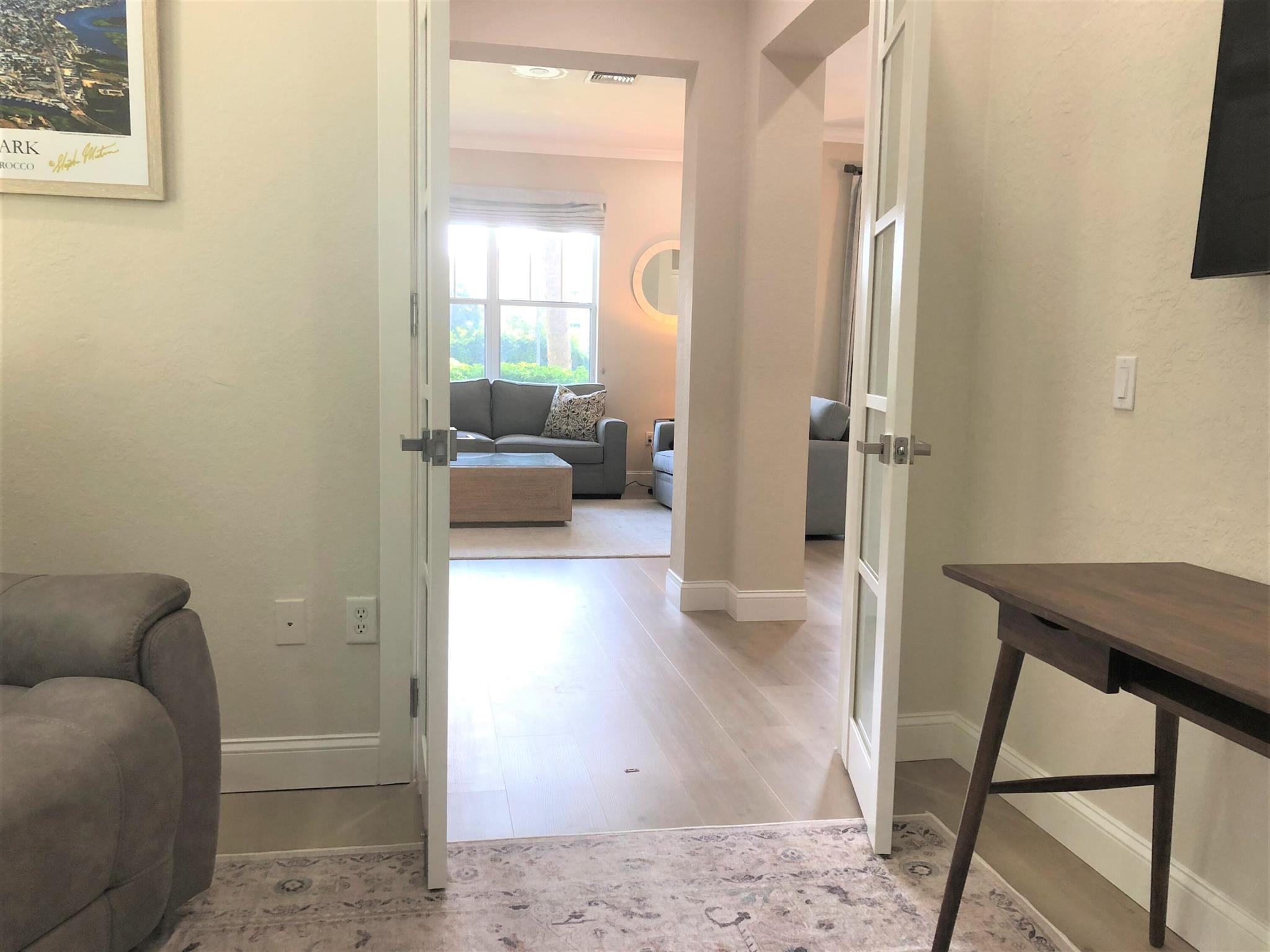 RARE!! Enjoy sunsets over the water from your patio in this ranch-style Santa Barbara lakeside model. Updated private corner unit. New floors & recessed lighting throughout. Kitchen features granite counters with GE Slate appliances, beautiful subway tile backsplash and 42'' cabinets. This tastefully appointed townhome is awash in natural light with soaring 10ft ceilings & inviting neutral tones to compliment. Primary suite features dual vanity sinks and spacious walk-in closet with plenty of shelving & storage. 3rd bedroom converted to den / office. Great location! A hidden gem only 5 minutes from downtown, I-95 & PBIA. Walking distance to the the new Outlet Shoppes, Whole Foods, Target and several restaurants. Community amenities include high speed wifi & cable service, water,