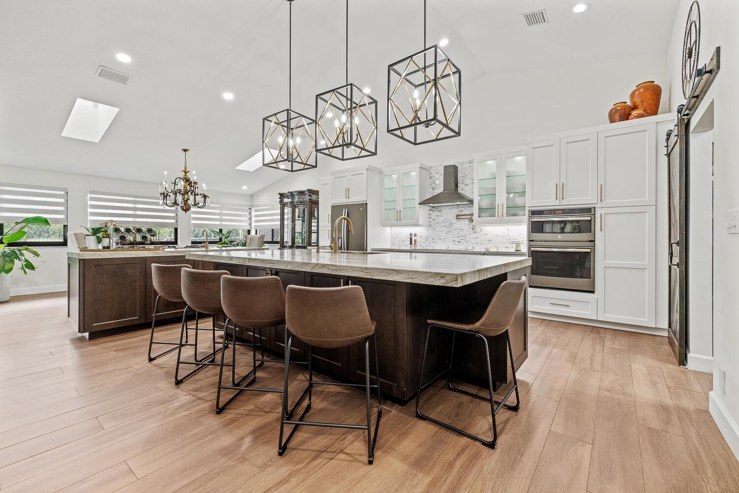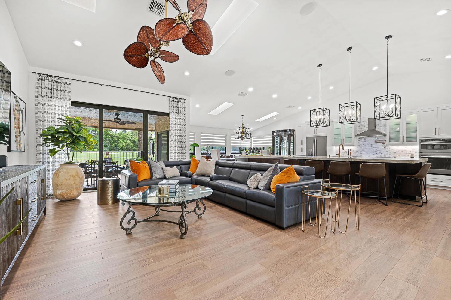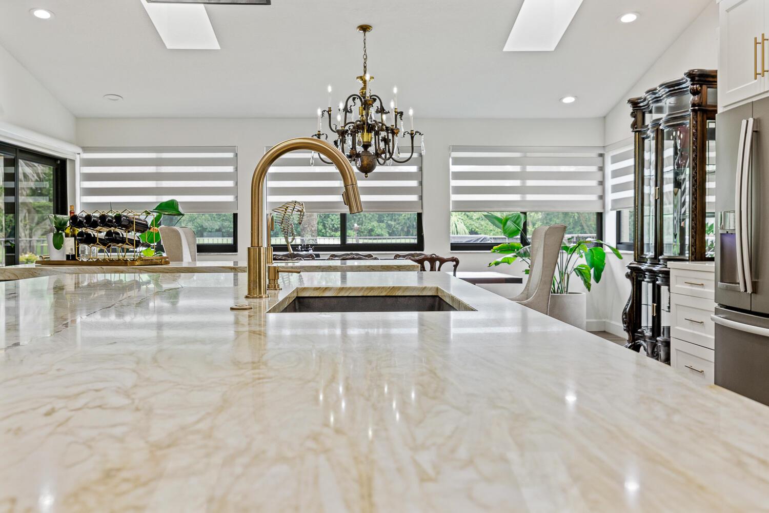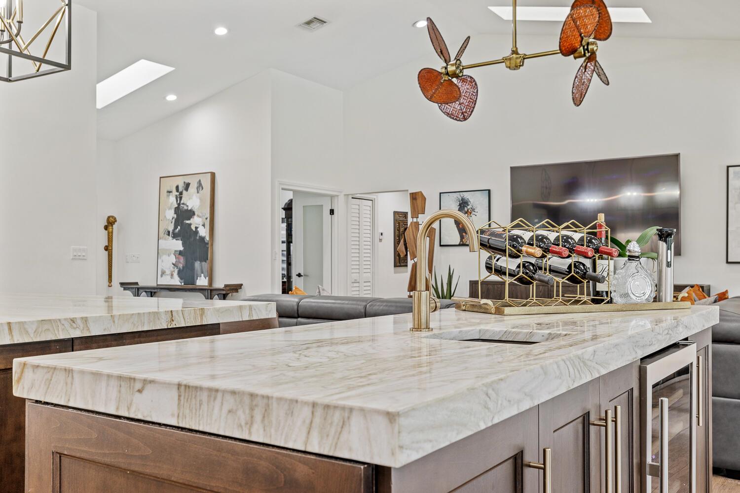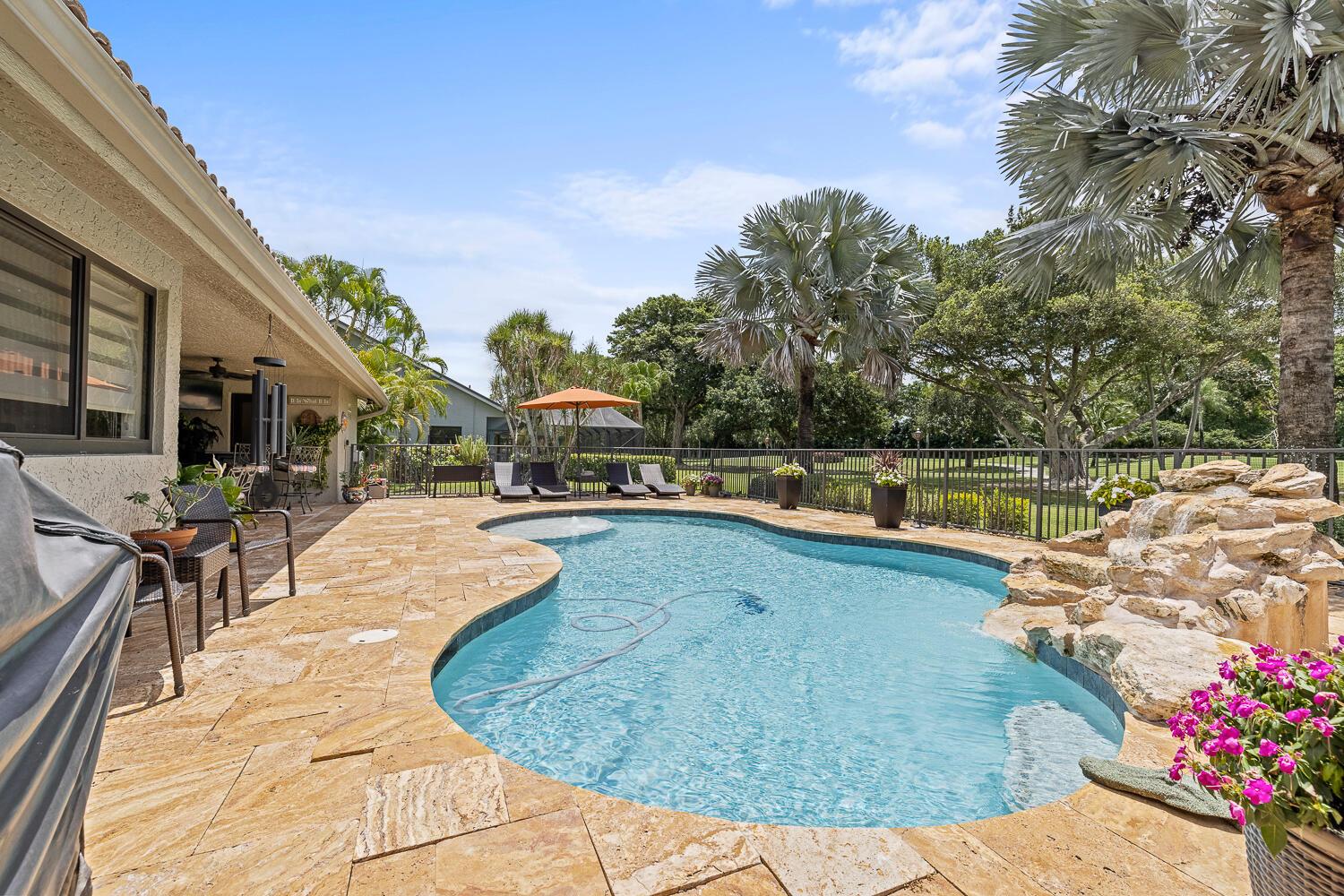 Price improvement! Welcome to Boca Woods Country Club - a hidden gemExceptional 3BR, 2.5 bath home, fully renovated, open concept floor plan with upgrades throughout. Over $250k in renovations including a chef's kitchen featuring quartzite countertops, custom cabinetry, and GE Profile appliances, complemented by a large main kitchen island and wet bar island.Featuring volume ceilings and skylights, and abundant natural light. This home is equipped with 2 zone AC, central vac, and hurricane impact windows and doors. Immaculately clean throughout.Backyard with a golf course view from the 15th hole. Rock waterfall pool and southern exposure.