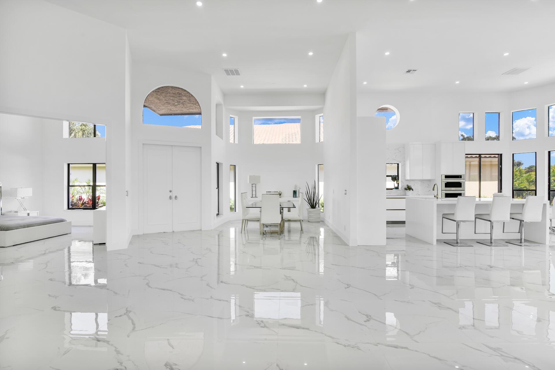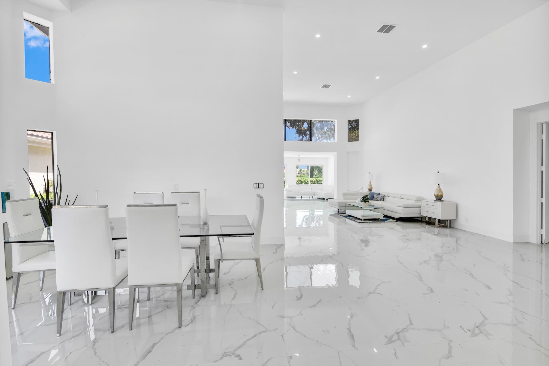 Crisp and clean, this fully renovated single-story home awaits! Upon entering, you are immediately impressed with the voluminous ceilings and sun-filled rooms. The modern design is light and bright. The expanded, open-concept living room showcases beautiful vistas of the golf course in the distance. The chef's kitchen features a gorgeous double waterfall edge island and also shares the same stunning views while connecting effortlessly to the informal dining area. The formal dining room is great for entertaining and is directly incorporated into the open concept layout. The generous sized primary suite provides a quaint sitting area or office, immense closet space, and features two, separate full bathrooms. Two additional bedrooms share direct access to an en-suite bathroom. A den or fourth