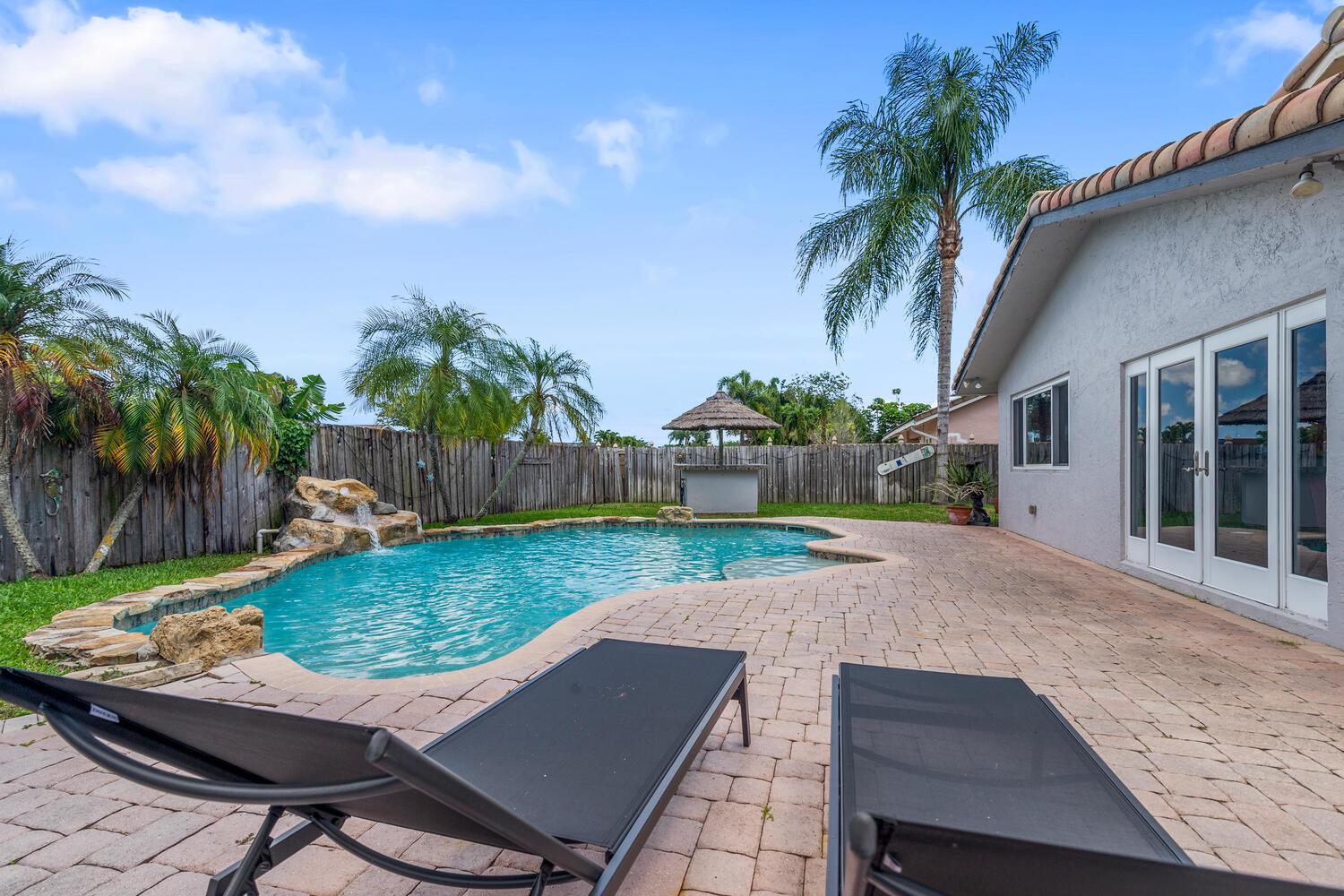 This is an entertainers dream home! This home offers a sensible flow through floorplan. The vaulted ceilings enhance an open and bright living area with stylish wood flooring & a cozy fireplace. The updated and spacious kitchen features s/s appliances, granite countertops, a breakfast bar & plenty of cabinet & storage space. The home has beautiful detailing throughout from the gorgeous floors to the crown molding and everything in between! The main bedroom is large and has a huge walk in closet. The main bath is very contemporary and stylish. Next we go outside and wowzer this gorgeous from the free form pool to the BBQ area to the tiki hut and large fenced in yard! The home has impact windows and doors. Centrally located and close to A rated schools. Come quick don't miss this beauty