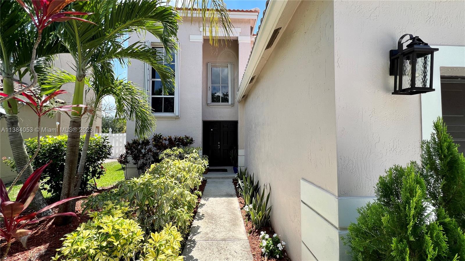 Beautifully updated home at The Falls with oversize fenced yard, featuring a ground level bedroom & ensuite bath, updated kitchen with quartz counters, updated bathrooms, modern lighting, spacious back yard, accordion shutters and new garage & front doors, updated water heater, situated in gated community with pool, sports courts and playground. Perfectly located near schools, shopping and highways.