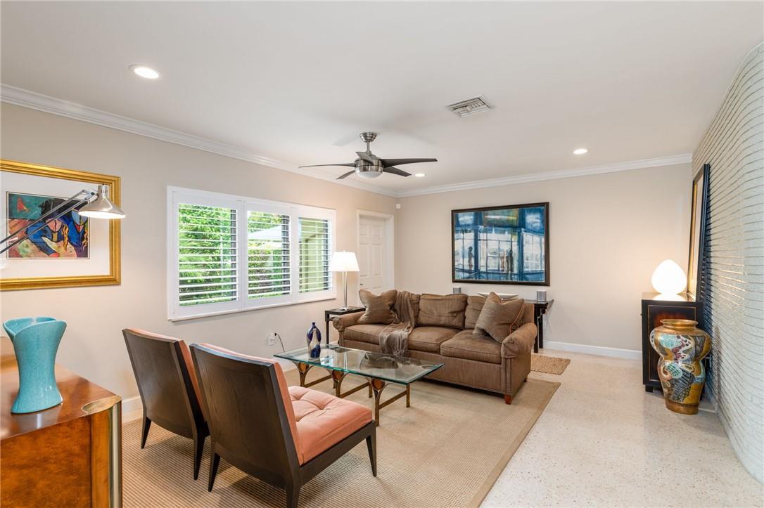 Welcome to this UPDATED Victoria Park classic with pleasant mid-century style. Ensuite primary & second bedroom & bedroom/office share a second bath. Lovely sunroom with built-ins & wide views of the uncommonly large salt water heated pool & ample serene yard space. Meticulously restored terrazzo floors compliment the mid-century look & feel. A must see with many improvements such as fresh paint inside & out, custom window treatments & IMPACT throughout including garage door. Step out of your sunroom & enjoy a fully fenced private yard with gorgeous shade fruit tree, brick surround with ample patio area perfect for parties. Perfect night scene with new low volt lighting front and back. The location is a great spot within easy reach of Las Olas, coffee shops, restaurants, airport & train.