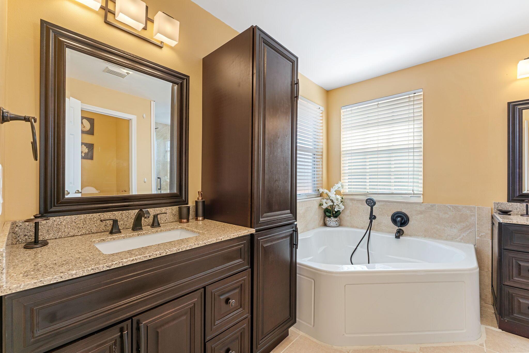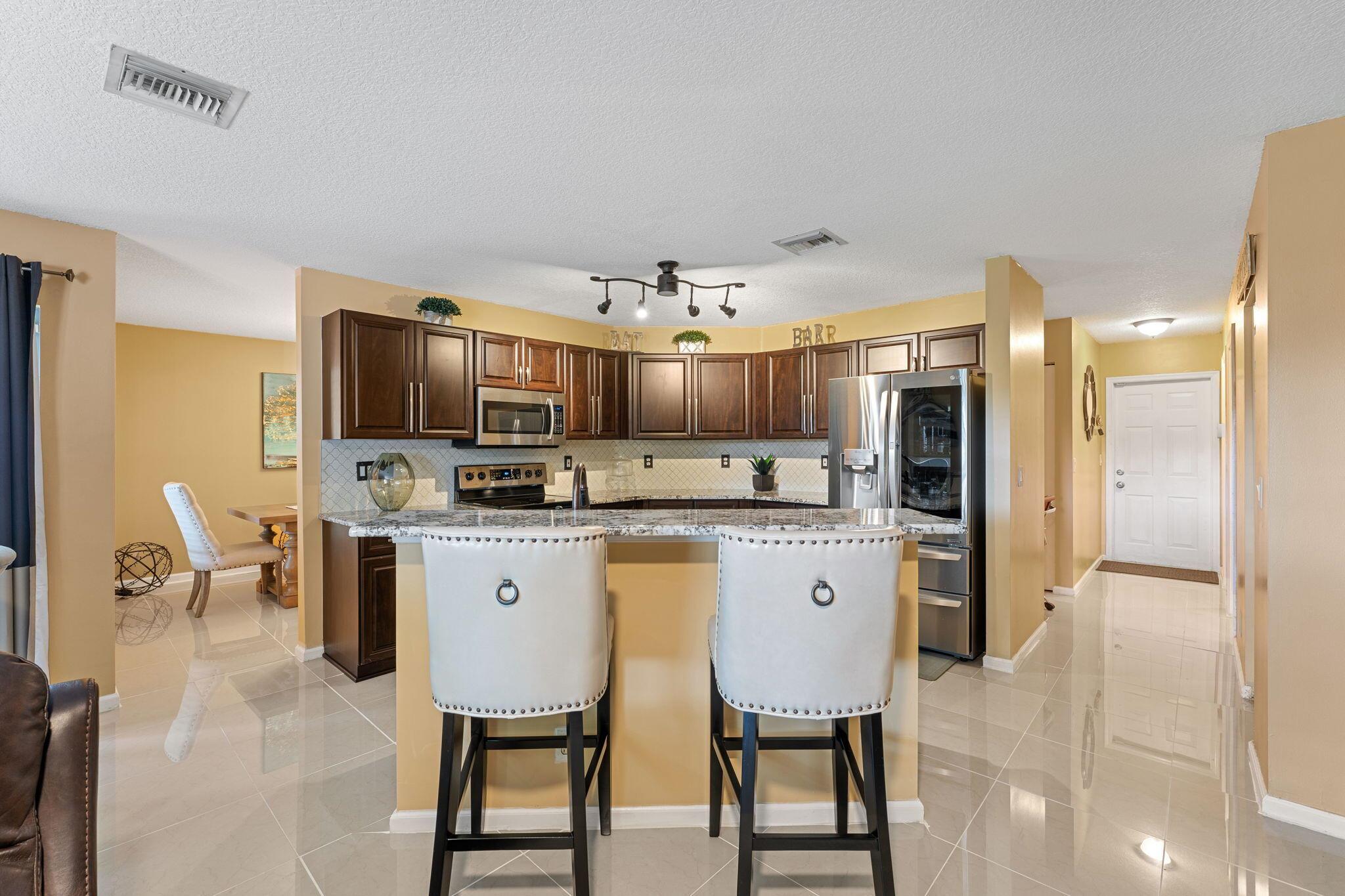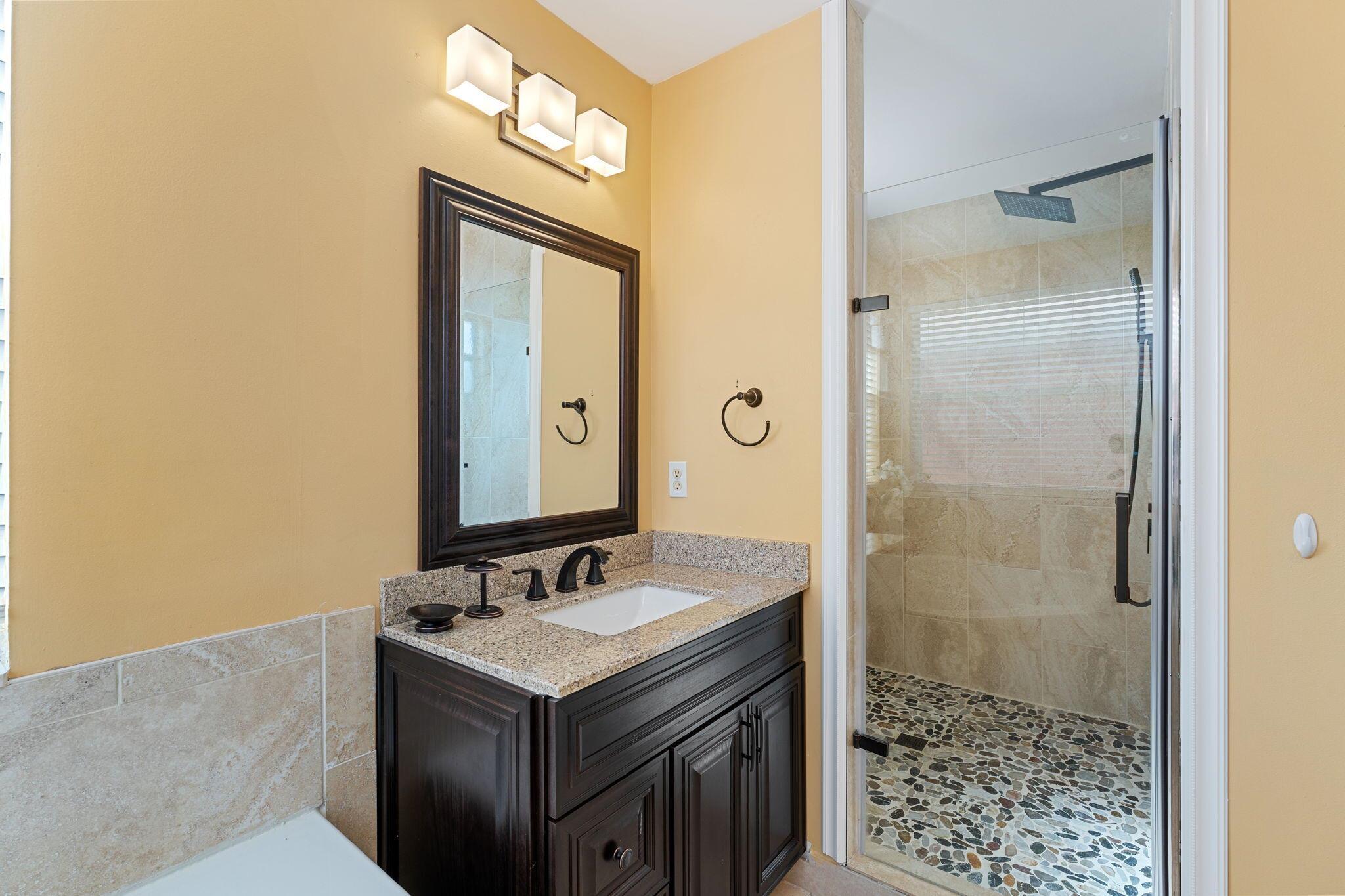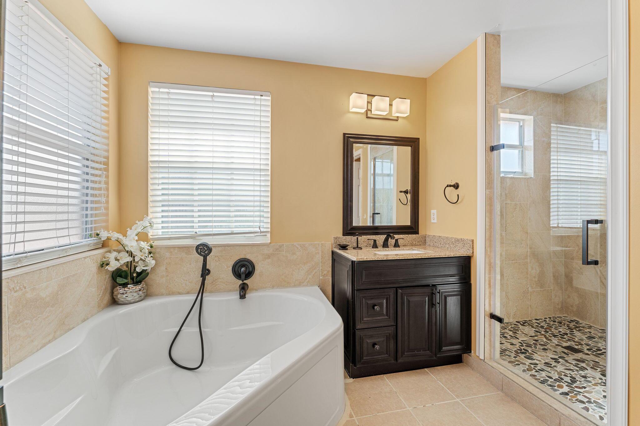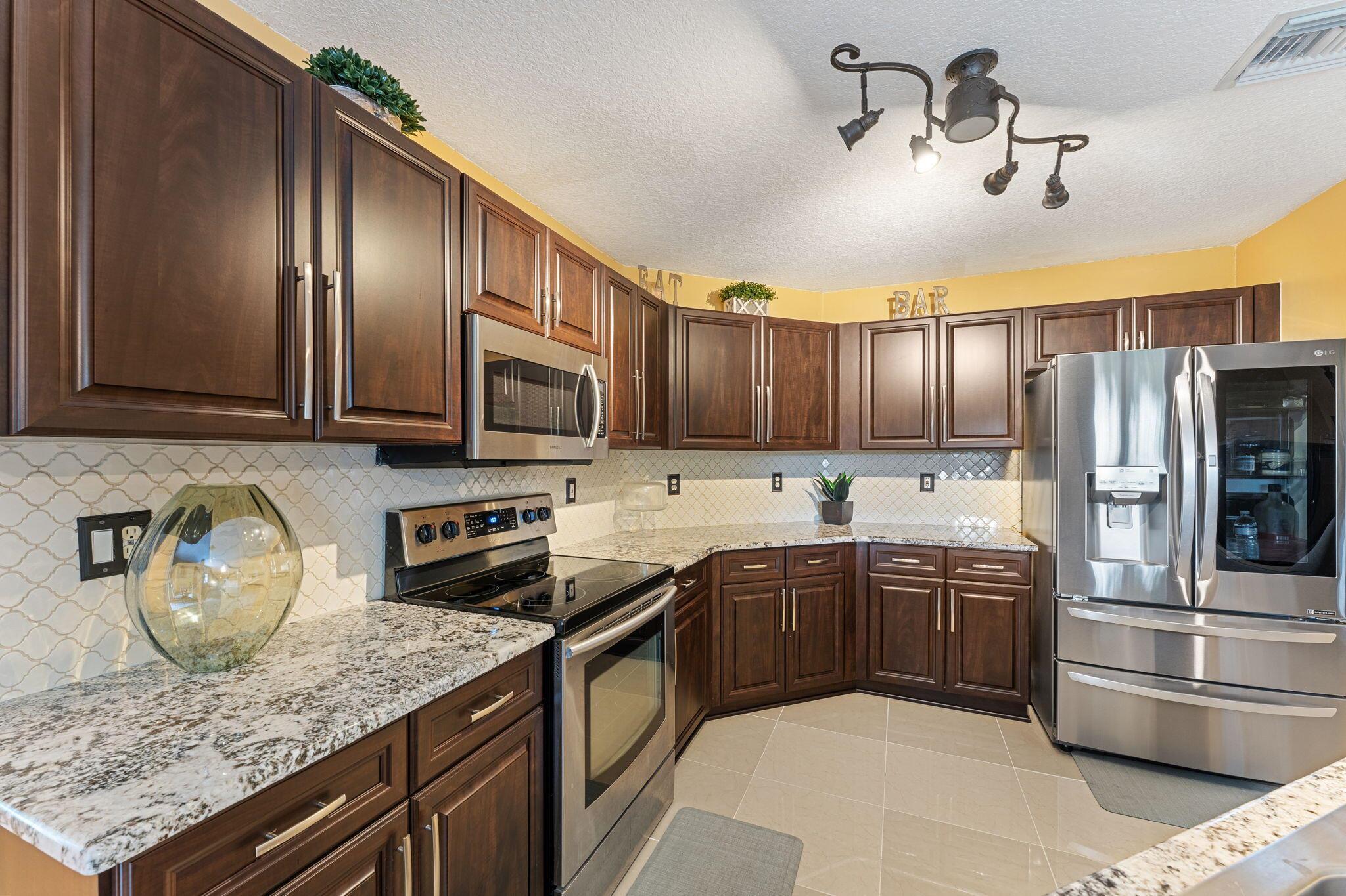 Experience the epitome of luxury living in this breathtaking single-family home within a prestigious gated community. Recently renovated, this gem features 3 beds, 2 baths, and a 2-car garage. The updated kitchen dazzles with granite counters and gleaming stainless steel appliances. Marvel at the grandeur of large tile floors on the first floor and stylish laminated floors adorning the stairs and upstairs bedrooms. Prepare to be captivated by the allure of expensive light fixtures throughout. The guest bathroom boasts a chic modern renovation, while the master bathroom is a masterpiece of opulence, showcasing a sleek glass shower, double sinks, and a lavish jacuzzi tub. Step outside to an extended patio, where a sprawling fenced yard awaits, offering the perfect setting for endless
