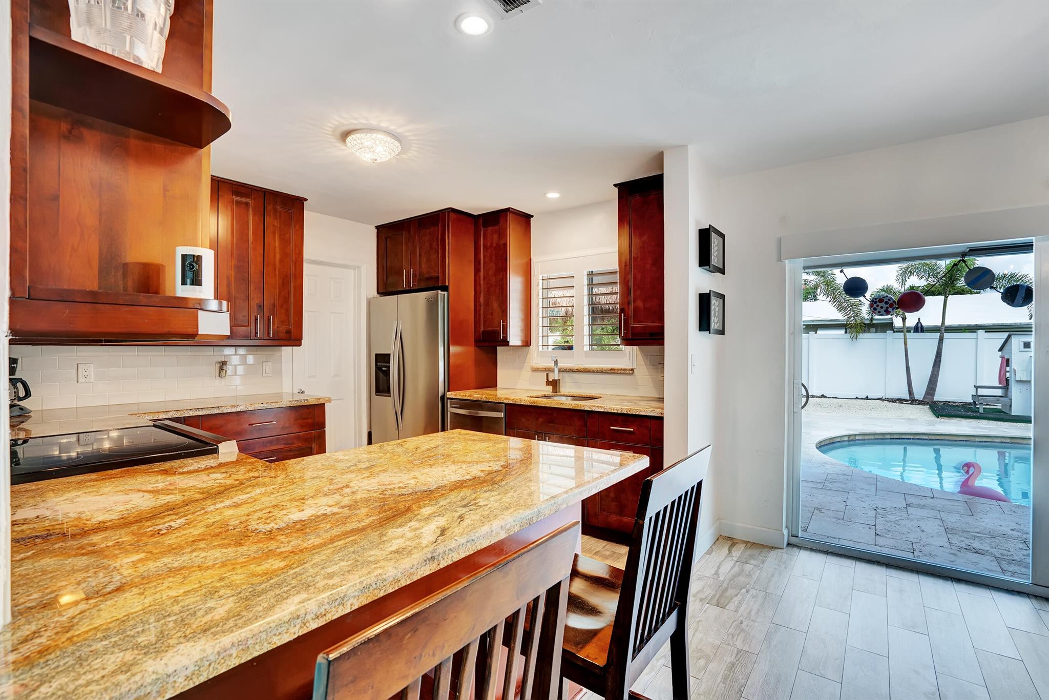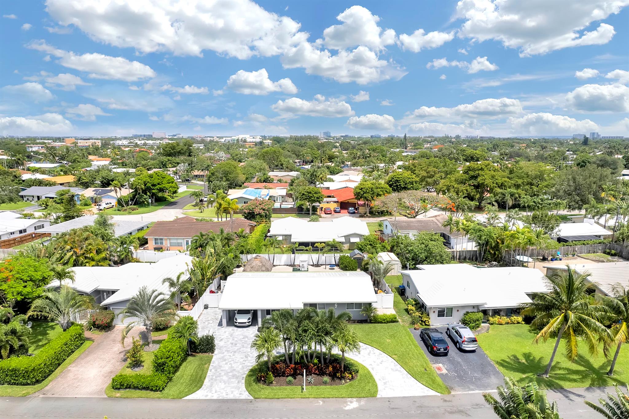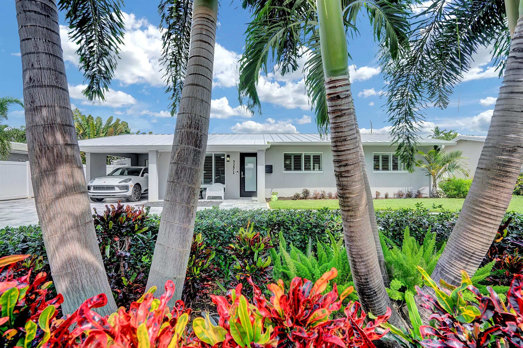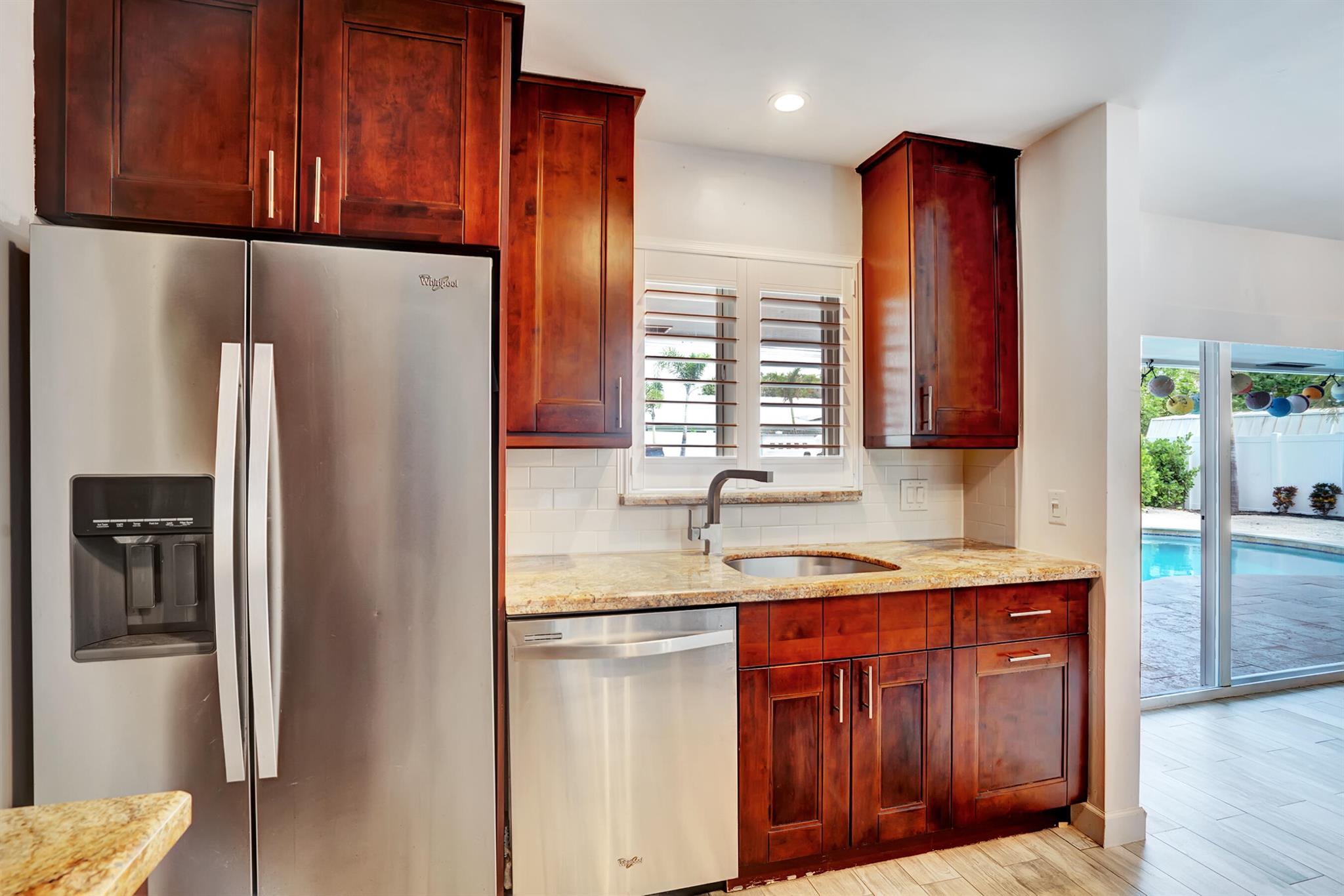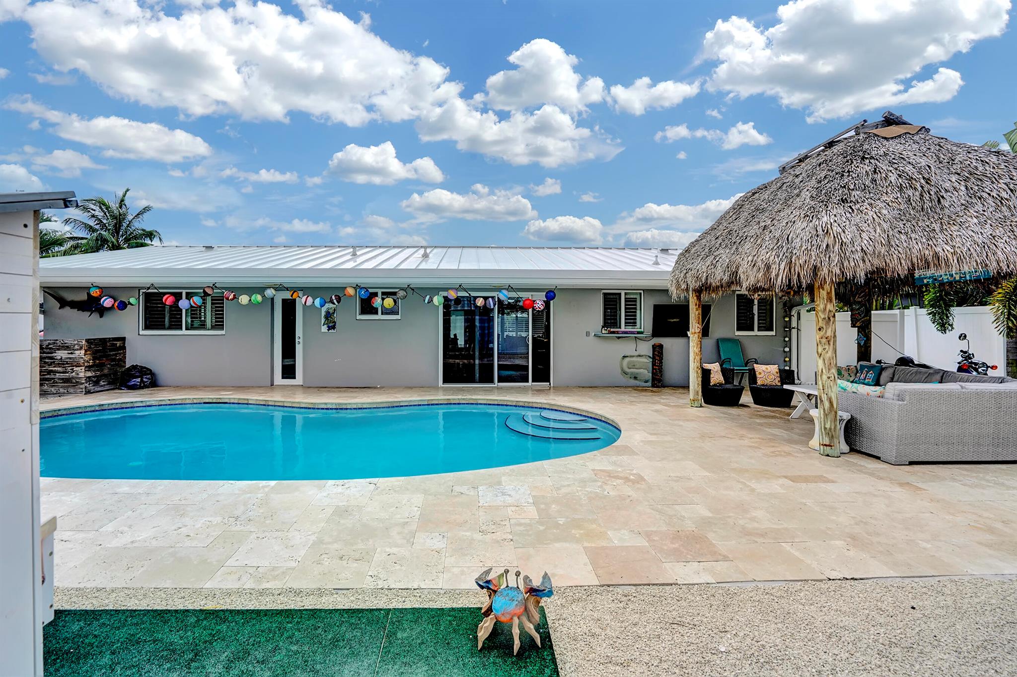 Modern 3/2 Coral Ridge Isles home with lush landscaping welcomes you into its bright, open floor-plan and secluded, resort-style backyard, perfect for entertaining in the sun year-round. Relax by the salt water pool, newer travertine pool deck & Tiki Hut (2018). Aluminum roof (2021) & contemporary impact windows/doors offer security; privacy with custom plantation shutters. Renovated kitchen invites with warm cabinetry, stainless appliances & granite countertops - with easy access for poolside celebrations & grilling. The master bedroom and updated cabana bath provide the welcome solitude you seek. Cheerful, Florida-style second bath and larger bedrooms. Spacious interior laundry room. Upgrades include circular paved drive (2022) with side parking and room for a boat, Ring doorbell