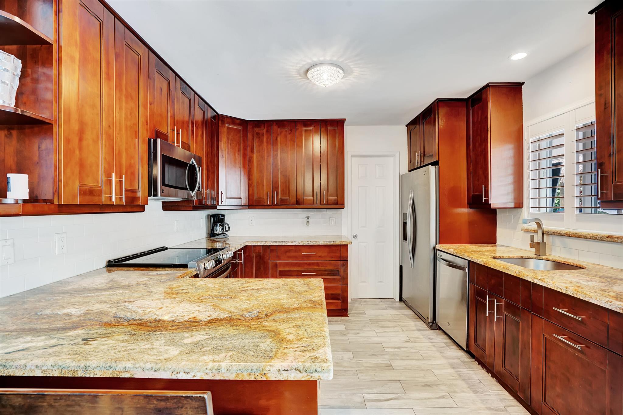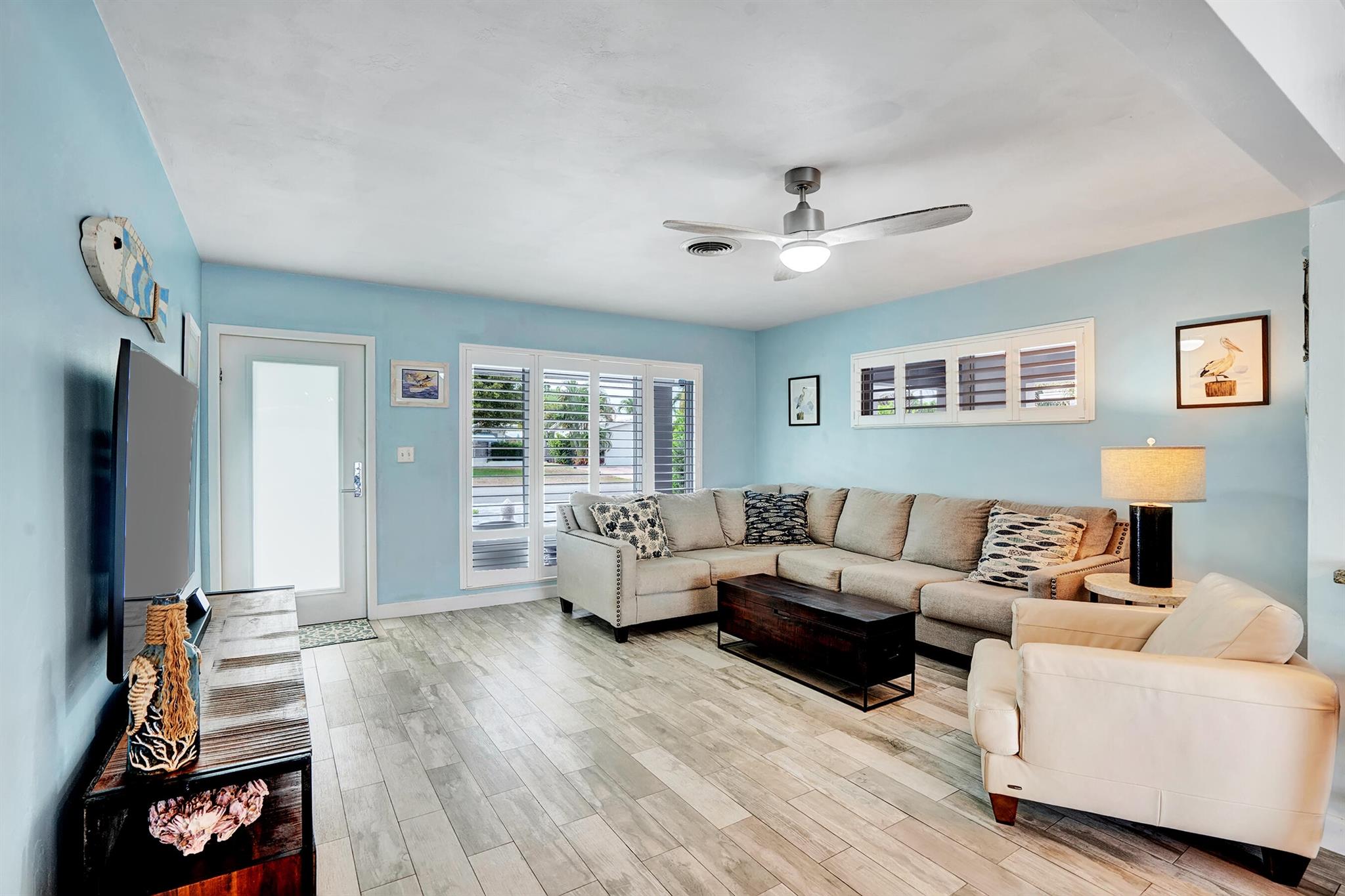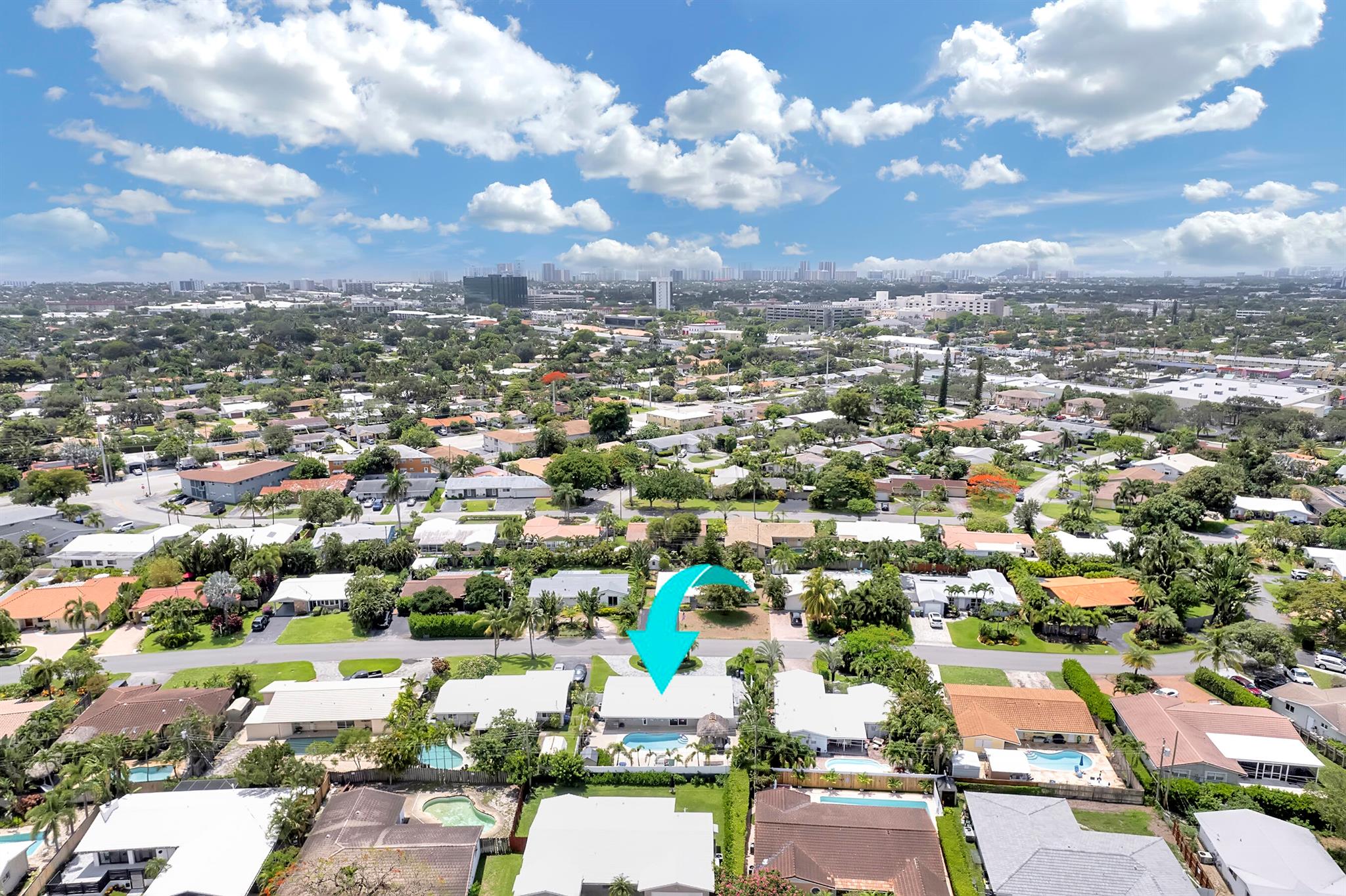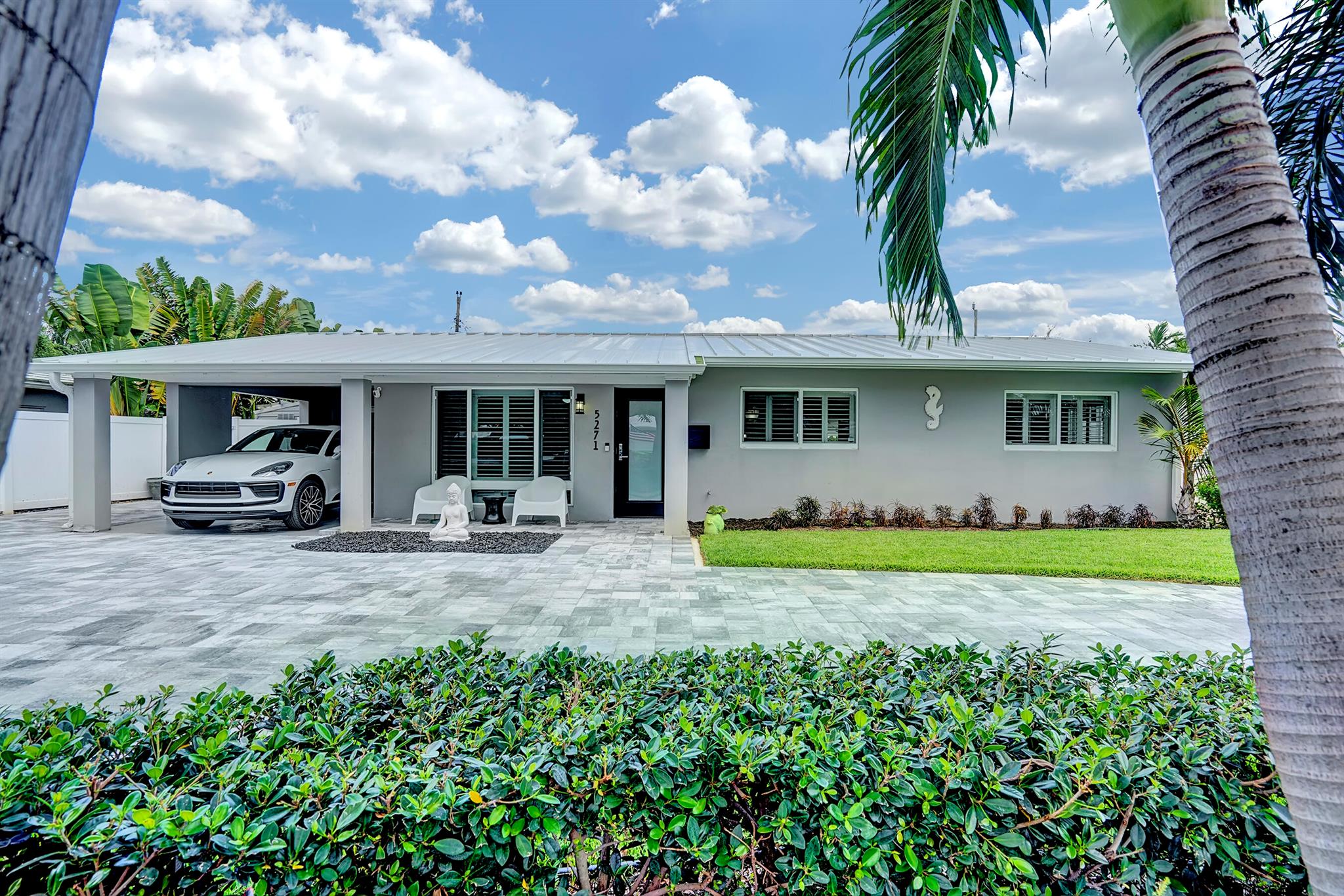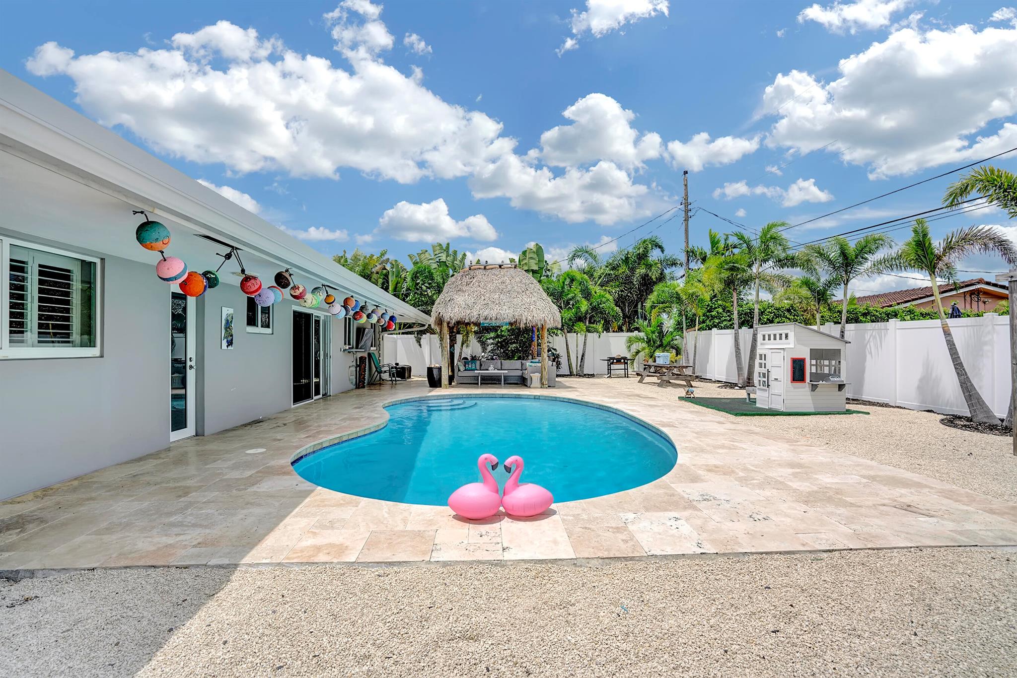 Modern 3/2 Coral Ridge Isles home with lush landscaping welcomes you into its bright, open floor-plan and secluded, resort-style backyard, perfect for entertaining in the sun year-round. Relax by the salt water pool, newer travertine pool deck & Tiki Hut (2018). Aluminum roof (2021) & contemporary impact windows/doors offer security; privacy with custom plantation shutters. Renovated kitchen invites with warm cabinetry, stainless appliances & granite countertops - with easy access for poolside celebrations & grilling. The master bedroom and updated cabana bath provide the welcome solitude you seek. Cheerful, Florida-style second bath and larger bedrooms. Spacious interior laundry room. Upgrades include circular paved drive (2022) with side parking and room for a boat, Ring doorbell