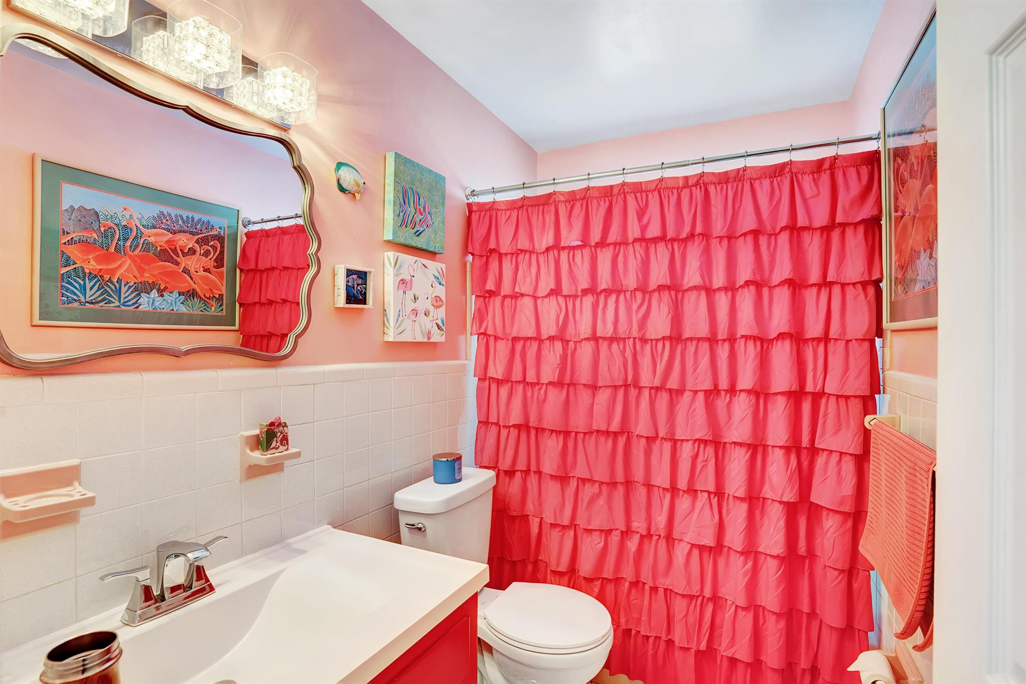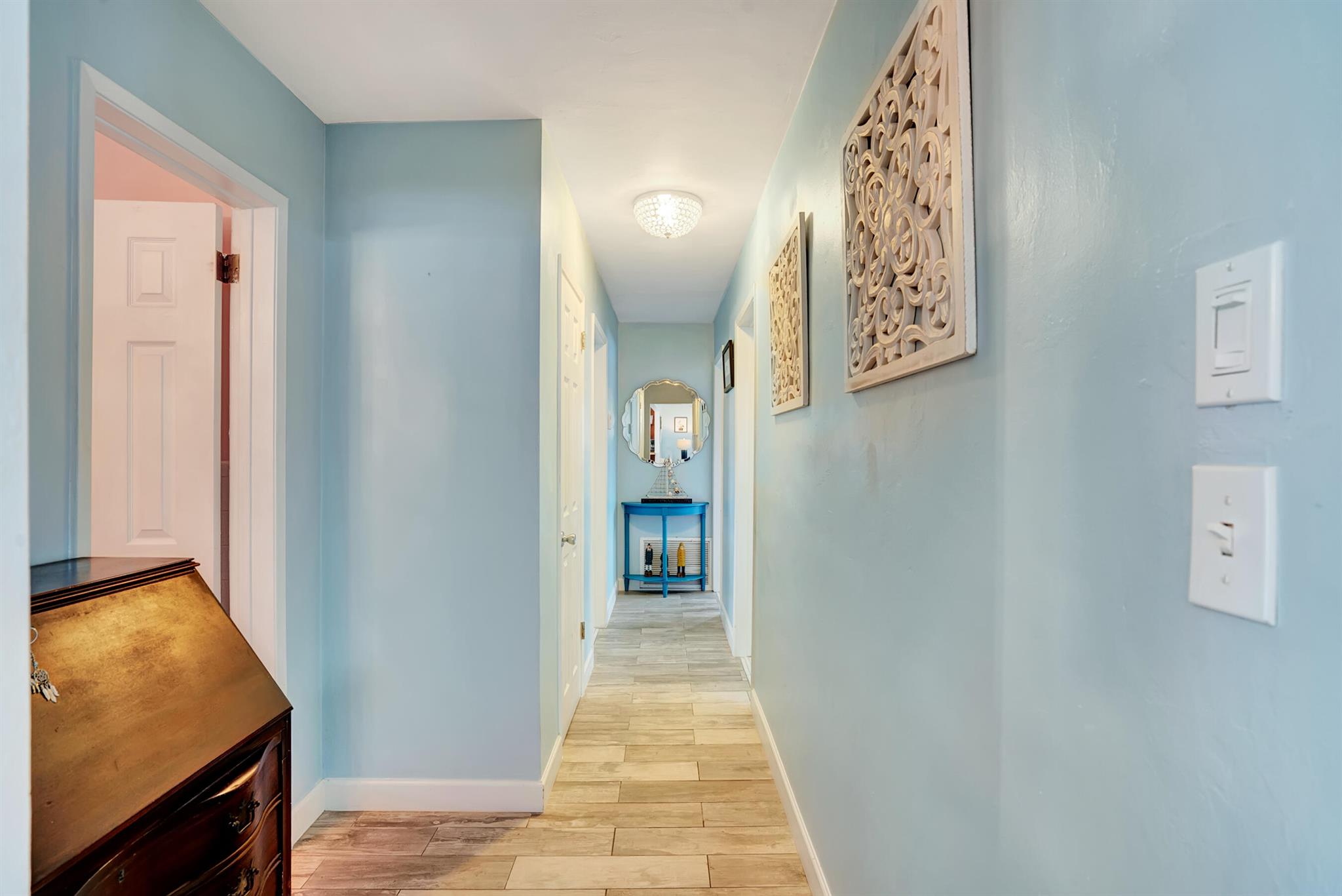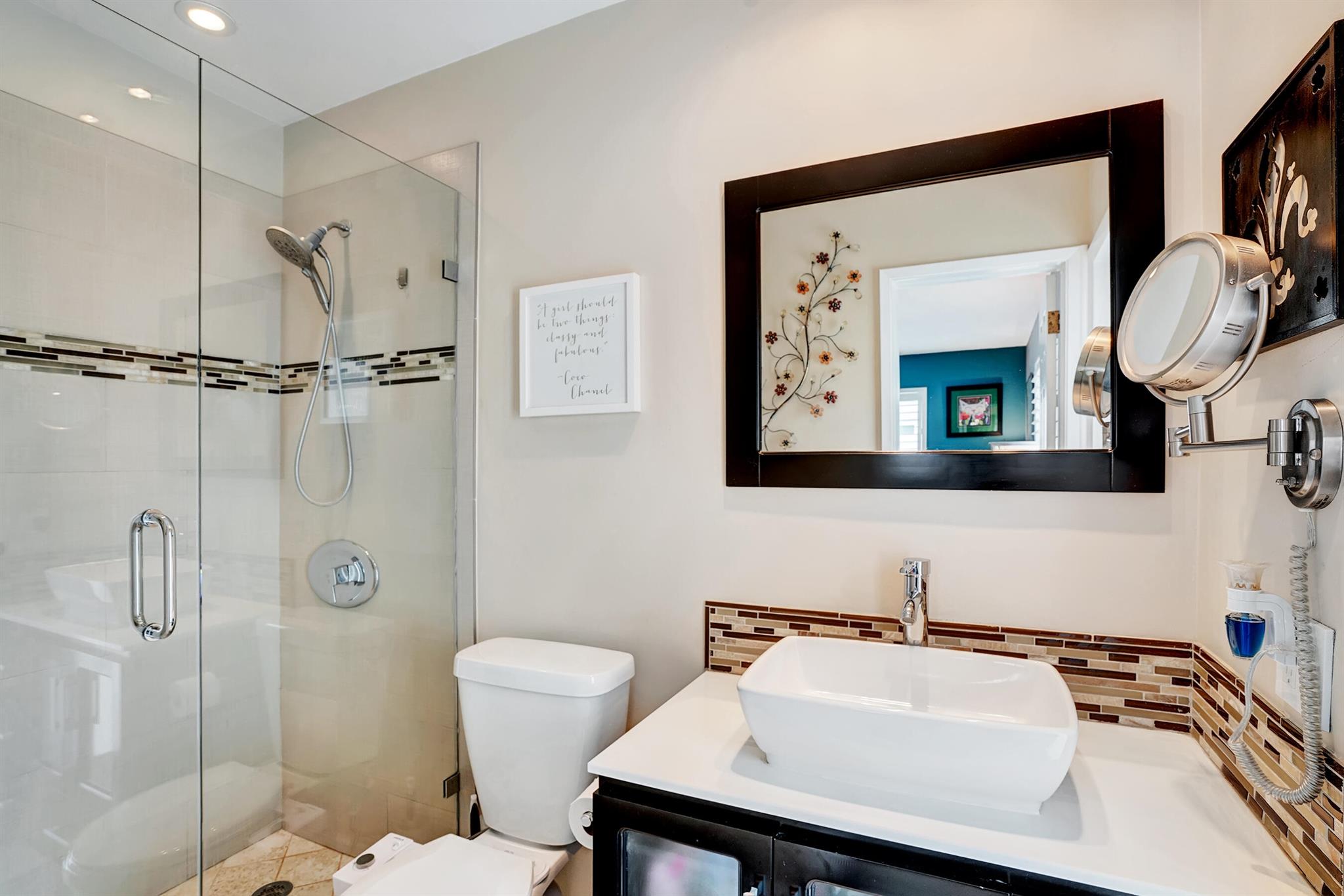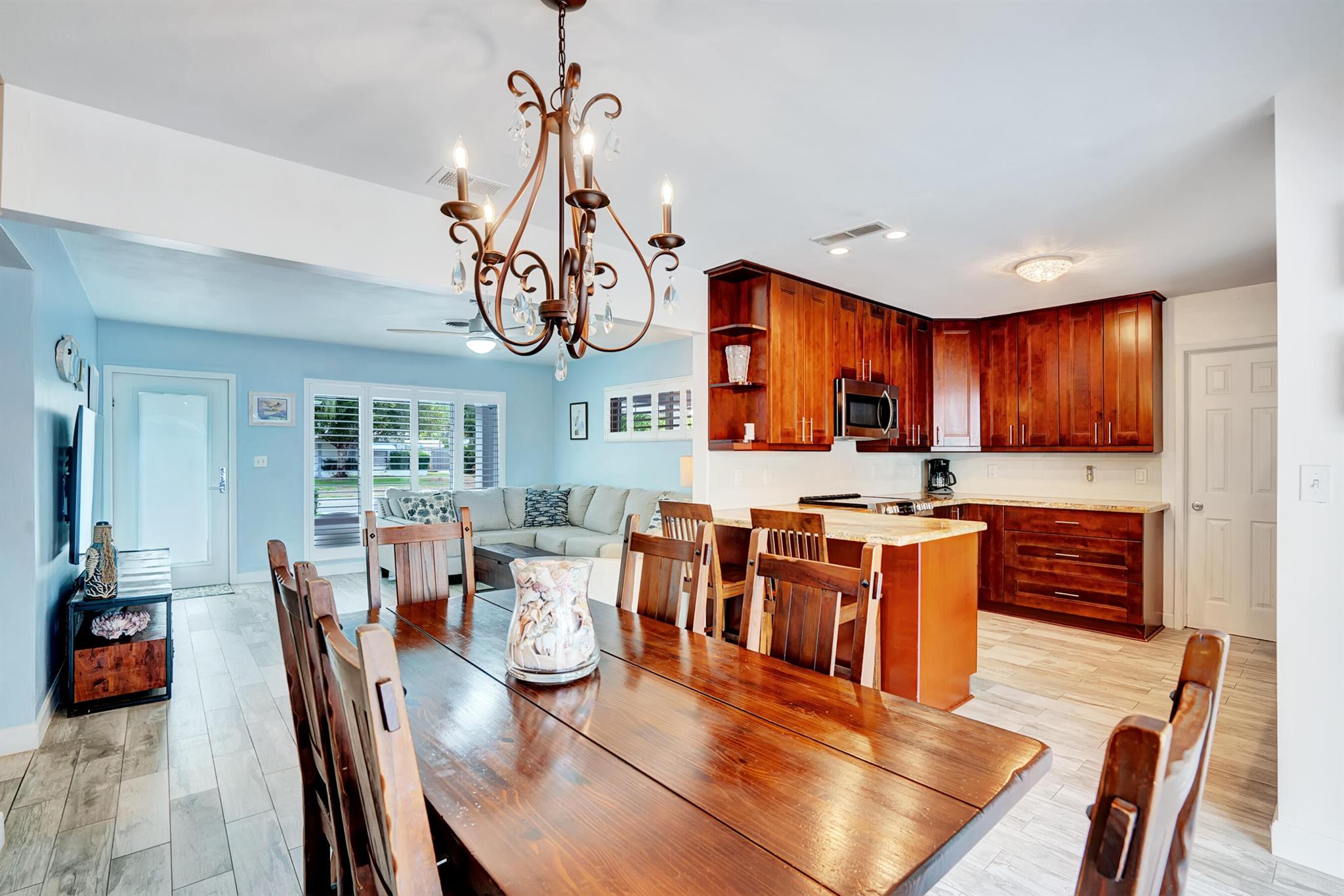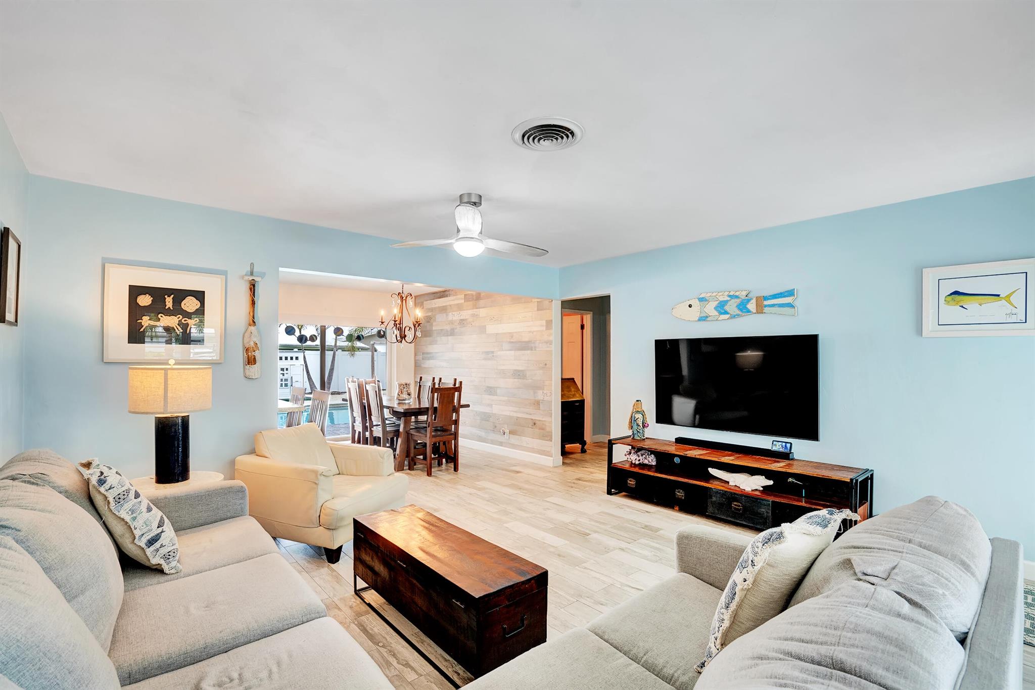 Modern 3/2 Coral Ridge Isles home with lush landscaping welcomes you into its bright, open floor-plan and secluded, resort-style backyard, perfect for entertaining in the sun year-round. Relax by the salt water pool, newer travertine pool deck & Tiki Hut (2018). Aluminum roof (2021) & contemporary impact windows/doors offer security; privacy with custom plantation shutters. Renovated kitchen invites with warm cabinetry, stainless appliances & granite countertops - with easy access for poolside celebrations & grilling. The master bedroom and updated cabana bath provide the welcome solitude you seek. Cheerful, Florida-style second bath and larger bedrooms. Spacious interior laundry room. Upgrades include circular paved drive (2022) with side parking and room for a boat, Ring doorbell